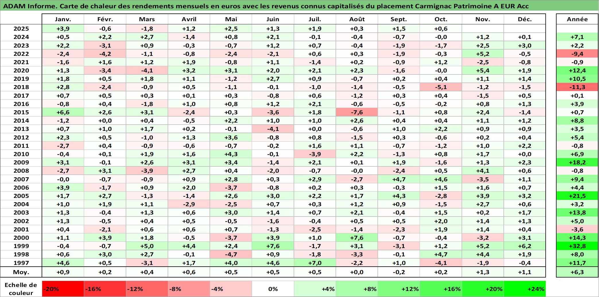 Site dédié aux investisseursPage dédiée sur site financeAnalyse des valorisations hebdomadaires du fonds Carmignac Patrimoine A EUR Acc. Cet actif est cote en EUR. Les valorisations couvrent les semaines 1997W01 a 2025W40. Les revenus de cet actif financier sont pris en compte depuis la semaine 1997W01. La note globale ESG de cet actif est estimee a 8.0 (apres rebasage entre 0 et 20).