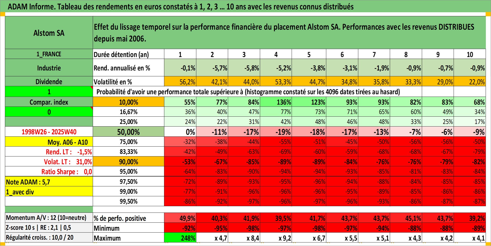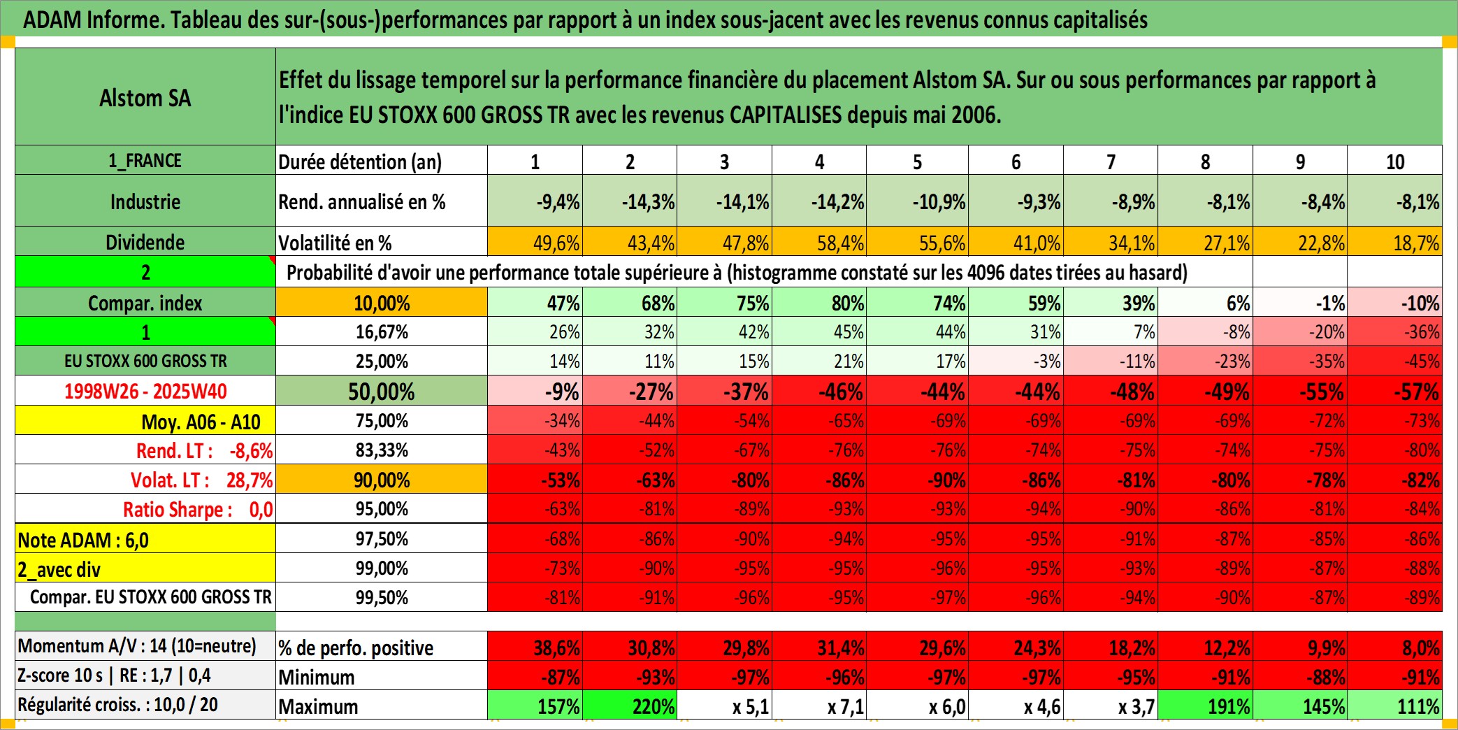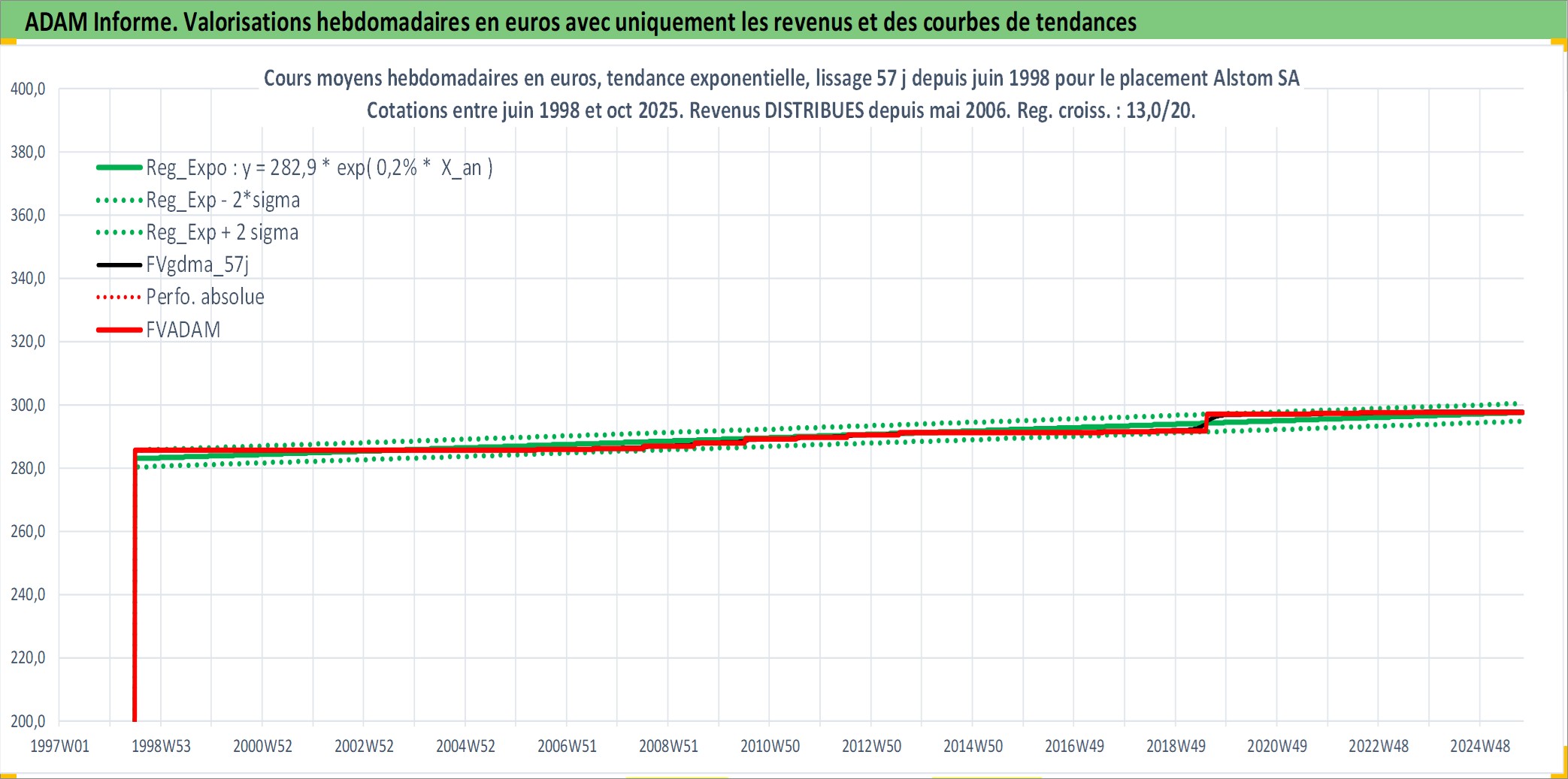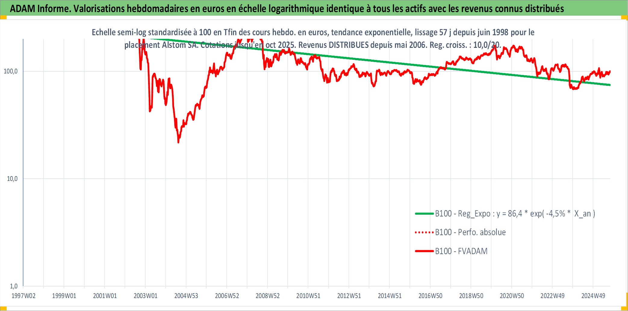 Site dédié aux investisseursPage dédiée sur site financeAnalyse des valorisations hebdomadaires de l'action Alstom SA. Cet actif est cote en EUR. Les valorisations couvrent les semaines 1998W26 a 2025W40. Les revenus de cet actif financier sont pris en compte depuis la semaine 2006W20. La note globale ESG de cet actif est estimee a 11.0 (apres rebasage entre 0 et 20).