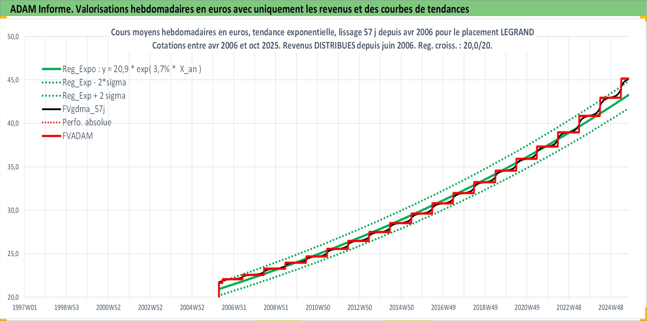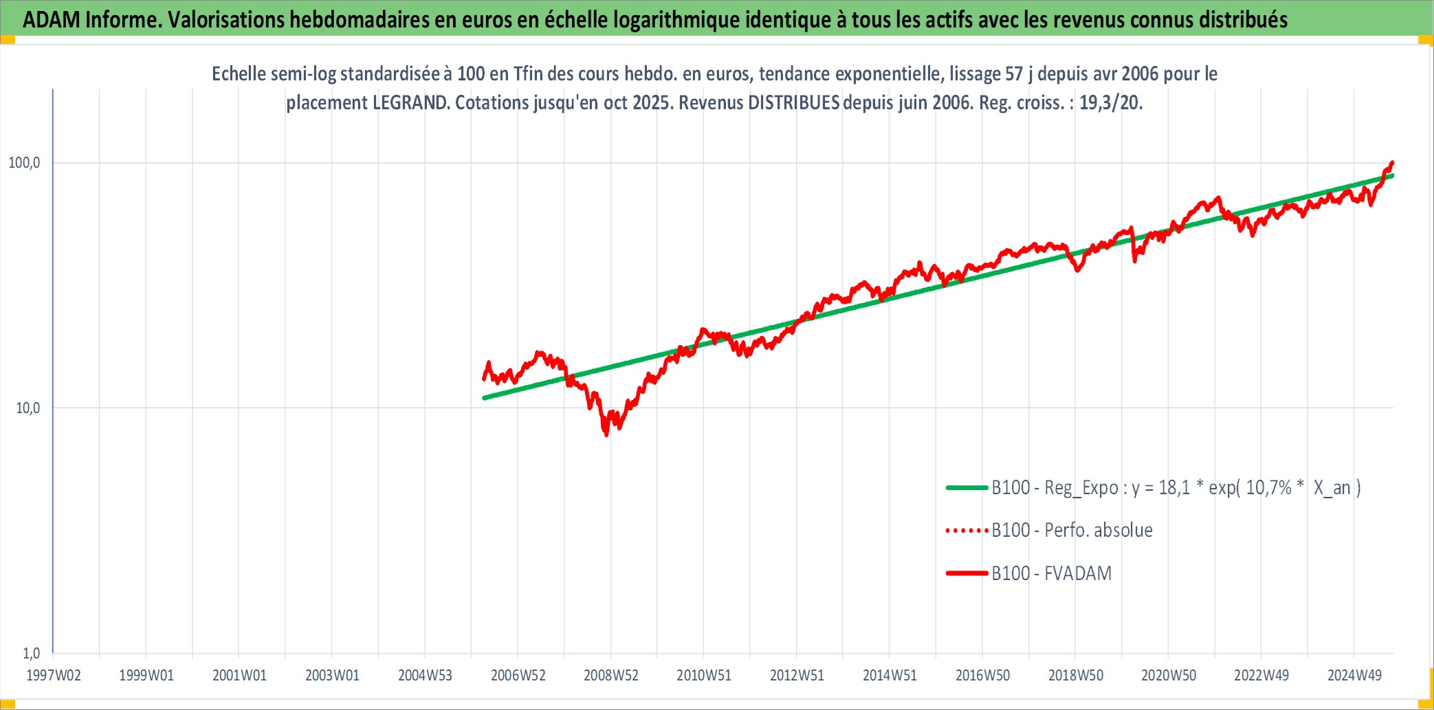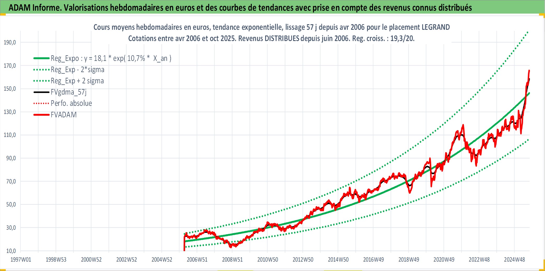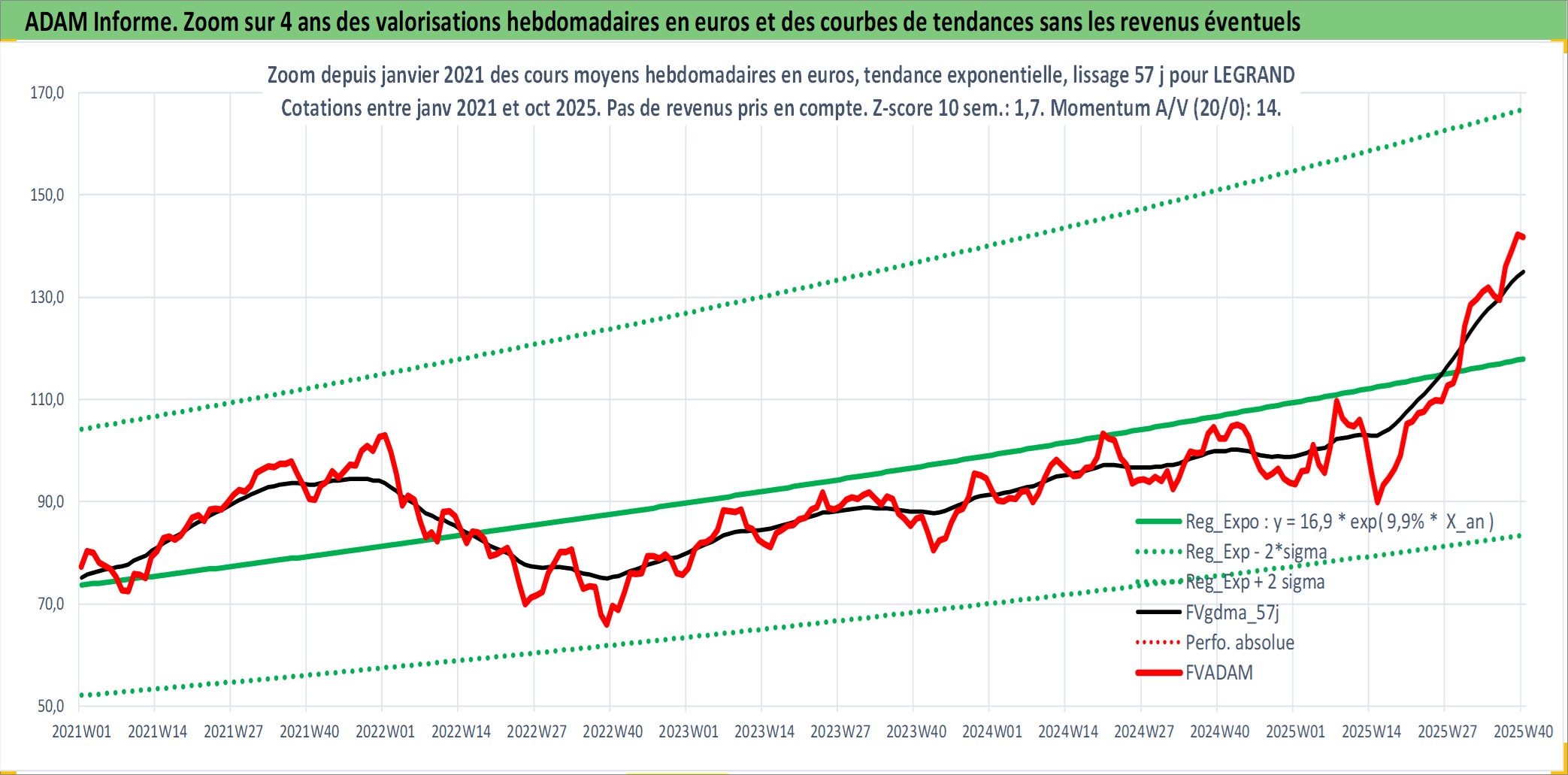 Site dédié aux investisseursPage dédiée sur site financeAnalyse des valorisations hebdomadaires de l'action LEGRAND. Cet actif est cote en EUR. Les valorisations couvrent les semaines 2006W14 a 2025W40. Les revenus de cet actif financier sont pris en compte depuis la semaine 2006W23. La note globale ESG de cet actif est estimee a 13.0 (apres rebasage entre 0 et 20).