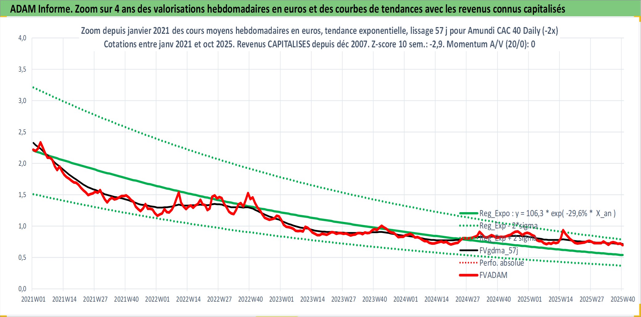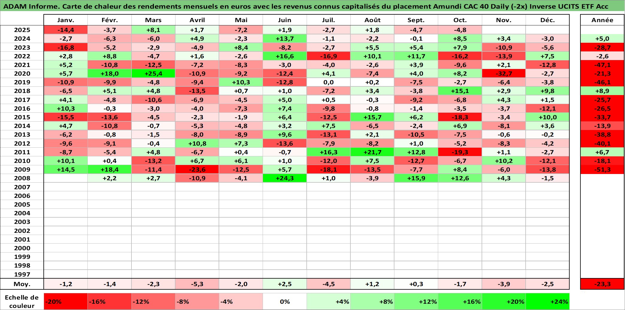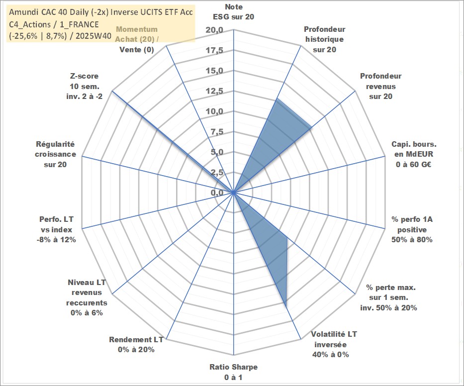 Site dédié aux investisseursPage dédiée sur site financeAnalyse des valorisations hebdomadaires du fonds Amundi CAC 40 Daily (-2x) Inverse UCITS ETF Acc. Cet actif est cote en EUR. Les valorisations couvrent les semaines 2008W01 a 2025W40. Les revenus de cet actif financier sont pris en compte depuis la semaine 2008W01. La note ESG de cet actif n'est pas connue.