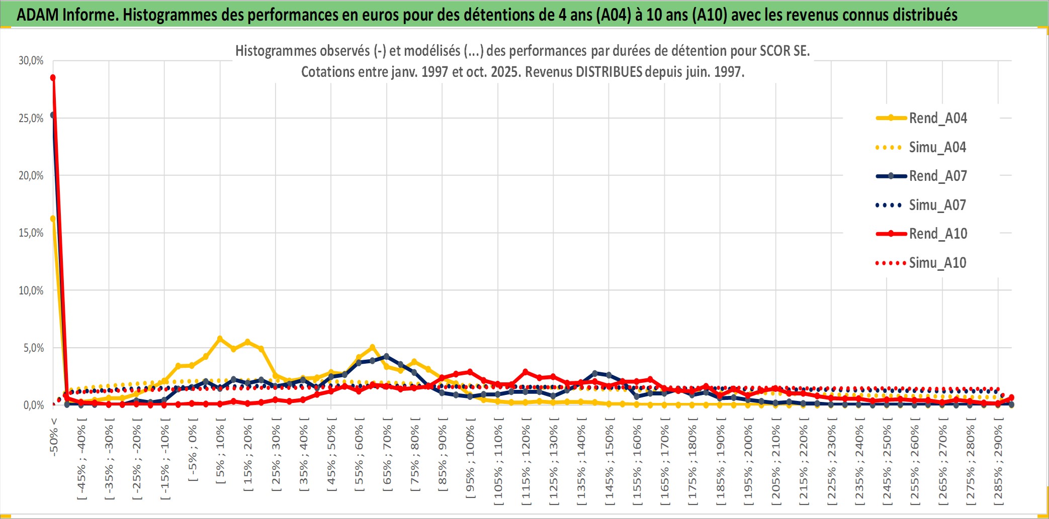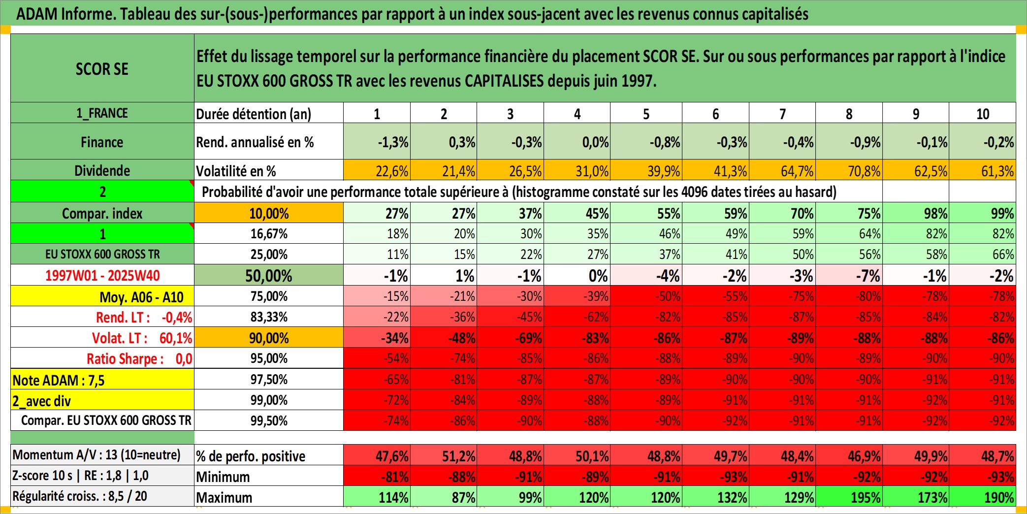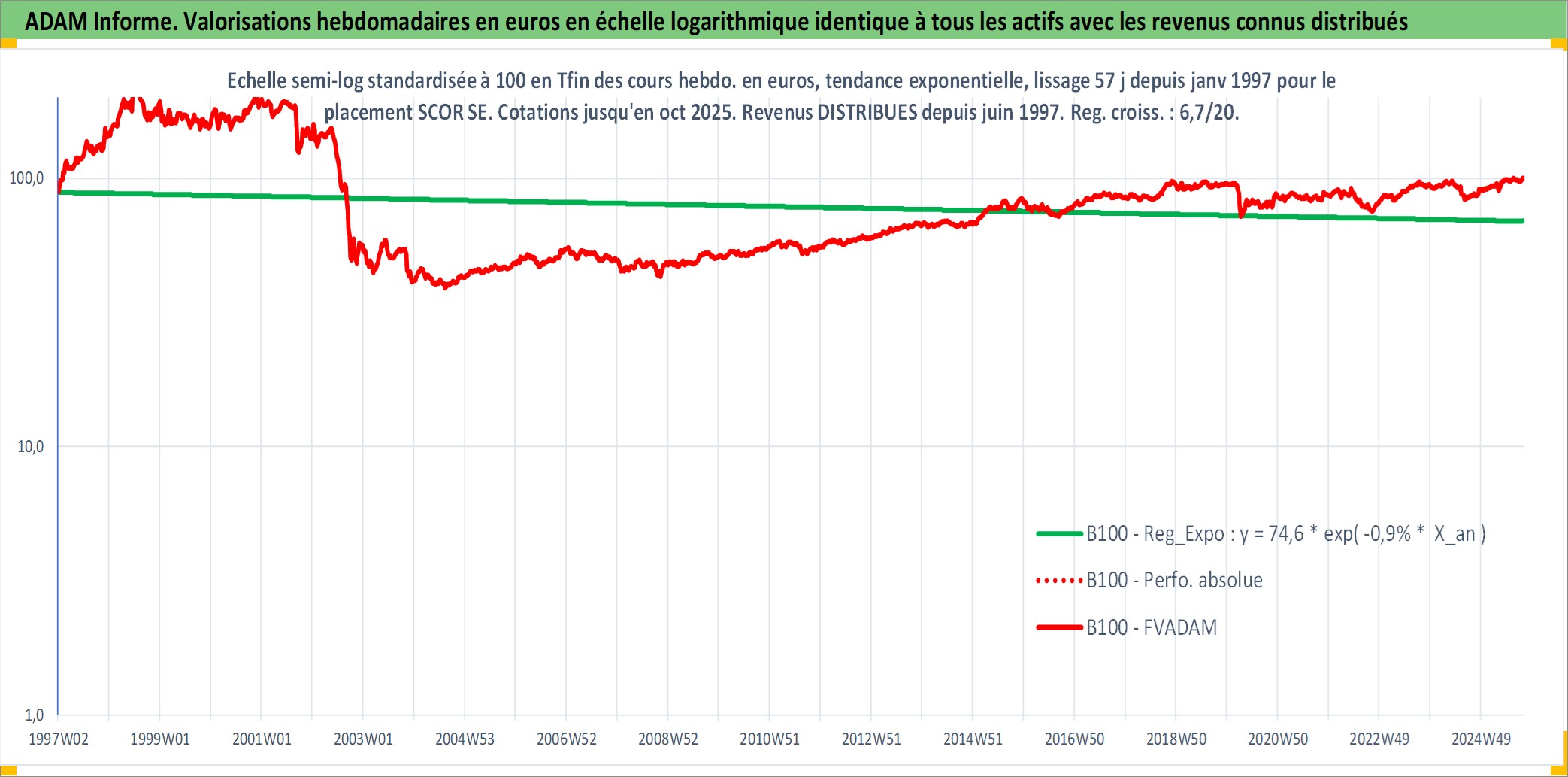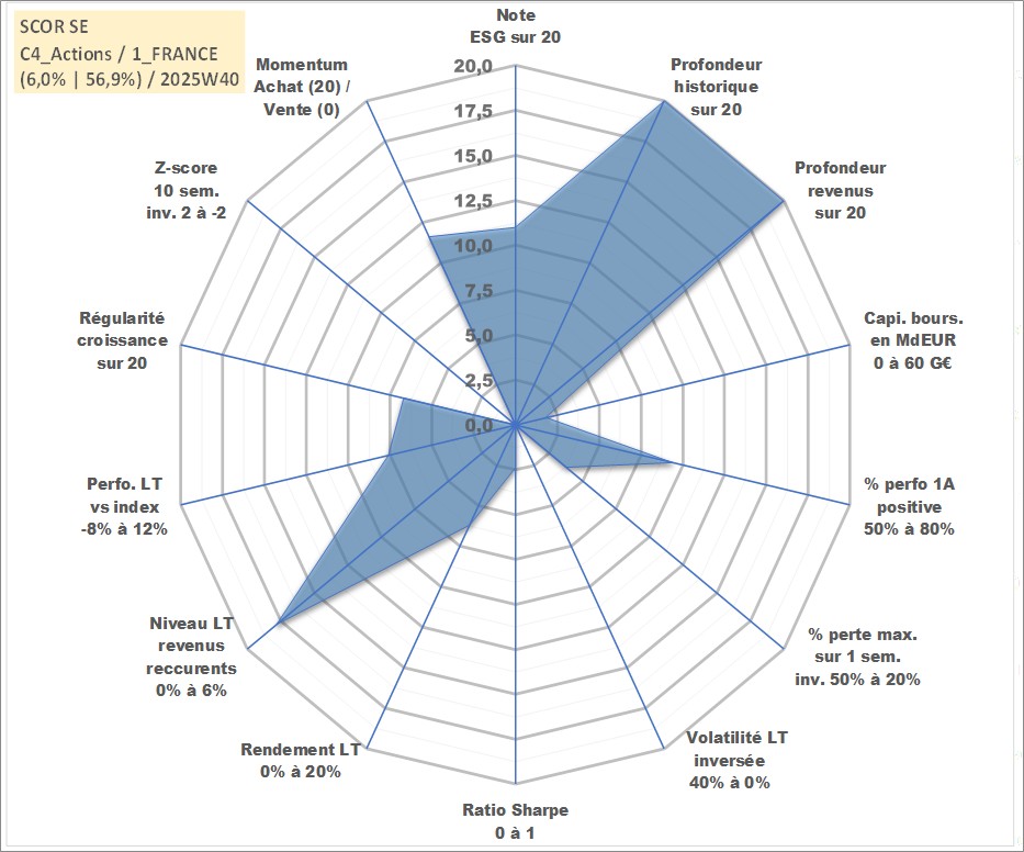 Site dédié aux investisseursPage dédiée sur site financeAnalyse des valorisations hebdomadaires de l'action SCOR SE. Cet actif est cote en EUR. Les valorisations couvrent les semaines 1997W01 a 2025W40. Les revenus de cet actif financier sont pris en compte depuis la semaine 1997W23. La note globale ESG de cet actif est estimee a 11.0 (apres rebasage entre 0 et 20).
