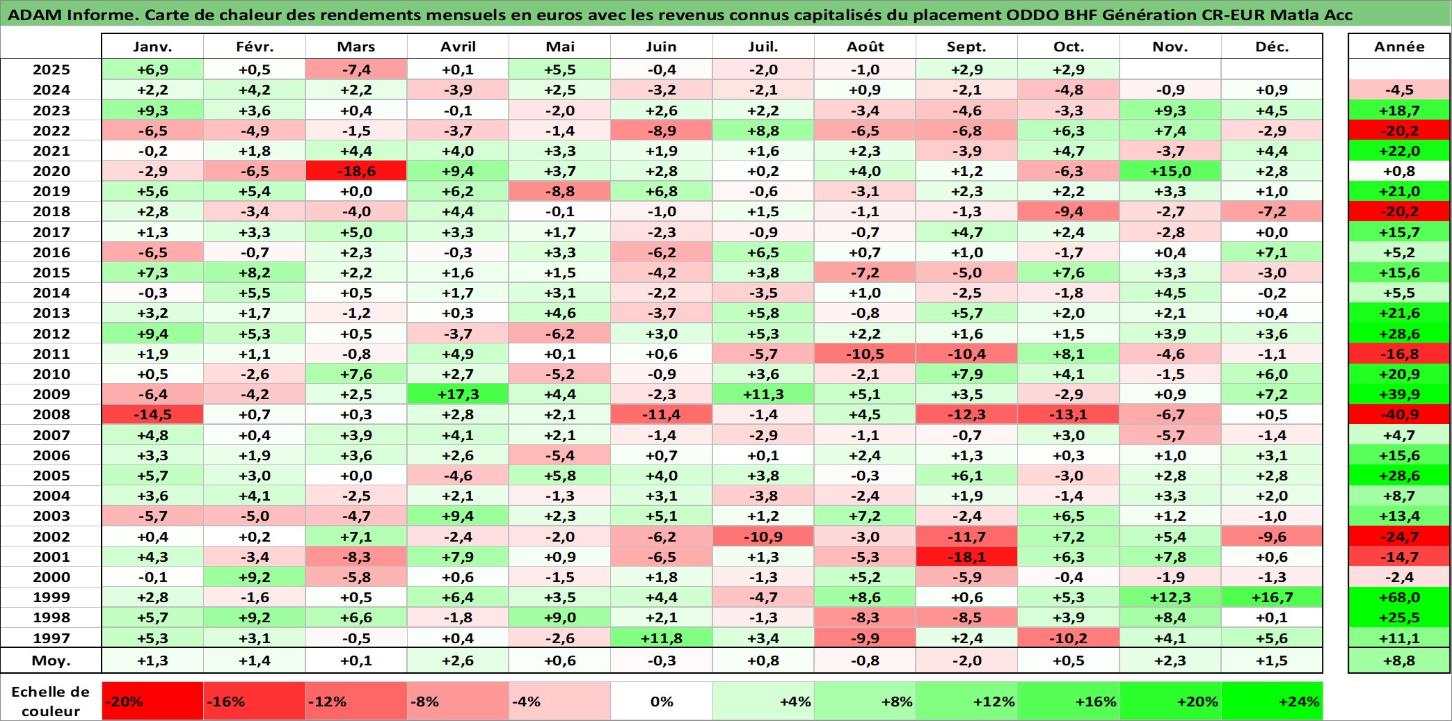 Site dédié aux investisseursPage dédiée sur site financeAnalyse des valorisations hebdomadaires du fonds ODDO BHF Génération CR-EUR Matla Acc. Cet actif est cote en EUR. Les valorisations couvrent les semaines 1997W01 a 2025W40. Les revenus de cet actif financier sont pris en compte depuis la semaine 1997W01. La note ESG de cet actif n'est pas connue.