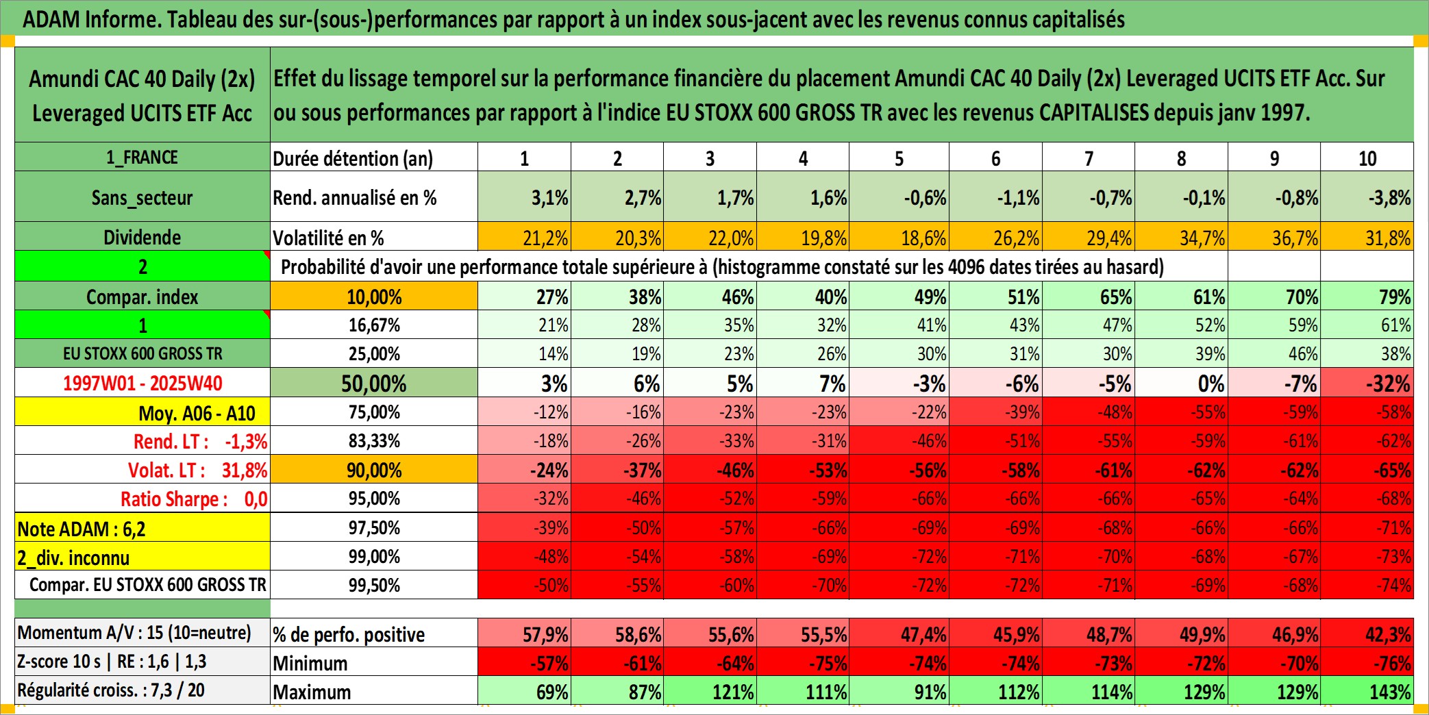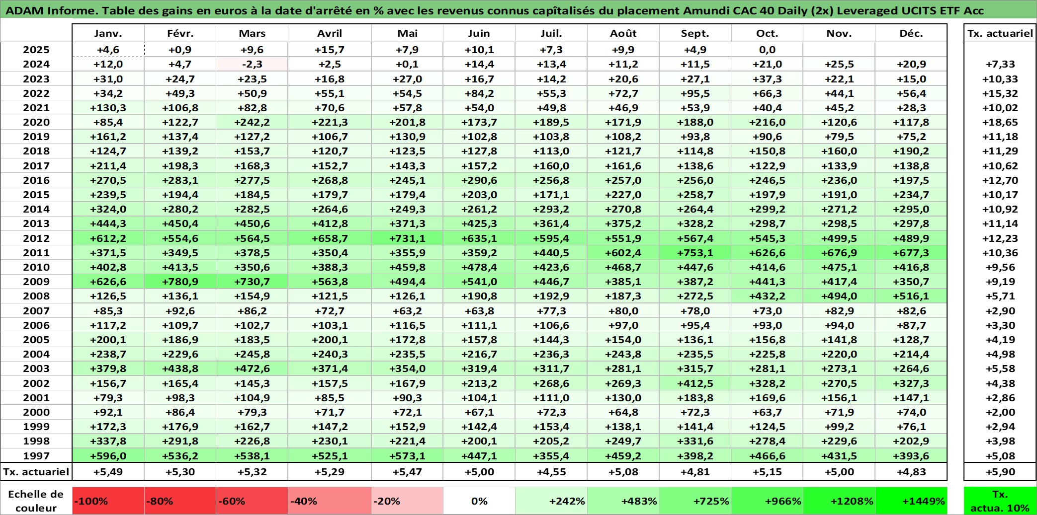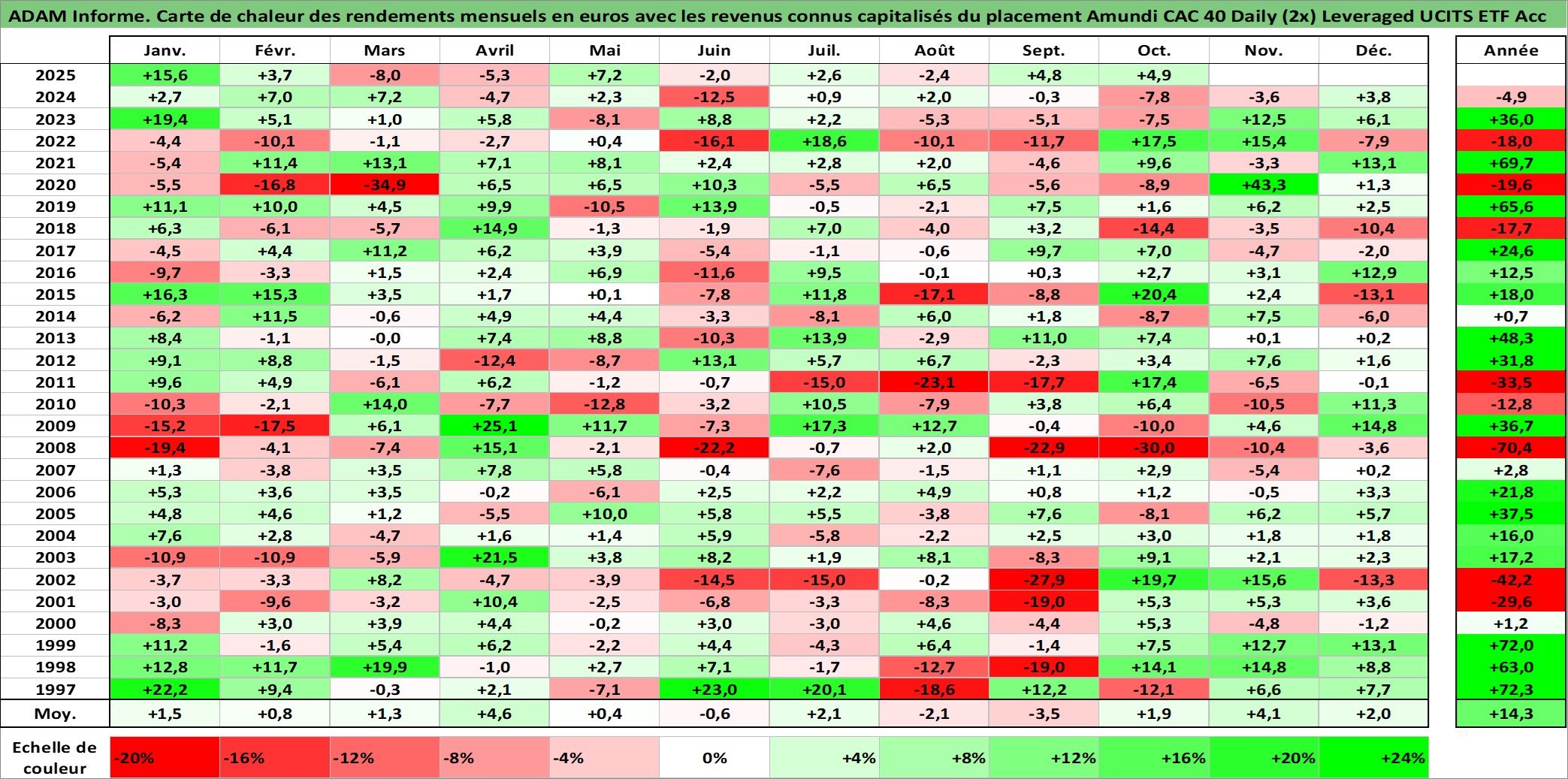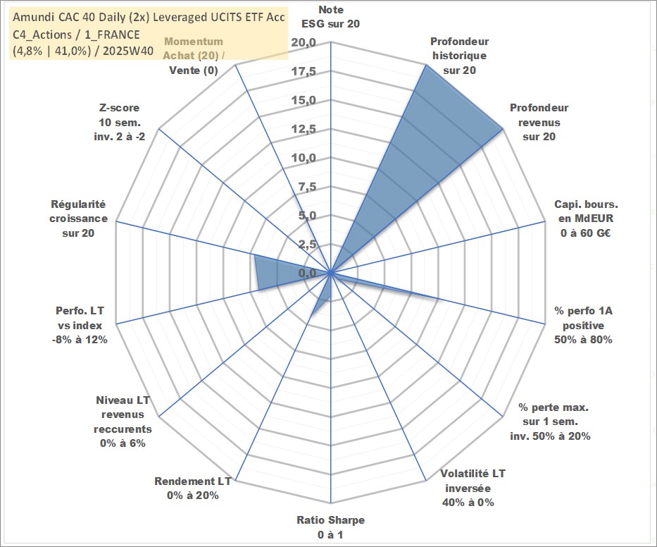 Site dédié aux investisseursPage dédiée sur site financeAnalyse des valorisations hebdomadaires du fonds Amundi CAC 40 Daily (2x) Leveraged UCITS ETF Acc. Cet actif est cote en EUR. Les valorisations couvrent les semaines 1997W01 a 2025W40. Les revenus de cet actif financier sont pris en compte depuis la semaine 1997W01. La note ESG de cet actif n'est pas connue.