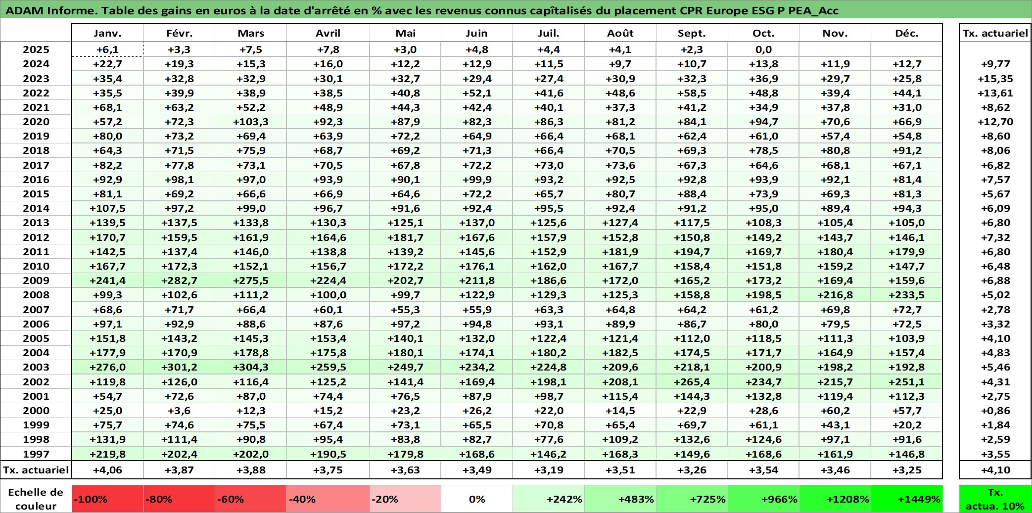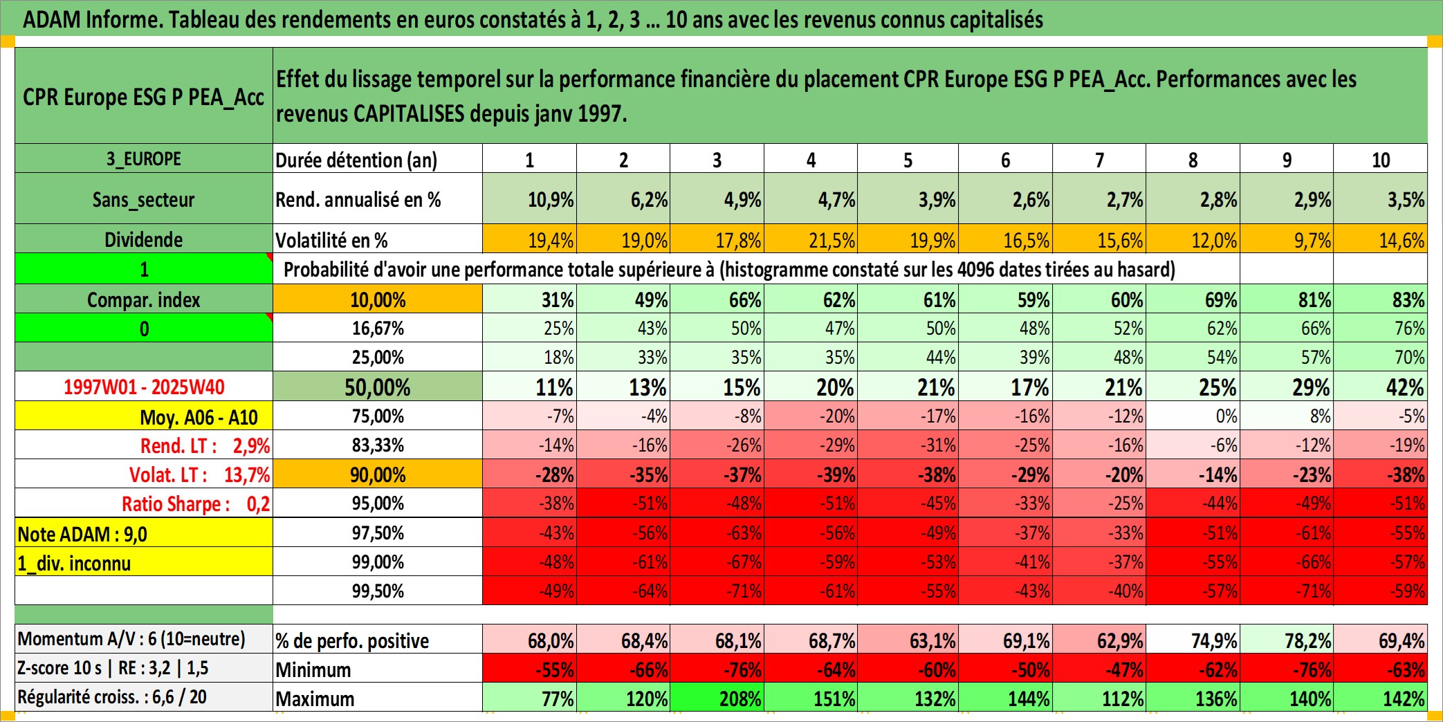 Site dédié aux investisseursPage dédiée sur site financeAnalyse des valorisations hebdomadaires du fonds CPR Europe ESG P PEA_Acc. Cet actif est cote en EUR. Les valorisations couvrent les semaines 1997W01 a 2025W40. Les revenus de cet actif financier sont pris en compte depuis la semaine 1997W01. La note ESG de cet actif n'est pas connue.