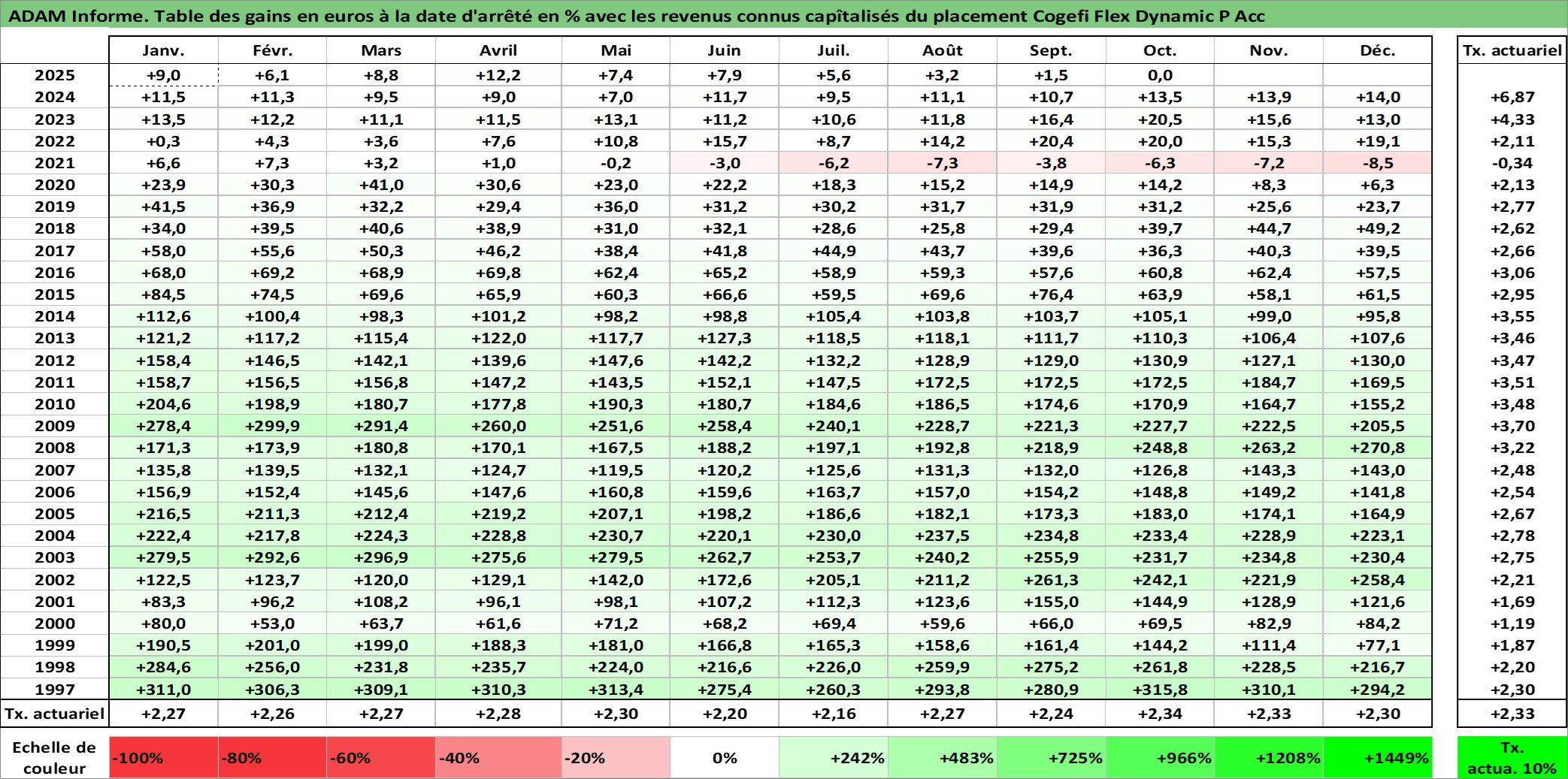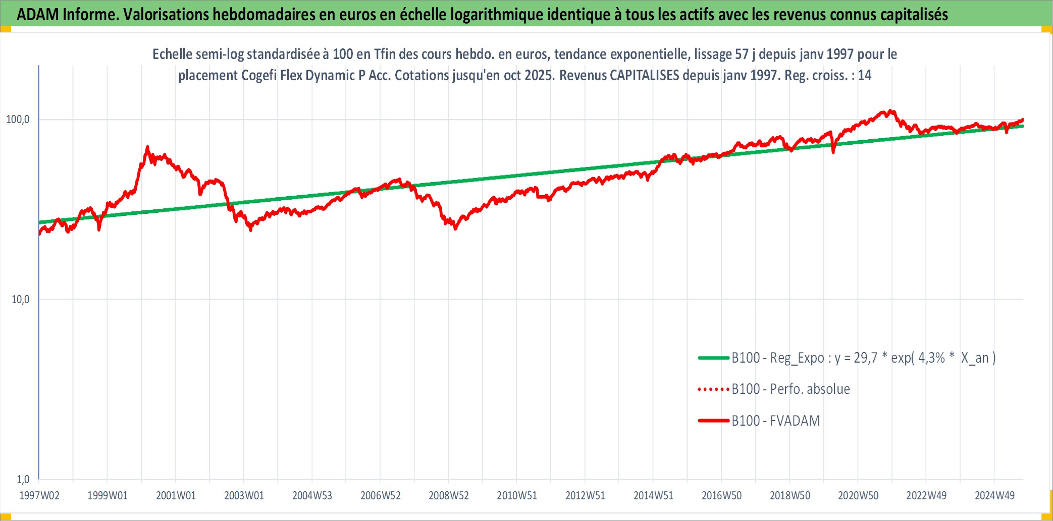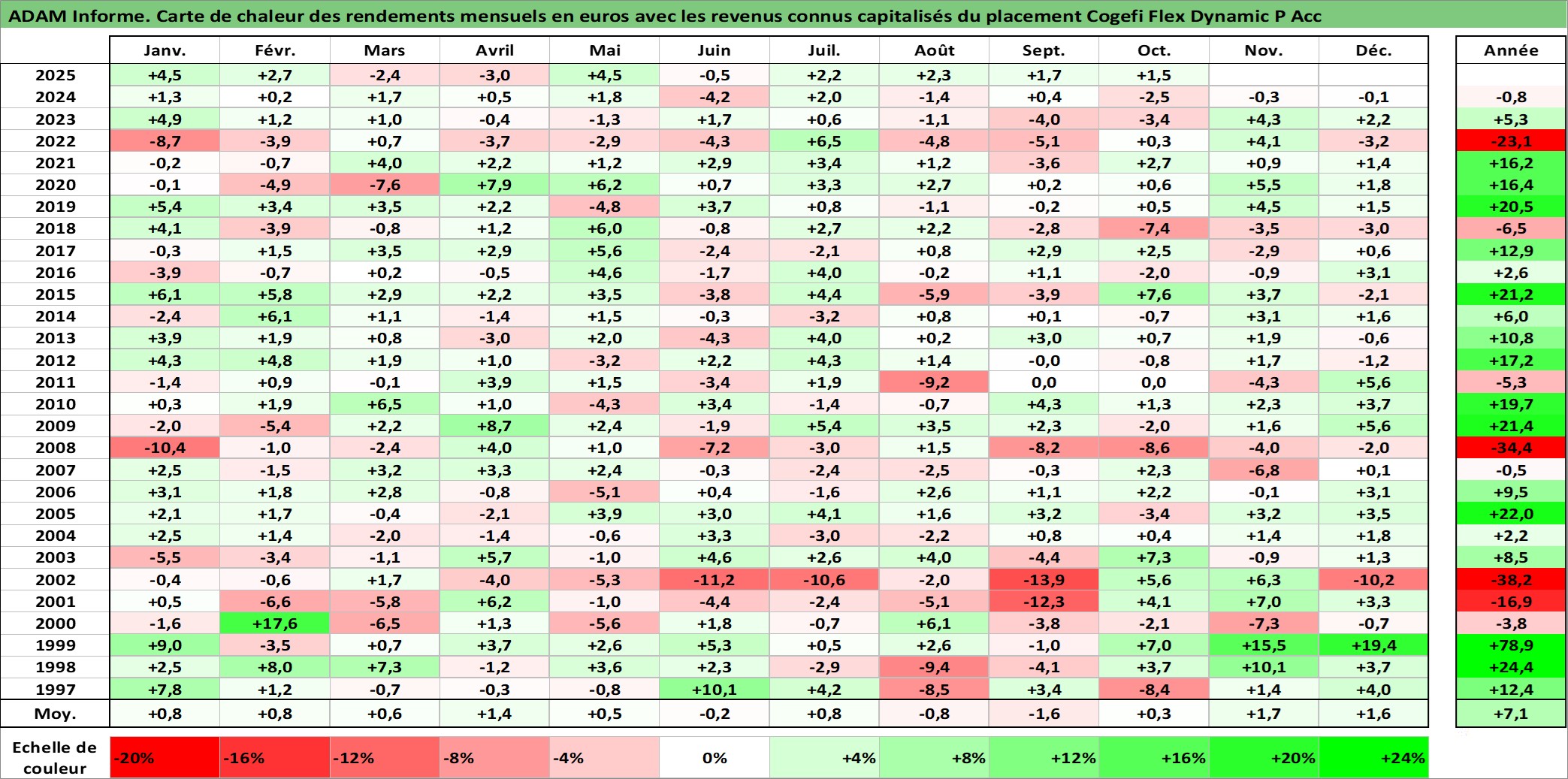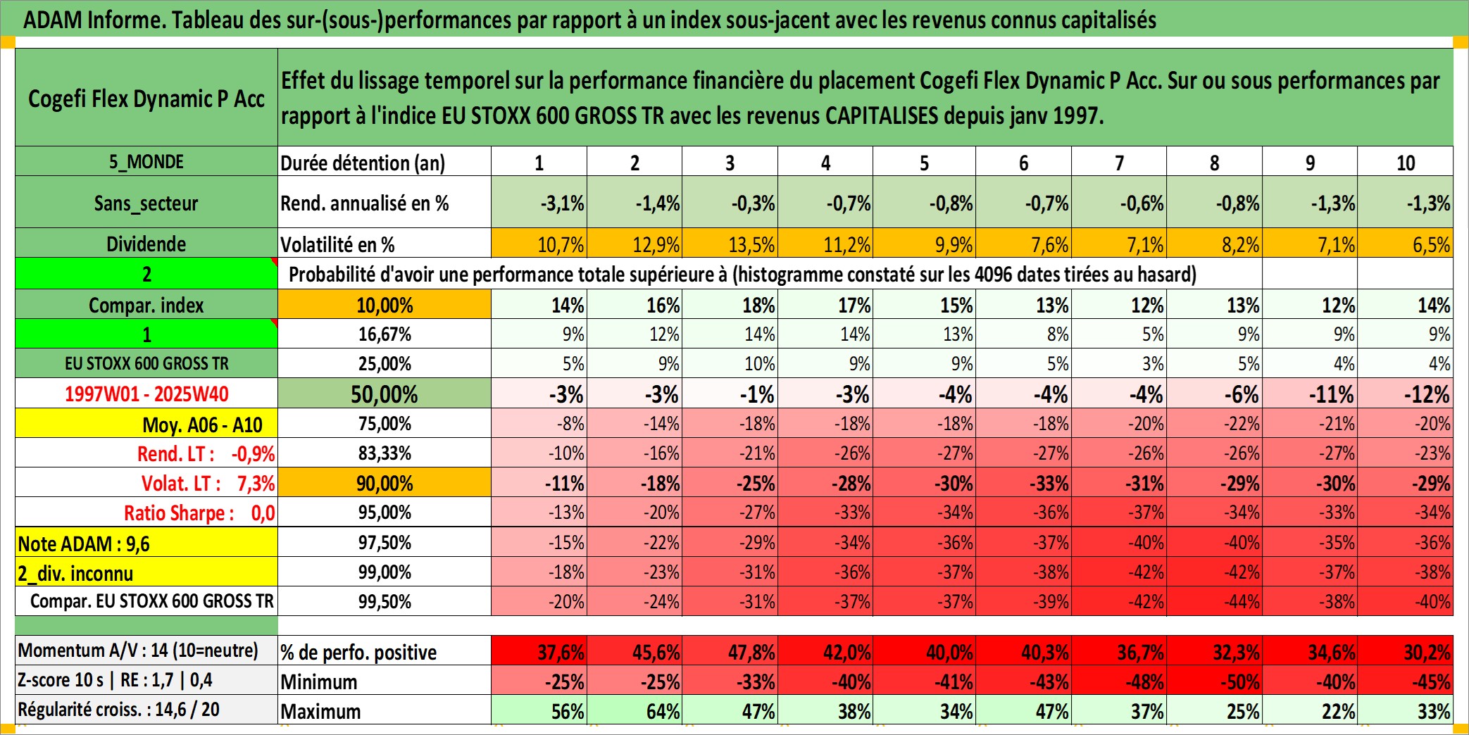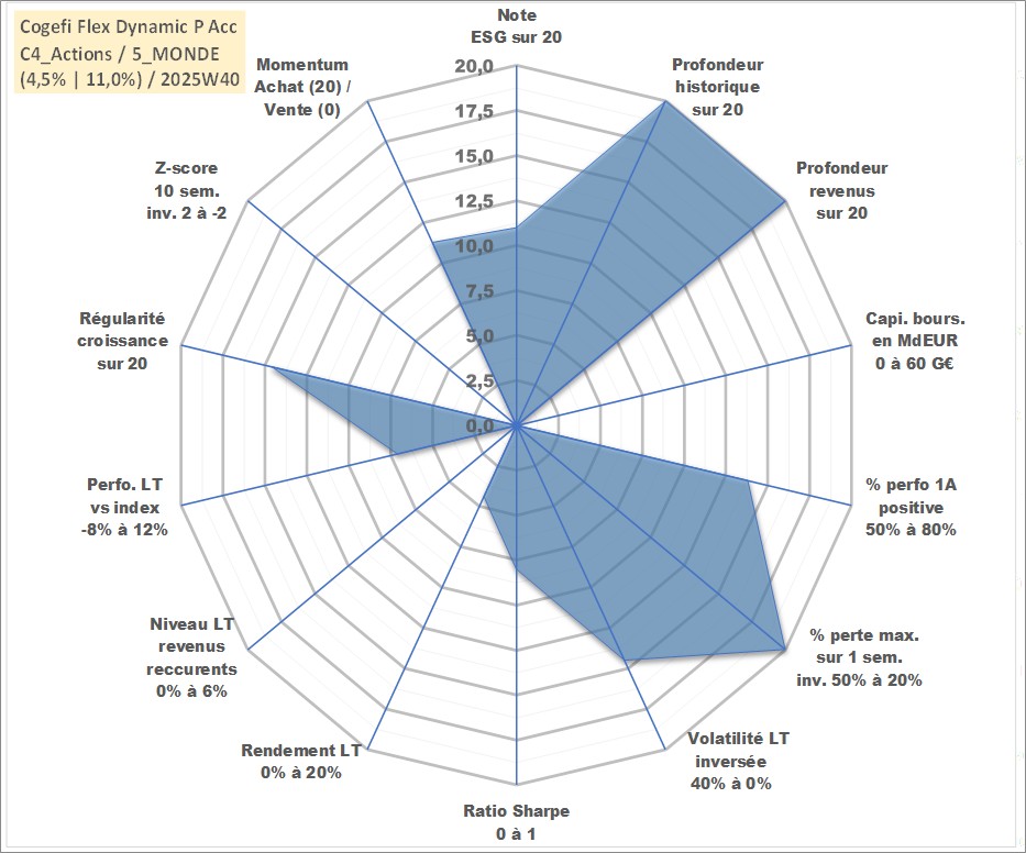 Site dédié aux investisseursPage dédiée sur site financeAnalyse des valorisations hebdomadaires du fonds Cogefi Flex Dynamic P Acc. Cet actif est cote en EUR. Les valorisations couvrent les semaines 1997W01 a 2025W40. Les revenus de cet actif financier sont pris en compte depuis la semaine 1997W01. La note globale ESG de cet actif est estimee a 11.0 (apres rebasage entre 0 et 20).
