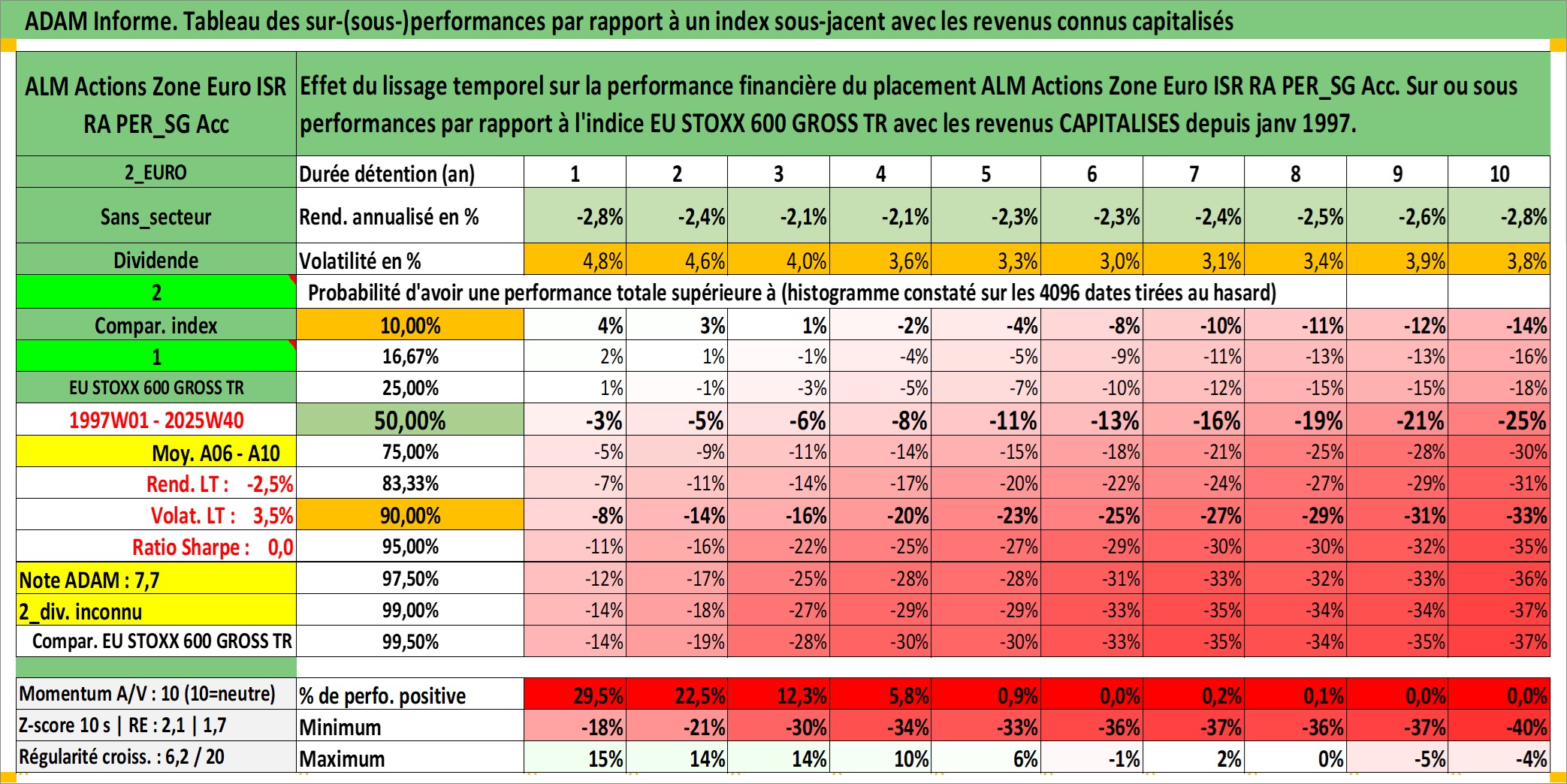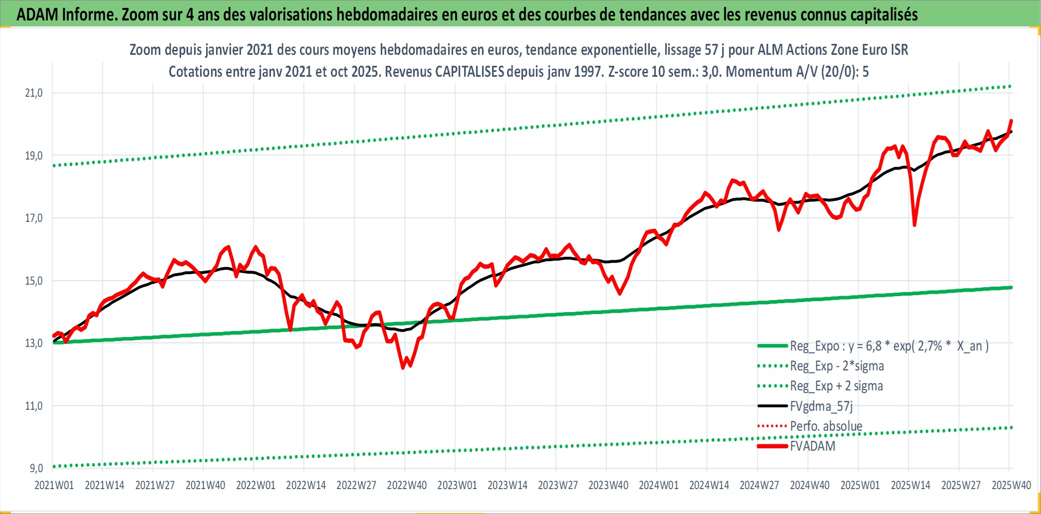 Site dédié aux investisseursPage dédiée sur site financeAnalyse des valorisations hebdomadaires du fonds ALM Actions Zone Euro ISR RA PER_SG Acc. Cet actif est cote en EUR. Les valorisations couvrent les semaines 1997W01 a 2025W40. Les revenus de cet actif financier sont pris en compte depuis la semaine 1997W01. La note globale ESG de cet actif est estimee a 10.0 (apres rebasage entre 0 et 20).