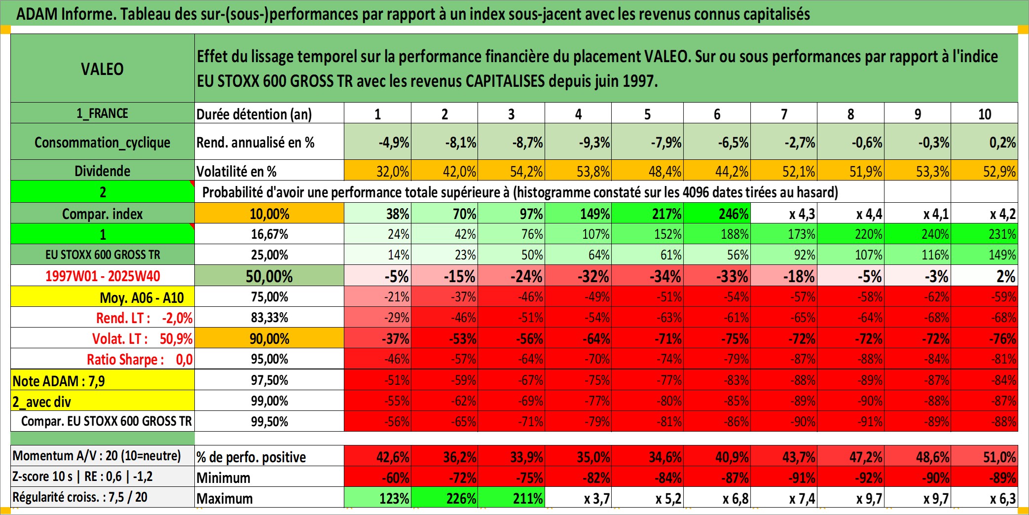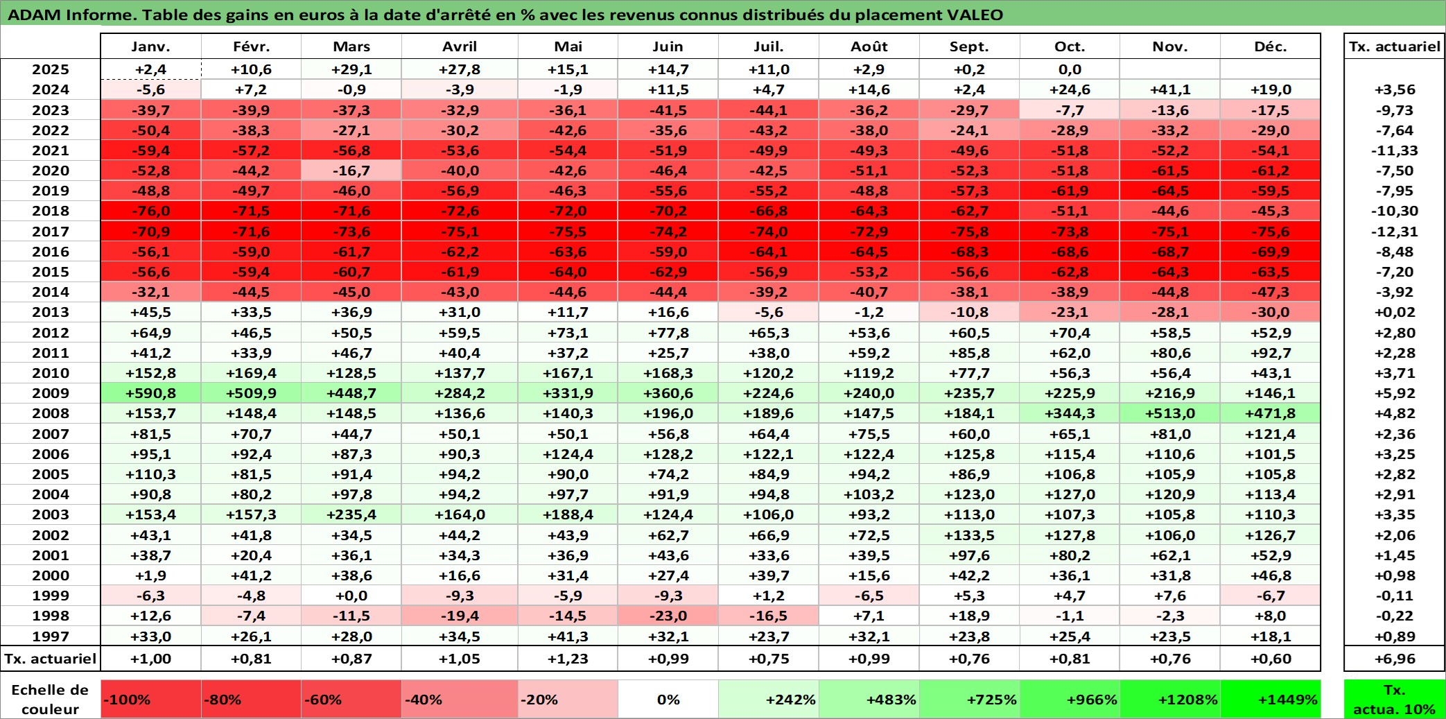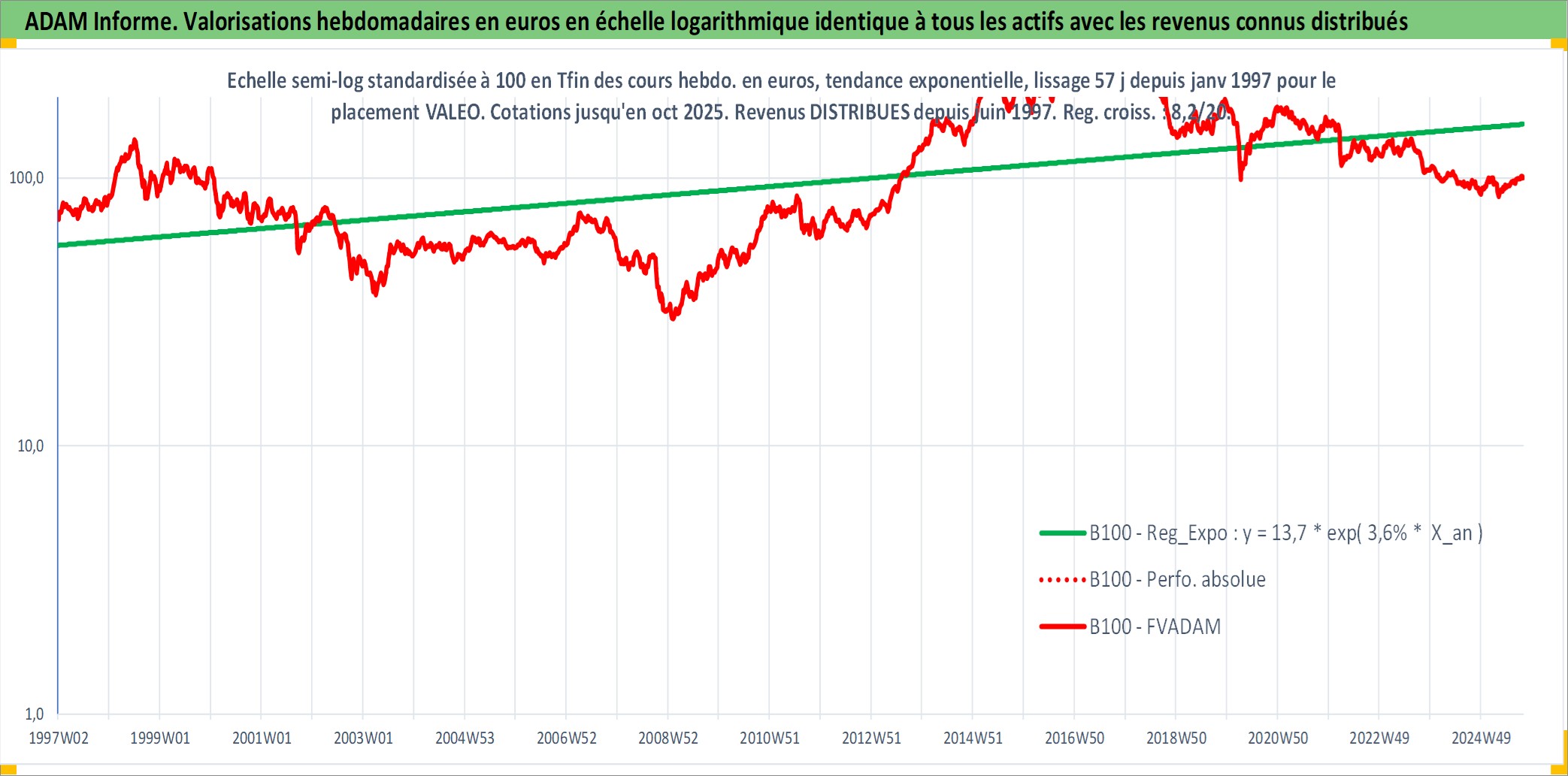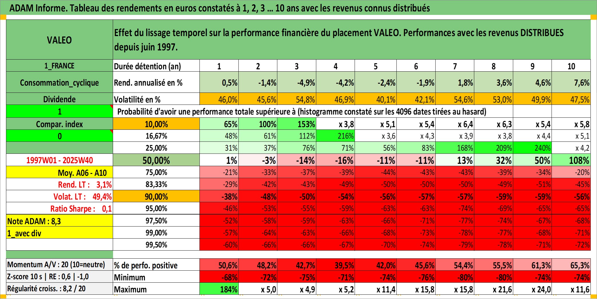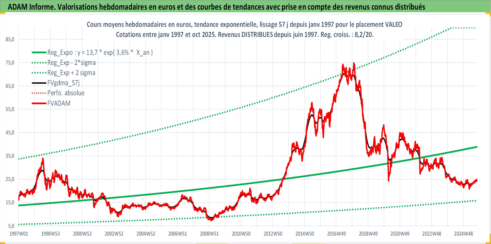 Site dédié aux investisseursPage dédiée sur site financeAnalyse des valorisations hebdomadaires de l'action VALEO. Cet actif est cote en EUR. Les valorisations couvrent les semaines 1997W01 a 2025W40. Les revenus de cet actif financier sont pris en compte depuis la semaine 1997W23. La note globale ESG de cet actif est estimee a 16.0 (apres rebasage entre 0 et 20).