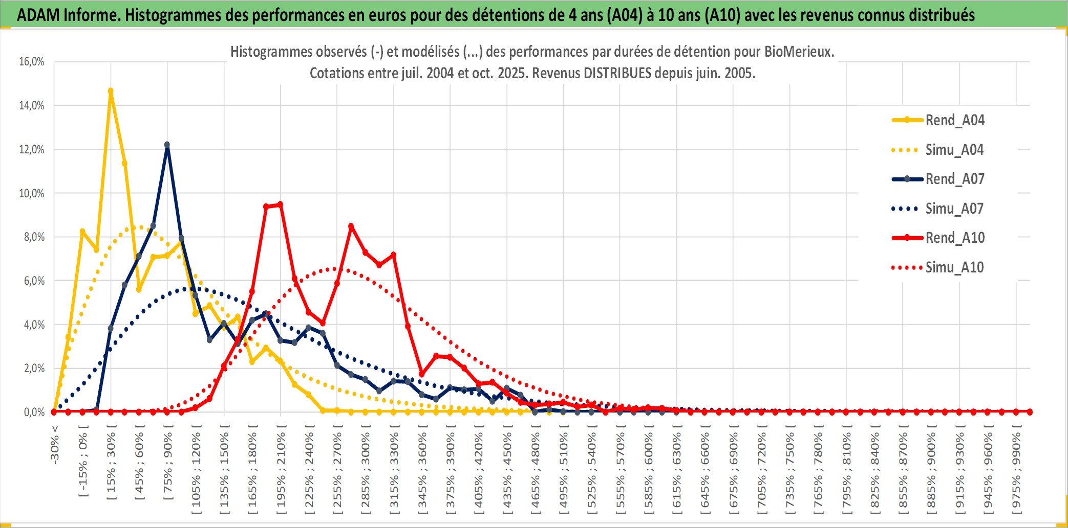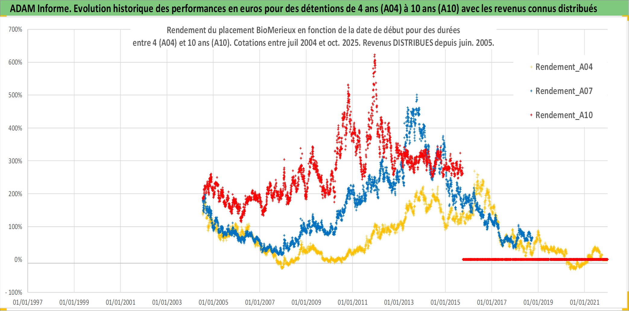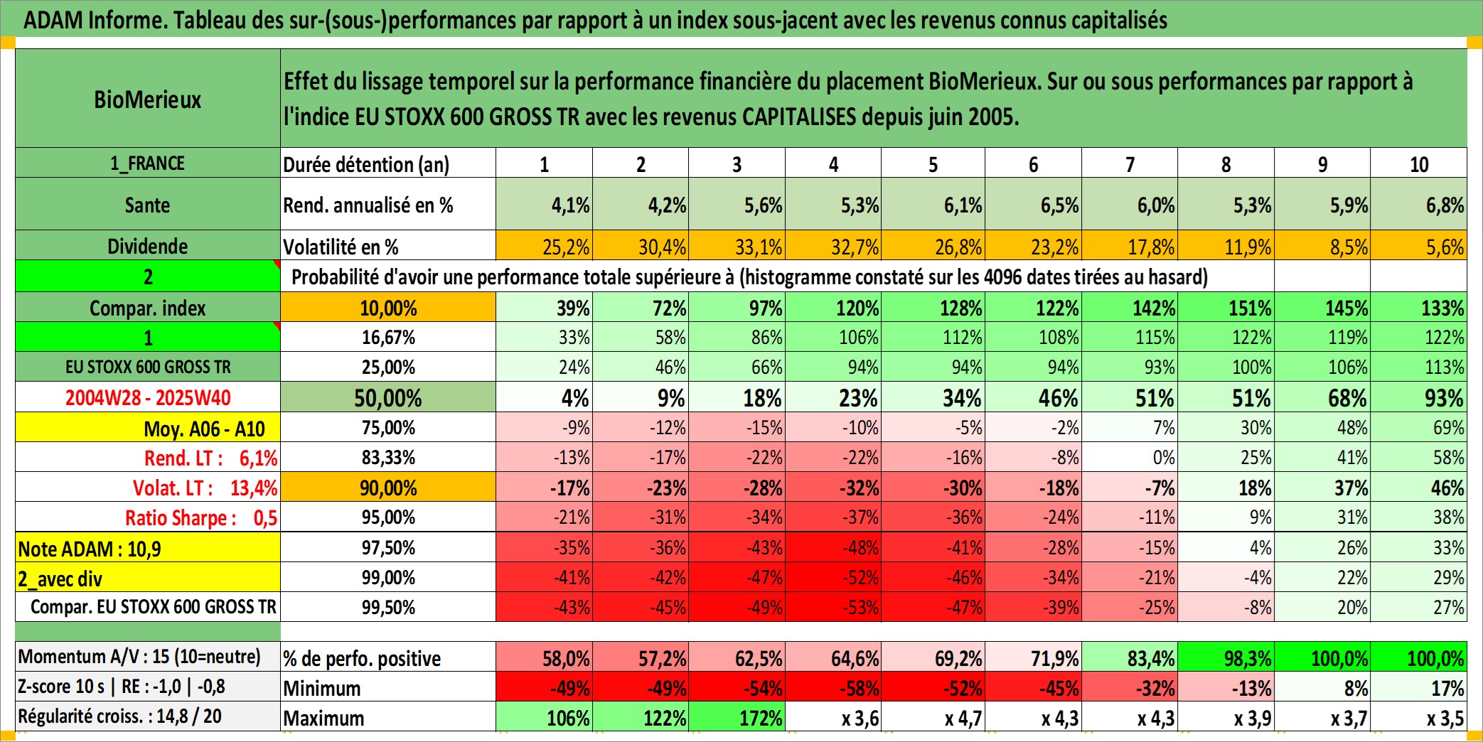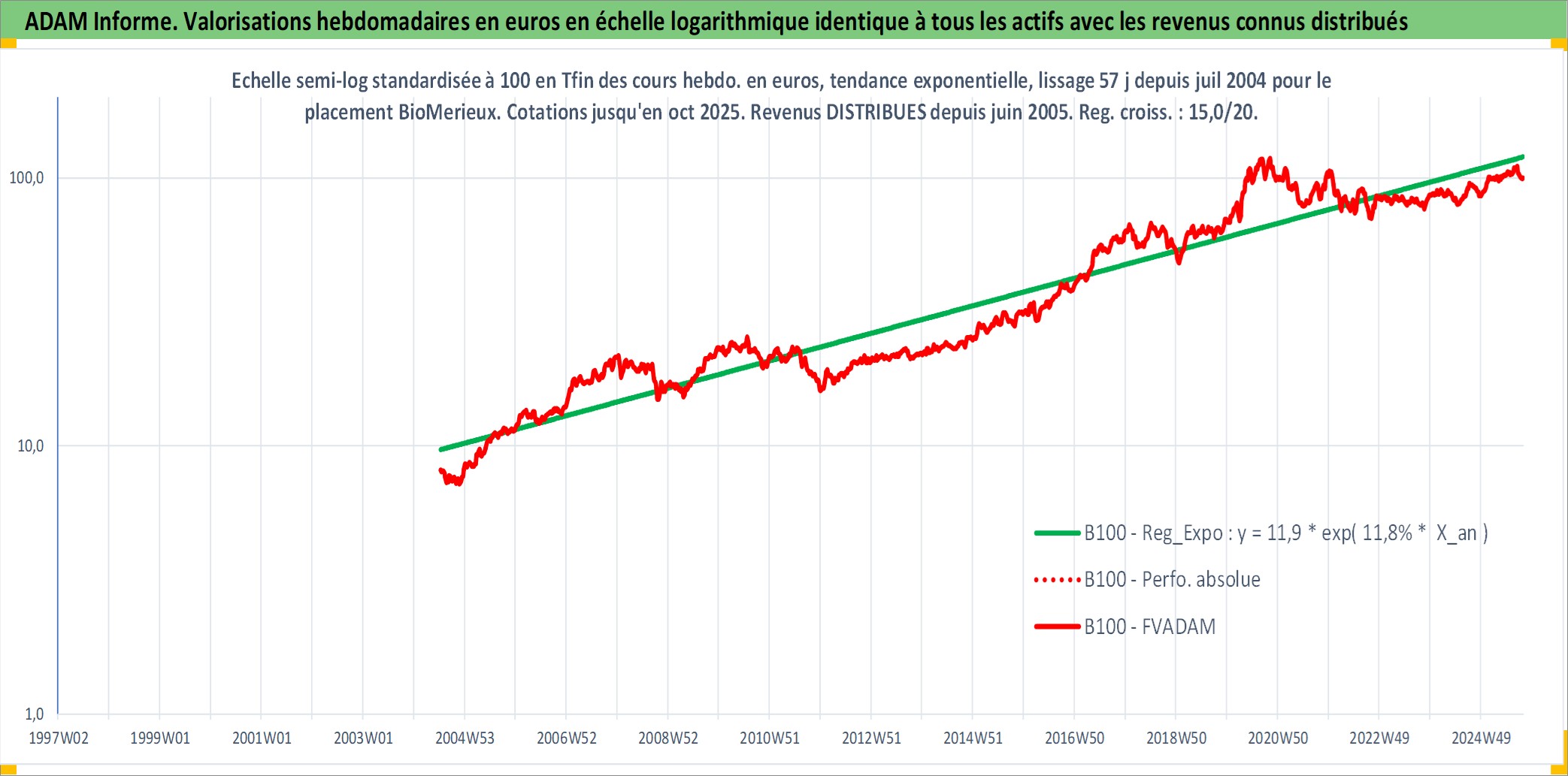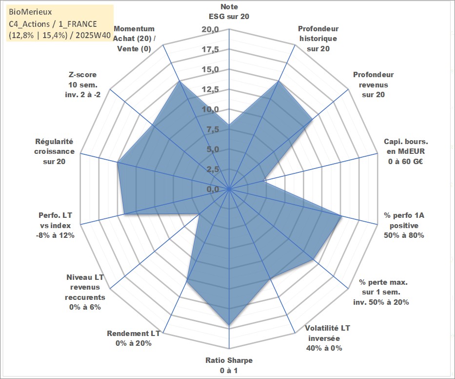 Site dédié aux investisseursPage dédiée sur site financeAnalyse des valorisations hebdomadaires de l'action BioMerieux. Cet actif est cote en EUR. Les valorisations couvrent les semaines 2004W28 a 2025W40. Les revenus de cet actif financier sont pris en compte depuis la semaine 2005W25. La note globale ESG de cet actif est estimee a 8.0 (apres rebasage entre 0 et 20).