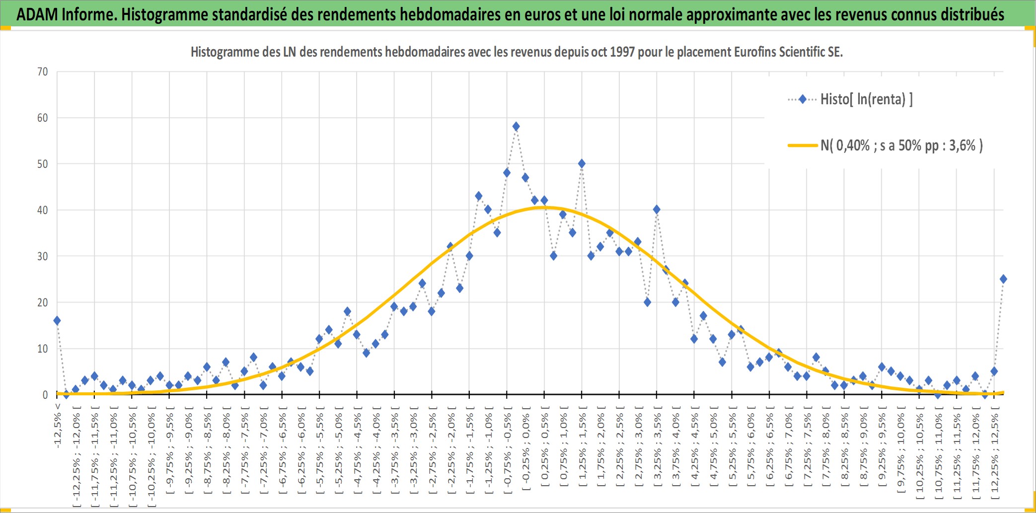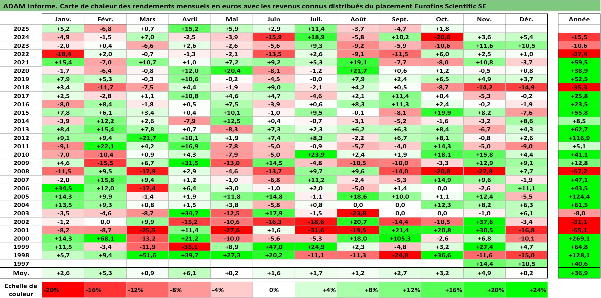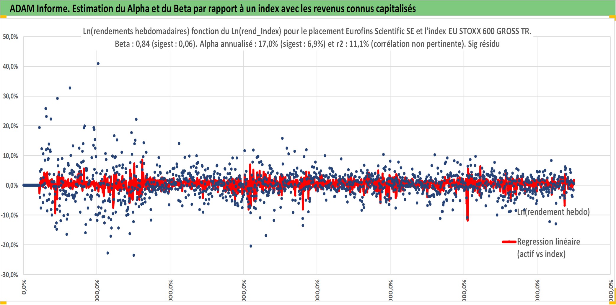 Site dédié aux investisseursPage dédiée sur site financeAnalyse des valorisations hebdomadaires de l'action Eurofins Scientific SE. Cet actif est cote en EUR. Les valorisations couvrent les semaines 1997W44 a 2025W40. Les revenus de cet actif financier sont pris en compte depuis la semaine 2007W30. La note globale ESG de cet actif est estimee a 12.0 (apres rebasage entre 0 et 20).