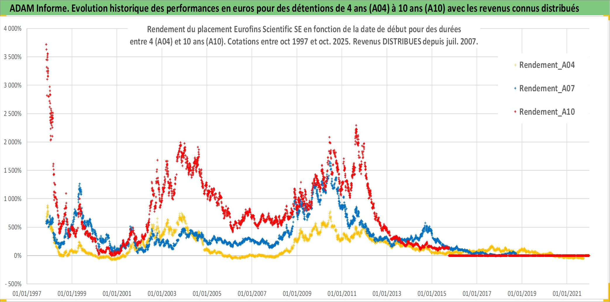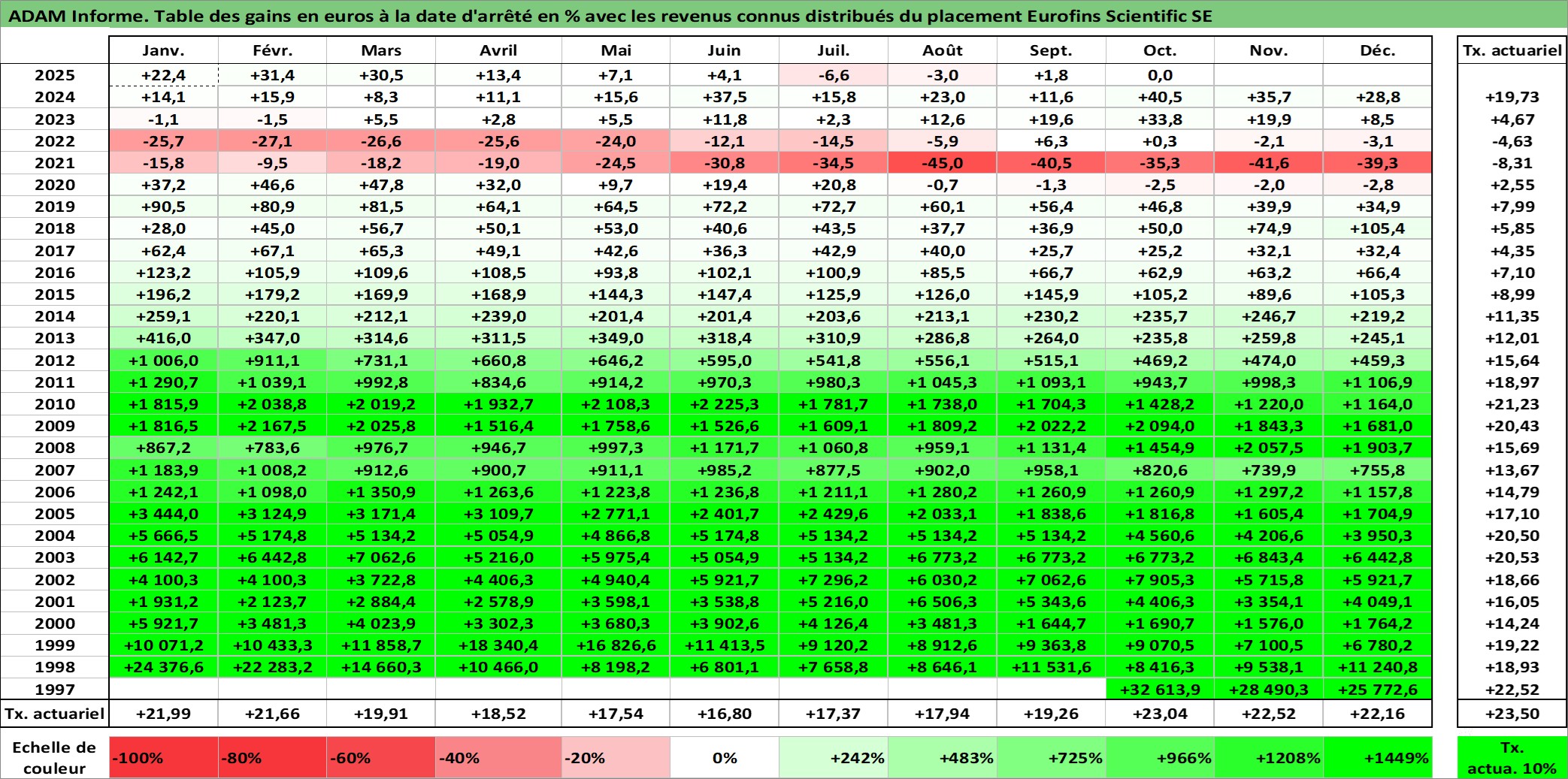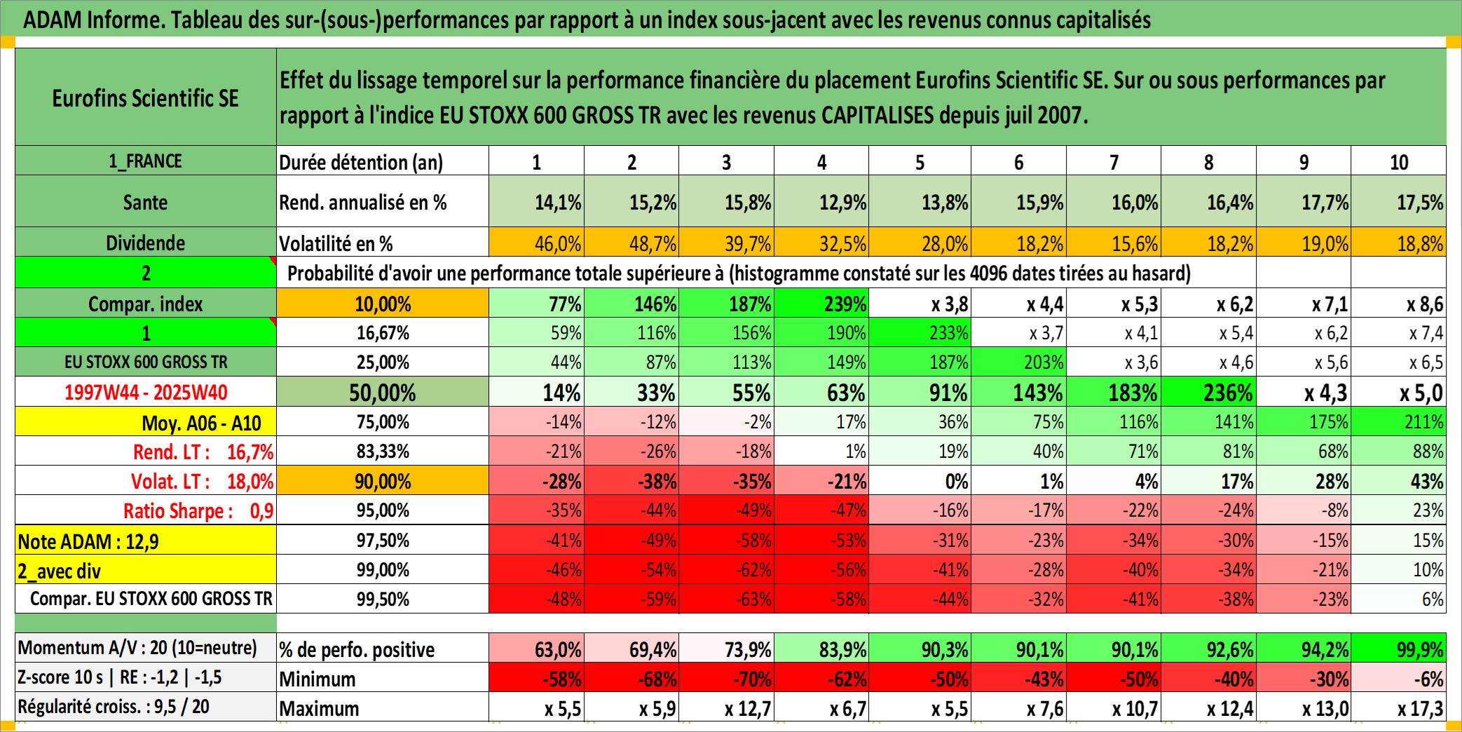 Site dédié aux investisseursPage dédiée sur site financeAnalyse des valorisations hebdomadaires de l'action Eurofins Scientific SE. Cet actif est cote en EUR. Les valorisations couvrent les semaines 1997W44 a 2025W40. Les revenus de cet actif financier sont pris en compte depuis la semaine 2007W30. La note globale ESG de cet actif est estimee a 12.0 (apres rebasage entre 0 et 20).