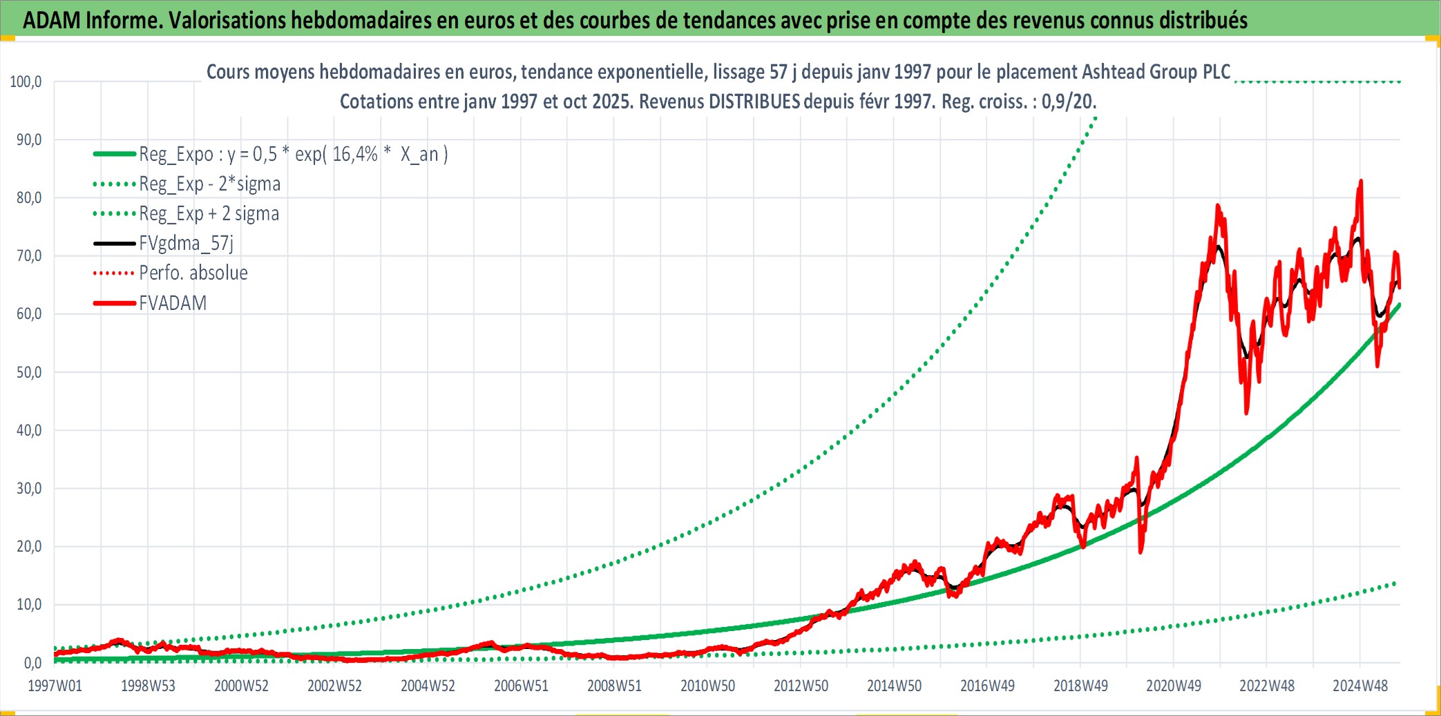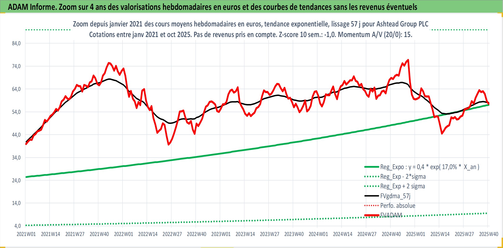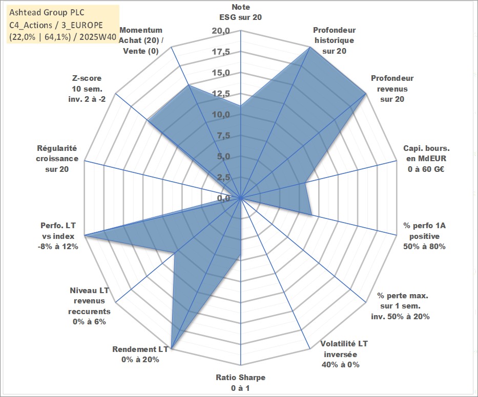 Site dédié aux investisseursPage dédiée sur site financeAnalyse des valorisations hebdomadaires de l'action Ashtead Group PLC. Cet actif est cote en GBX. Les valorisations sont en contrevaleur EURO et couvrent les semaines 1997W01 a 2025W40. Les revenus de cet actif financier sont pris en compte depuis la semaine 1997W09. La note globale ESG de cet actif est estimee a 11.0 (apres rebasage entre 0 et 20).
