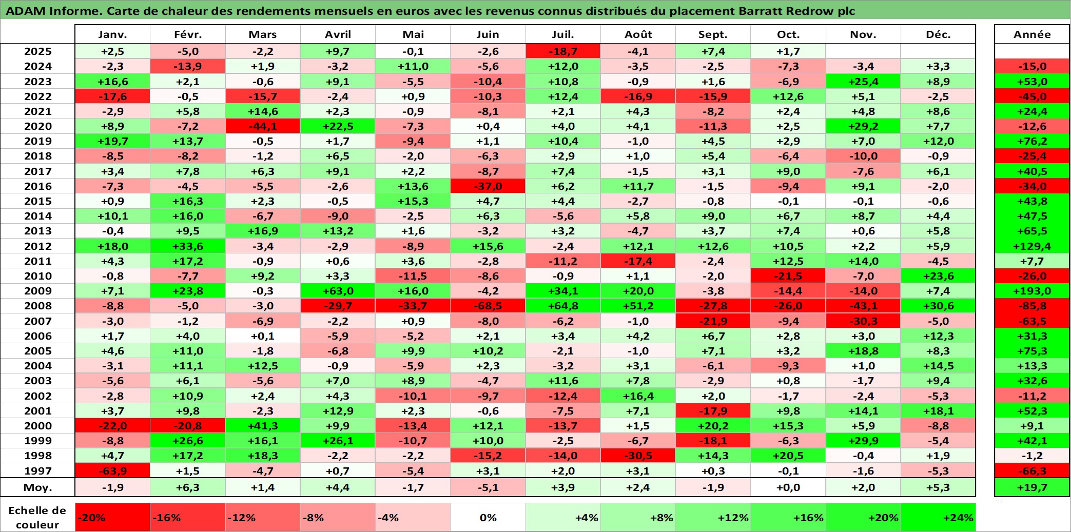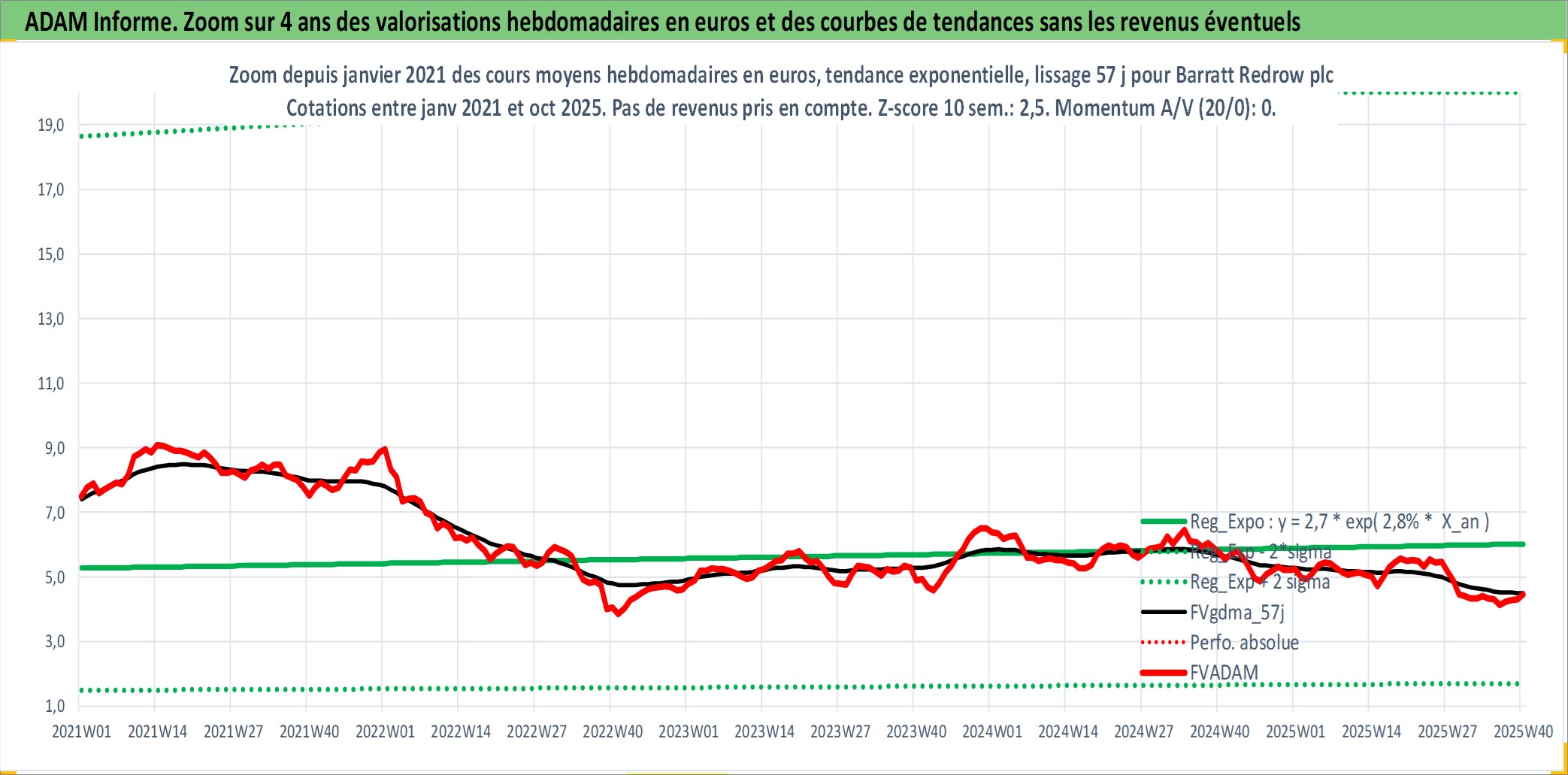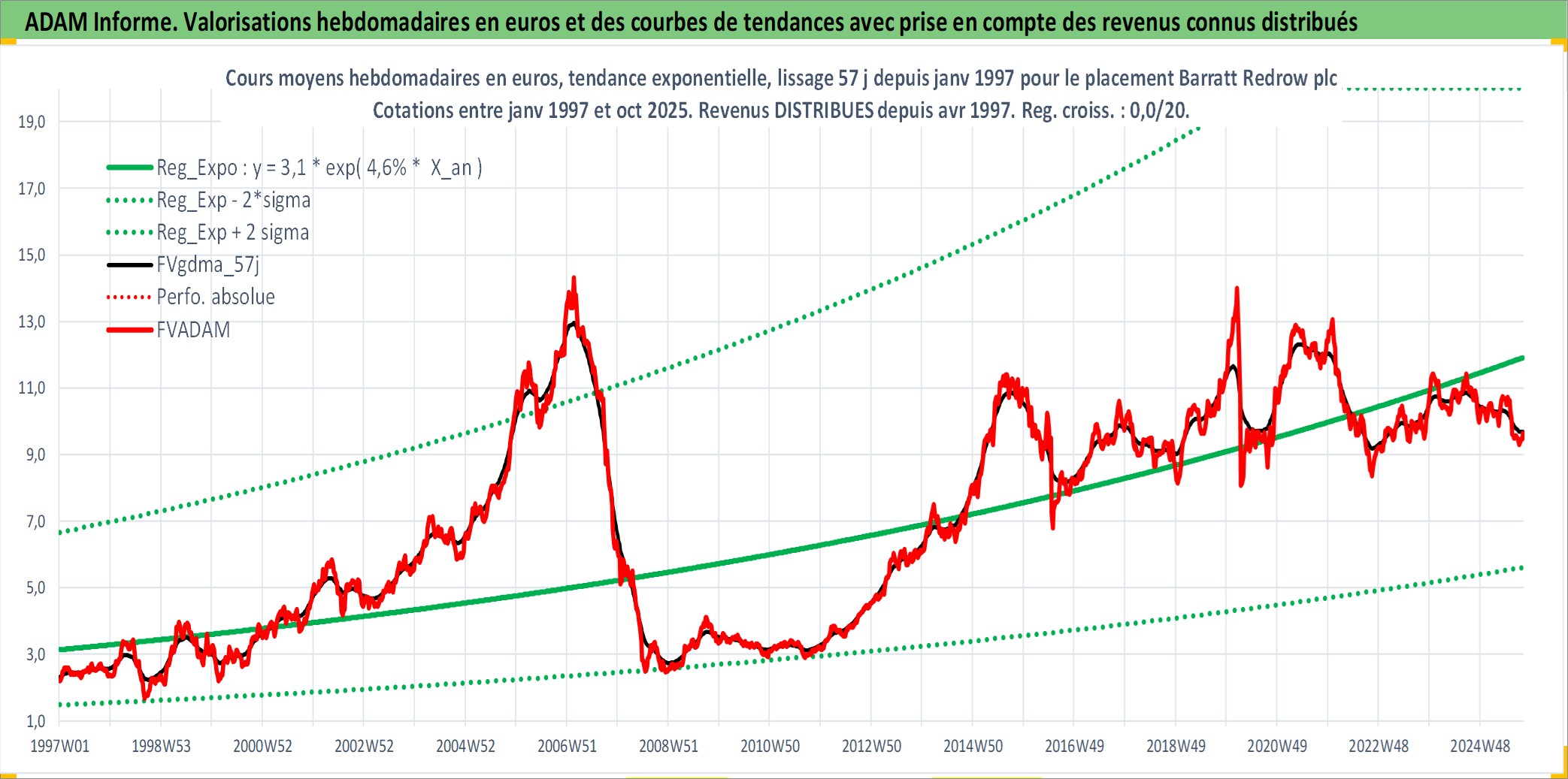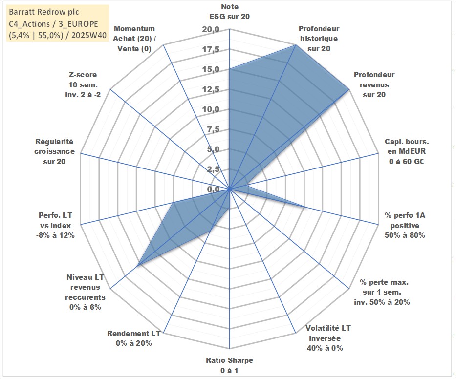 Site dédié aux investisseursPage dédiée sur site financeAnalyse des valorisations hebdomadaires de l'action Barratt Redrow plc. Cet actif est cote en GBX. Les valorisations sont en contrevaleur EURO et couvrent les semaines 1997W01 a 2025W40. Les revenus de cet actif financier sont pris en compte depuis la semaine 1997W15. La note globale ESG de cet actif est estimee a 15.0 (apres rebasage entre 0 et 20).