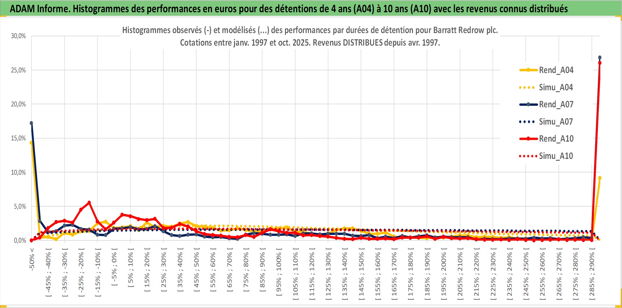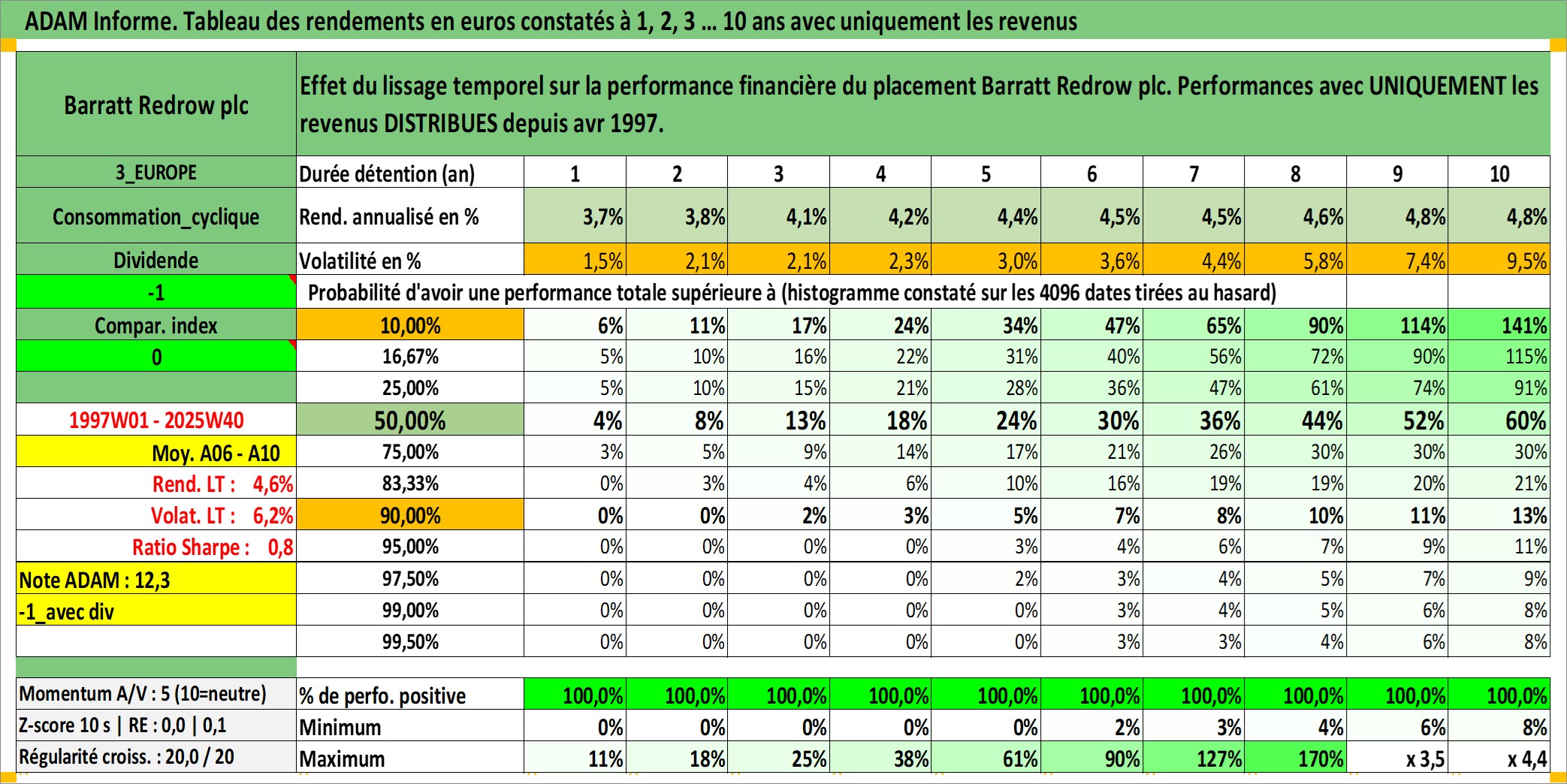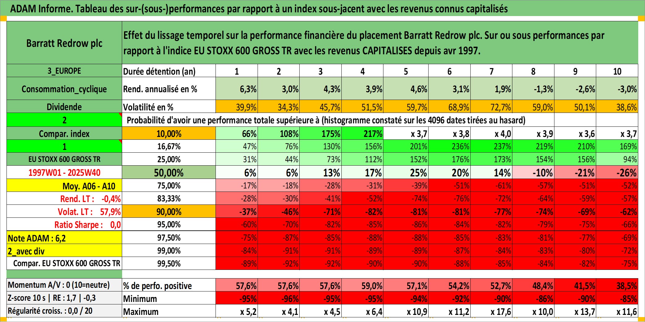 Site dédié aux investisseursPage dédiée sur site financeAnalyse des valorisations hebdomadaires de l'action Barratt Redrow plc. Cet actif est cote en GBX. Les valorisations sont en contrevaleur EURO et couvrent les semaines 1997W01 a 2025W40. Les revenus de cet actif financier sont pris en compte depuis la semaine 1997W15. La note globale ESG de cet actif est estimee a 15.0 (apres rebasage entre 0 et 20).