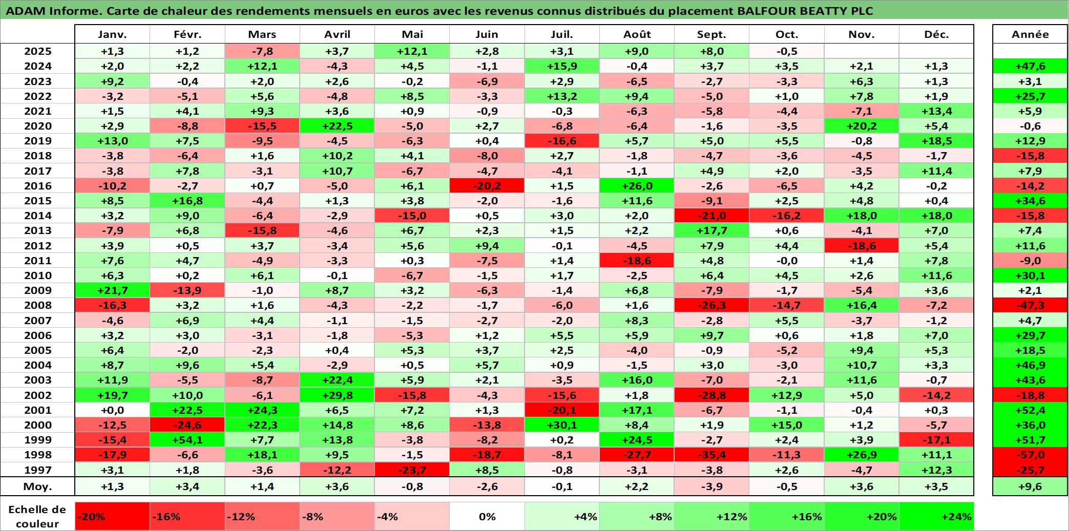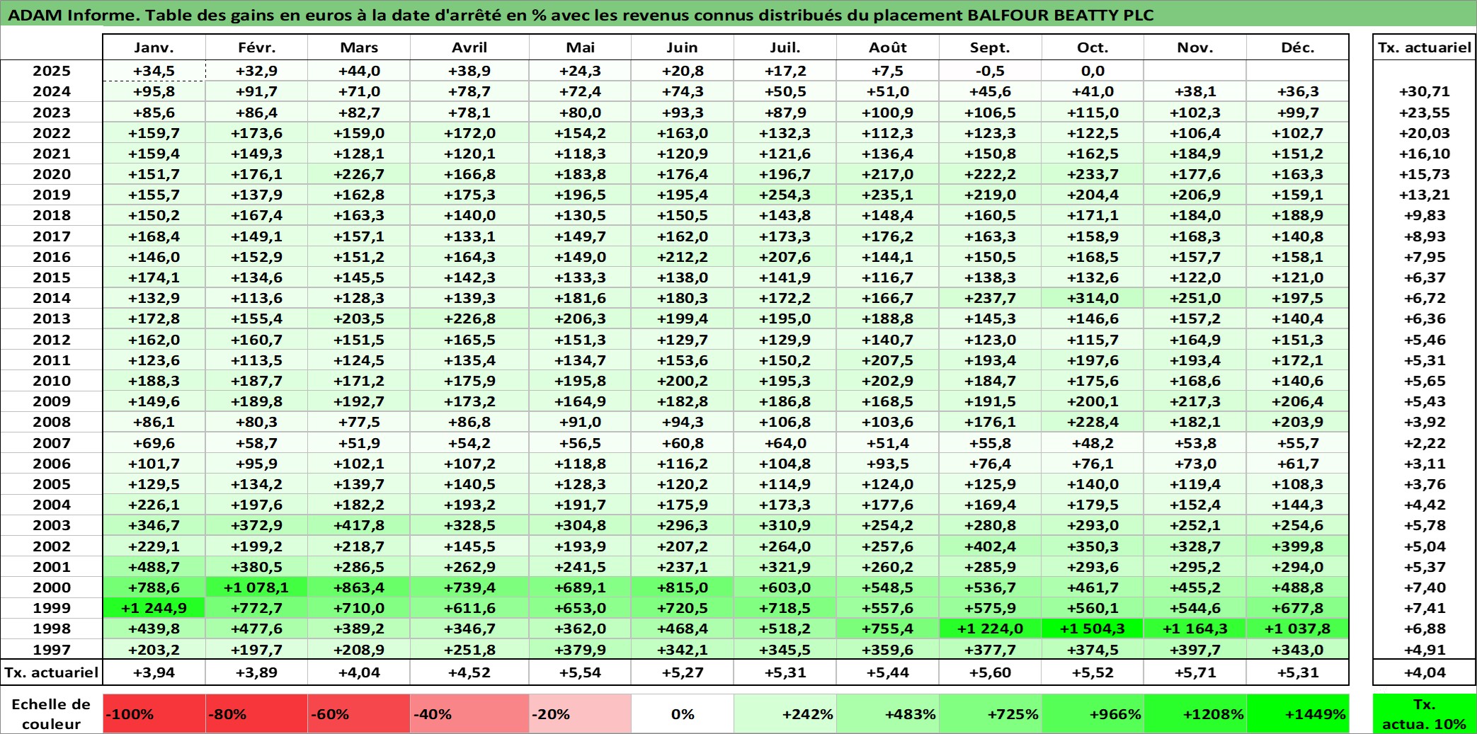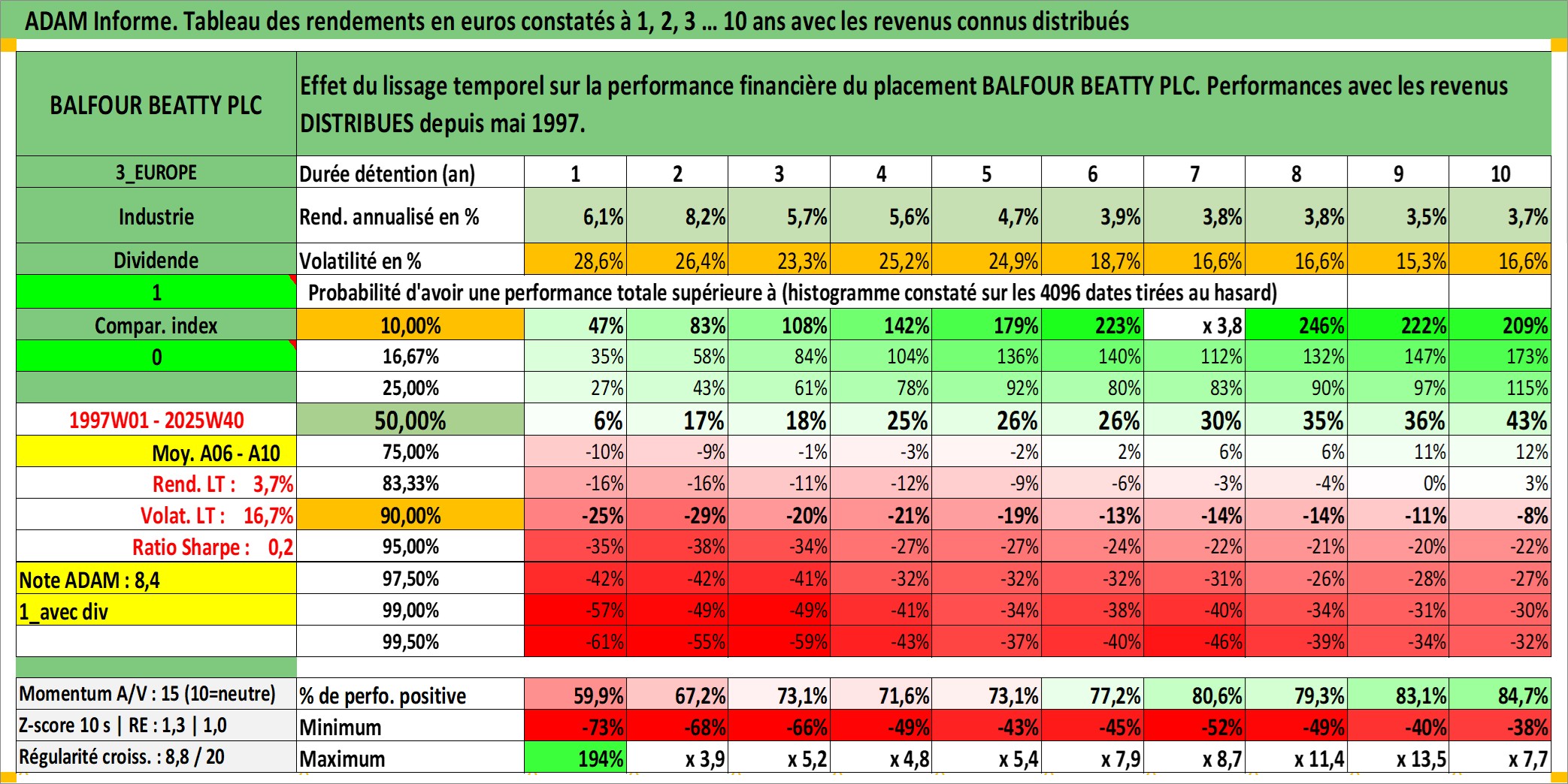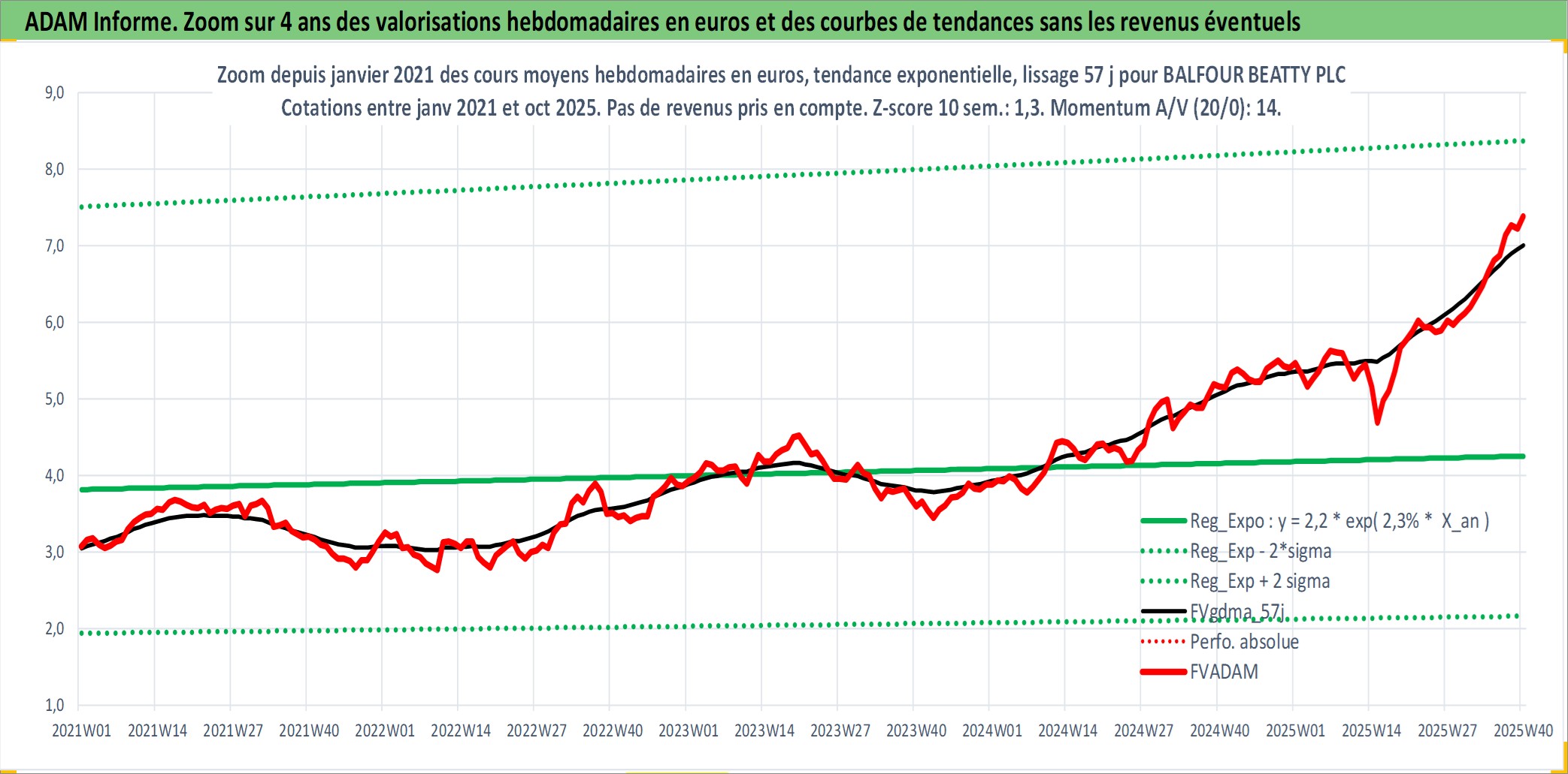 Site dédié aux investisseursPage dédiée sur site financeAnalyse des valorisations hebdomadaires de l'action BALFOUR BEATTY PLC. Cet actif est cote en GBX. Les valorisations sont en contrevaleur EURO et couvrent les semaines 1997W01 a 2025W40. Les revenus de cet actif financier sont pris en compte depuis la semaine 1997W19. La note ESG de cet actif n'est pas connue.
