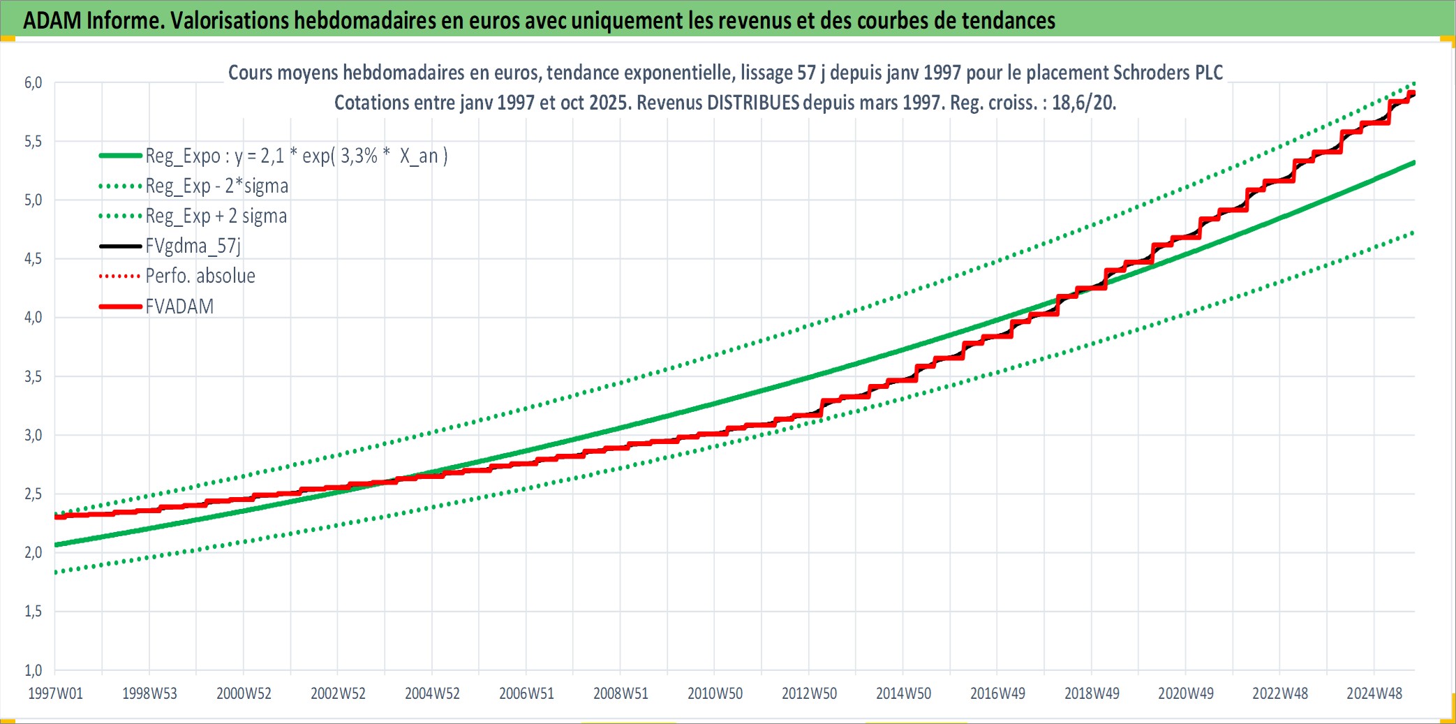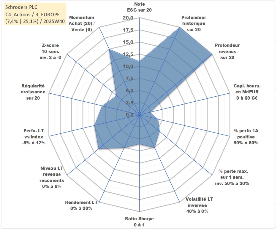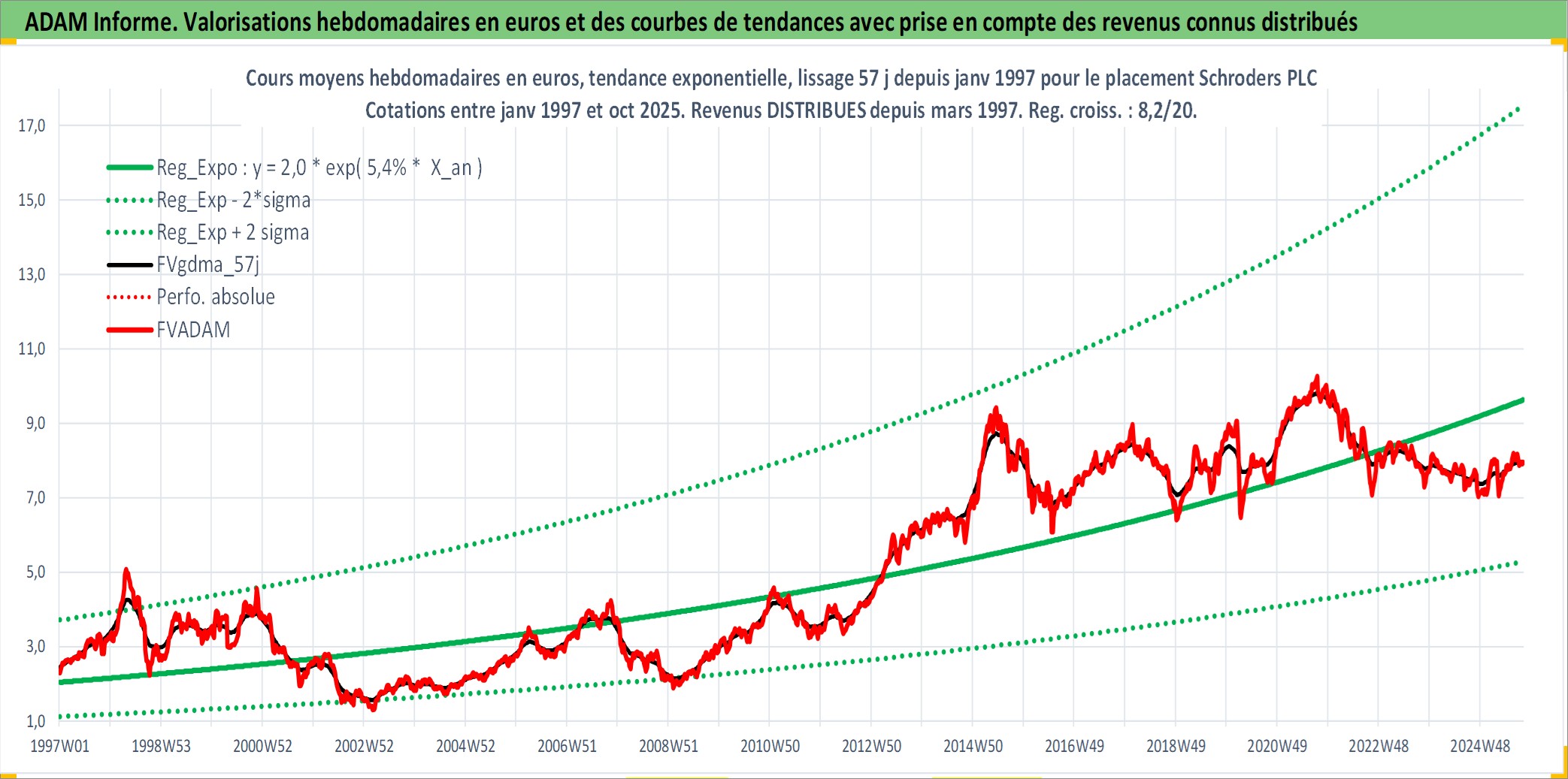 Site dédié aux investisseursPage dédiée sur site financeAnalyse des valorisations hebdomadaires de l'action Schroders PLC. Cet actif est cote en GBX. Les valorisations sont en contrevaleur EURO et couvrent les semaines 1997W01 a 2025W40. Les revenus de cet actif financier sont pris en compte depuis la semaine 1997W13. La note globale ESG de cet actif est estimee a 11.0 (apres rebasage entre 0 et 20).