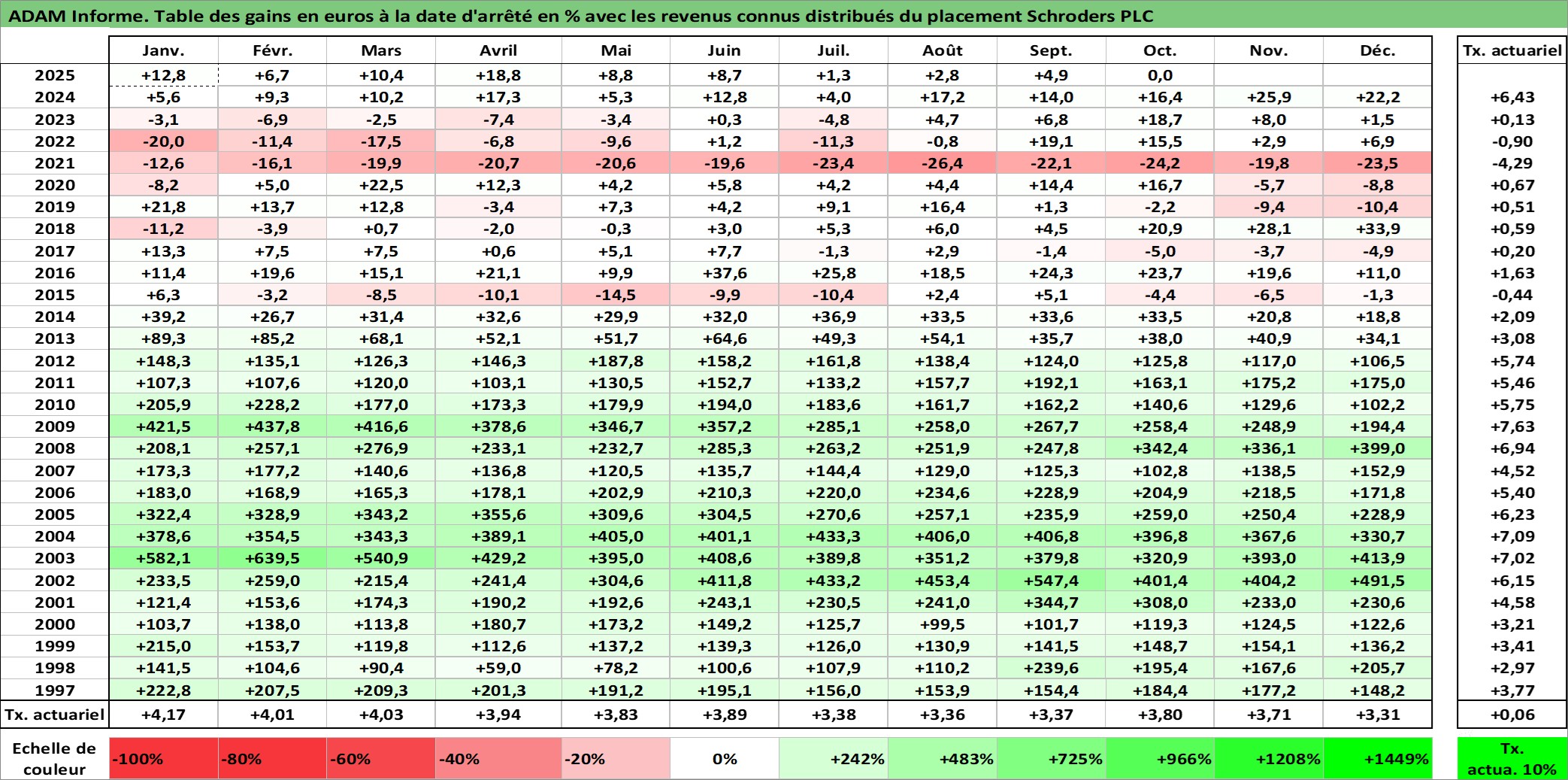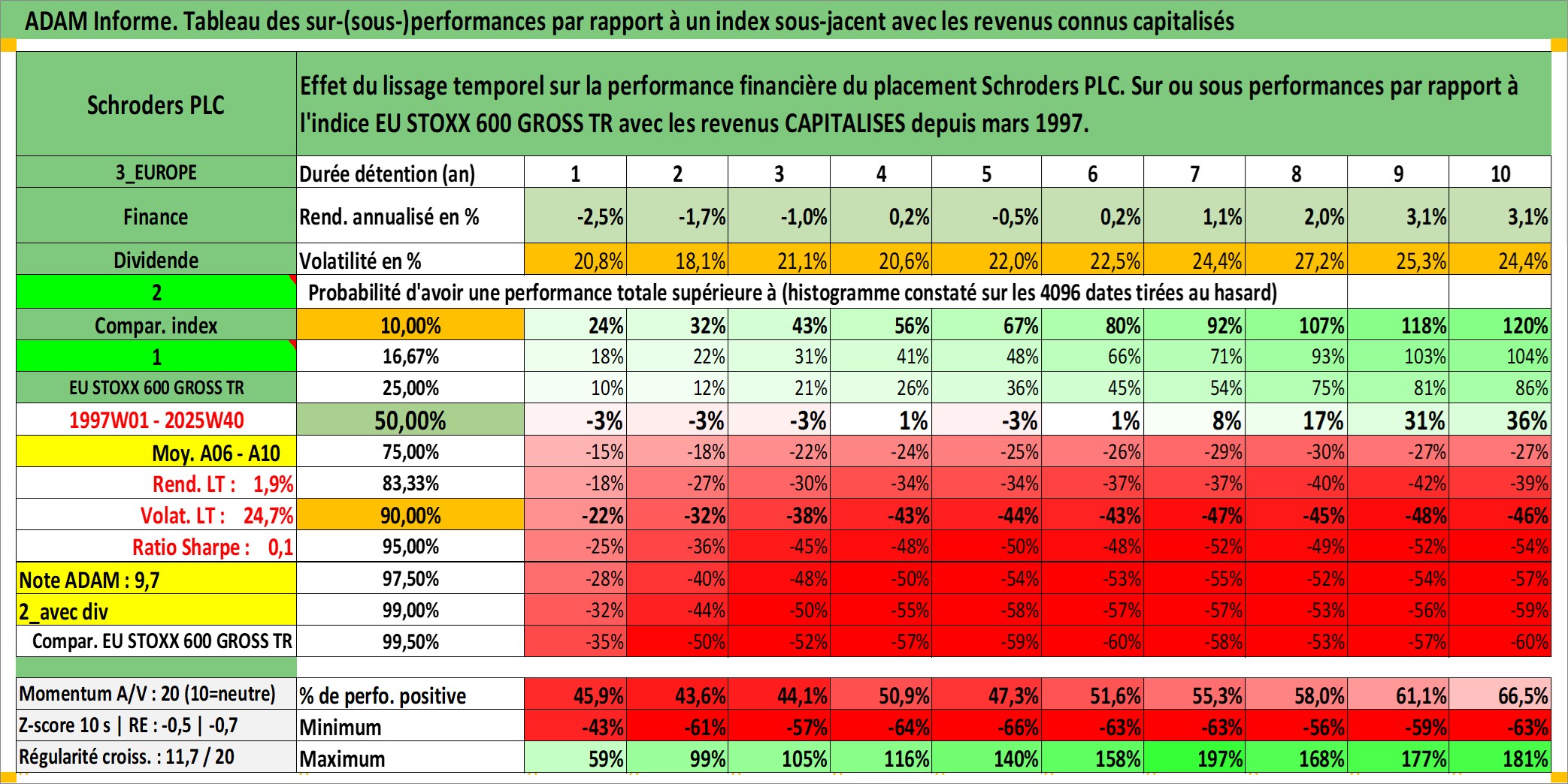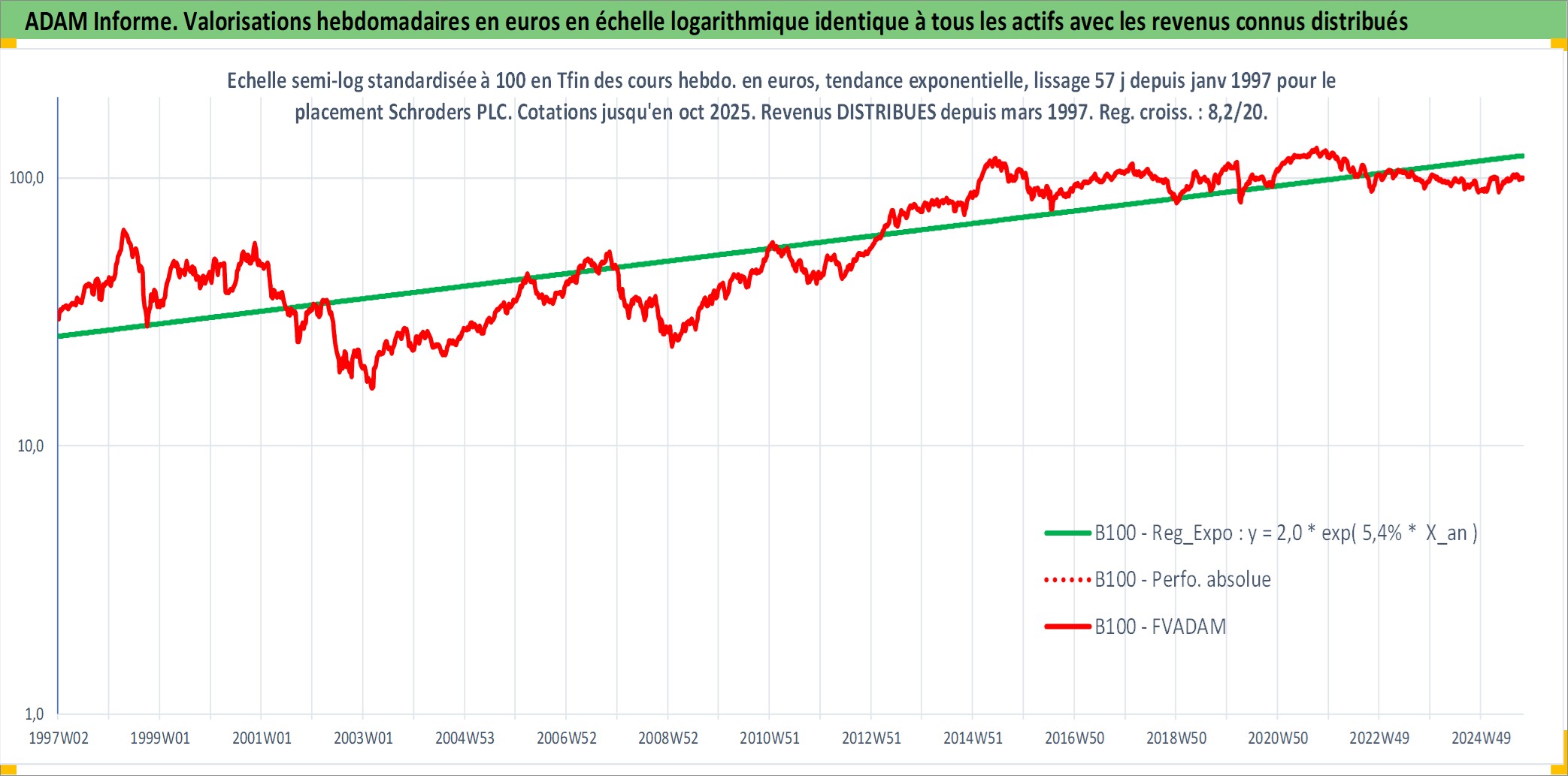 Site dédié aux investisseursPage dédiée sur site financeAnalyse des valorisations hebdomadaires de l'action Schroders PLC. Cet actif est cote en GBX. Les valorisations sont en contrevaleur EURO et couvrent les semaines 1997W01 a 2025W40. Les revenus de cet actif financier sont pris en compte depuis la semaine 1997W13. La note globale ESG de cet actif est estimee a 11.0 (apres rebasage entre 0 et 20).