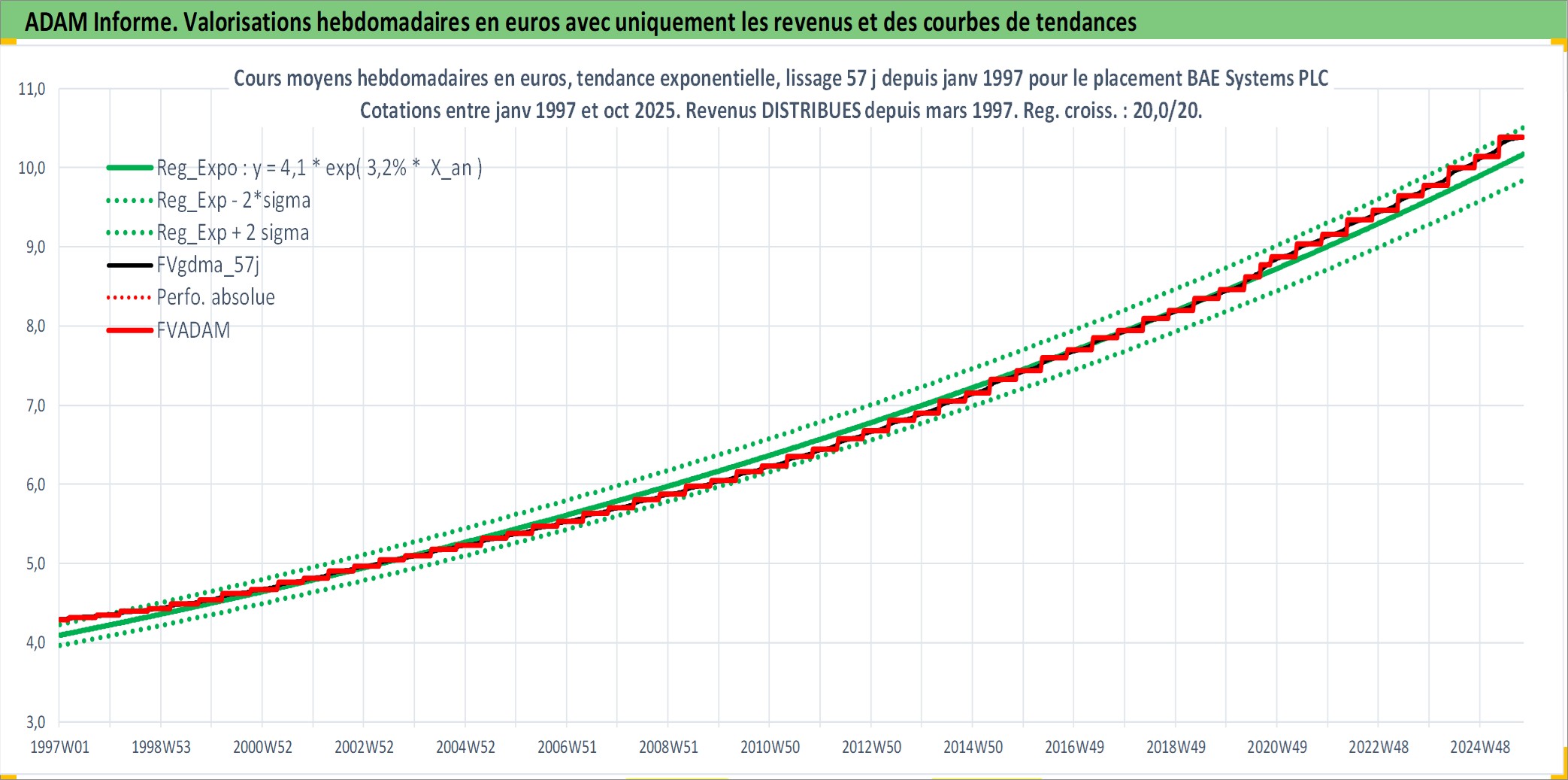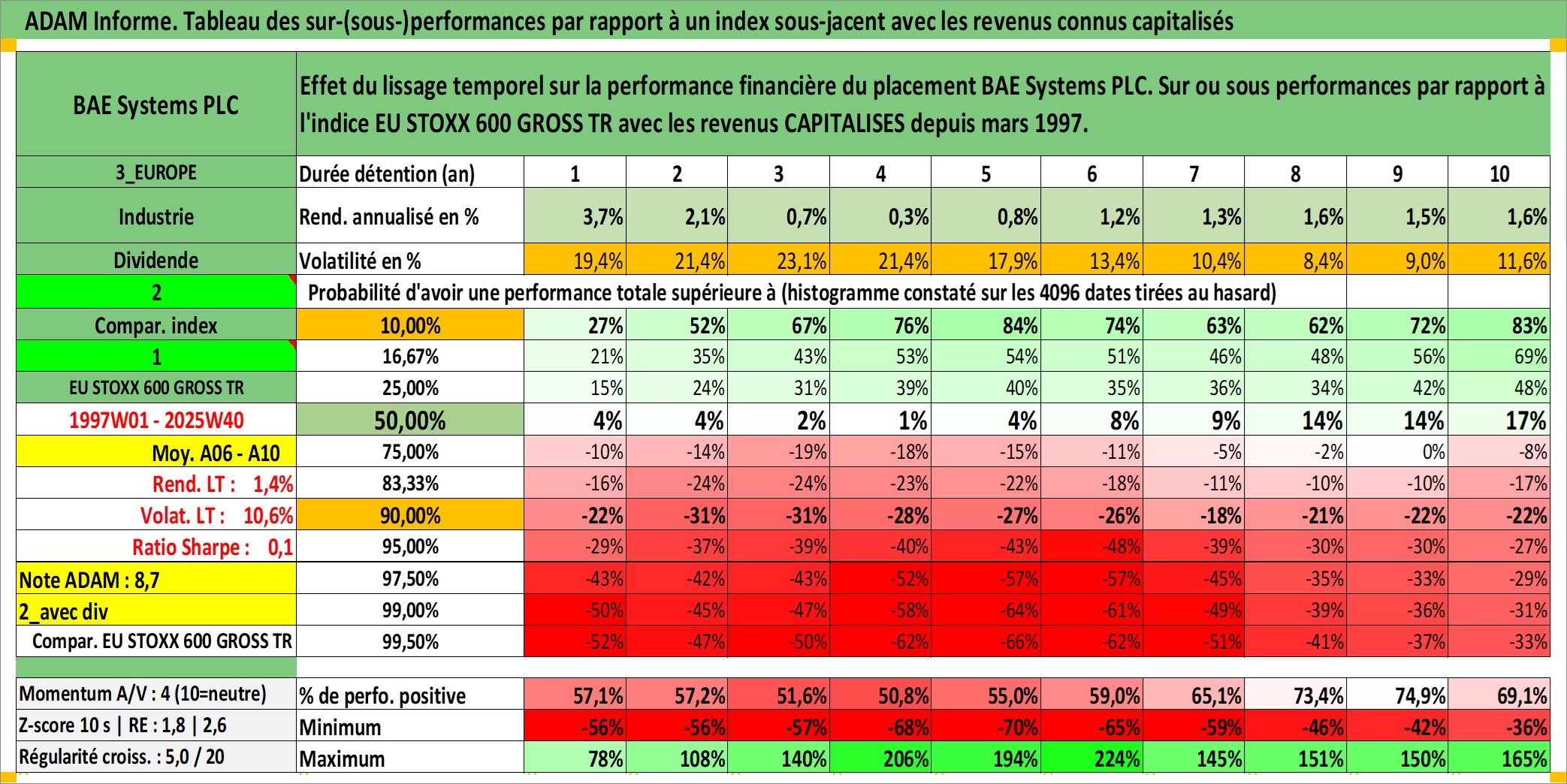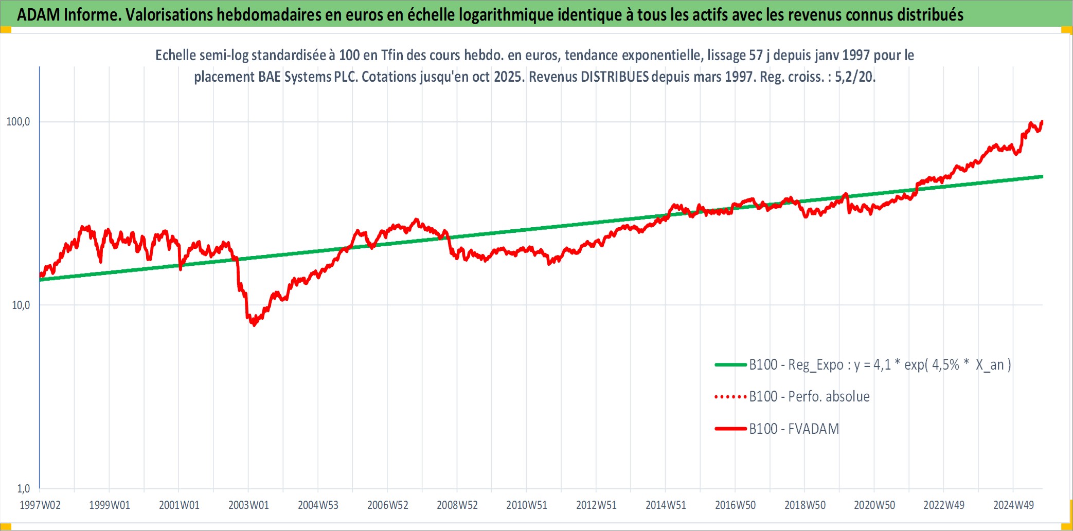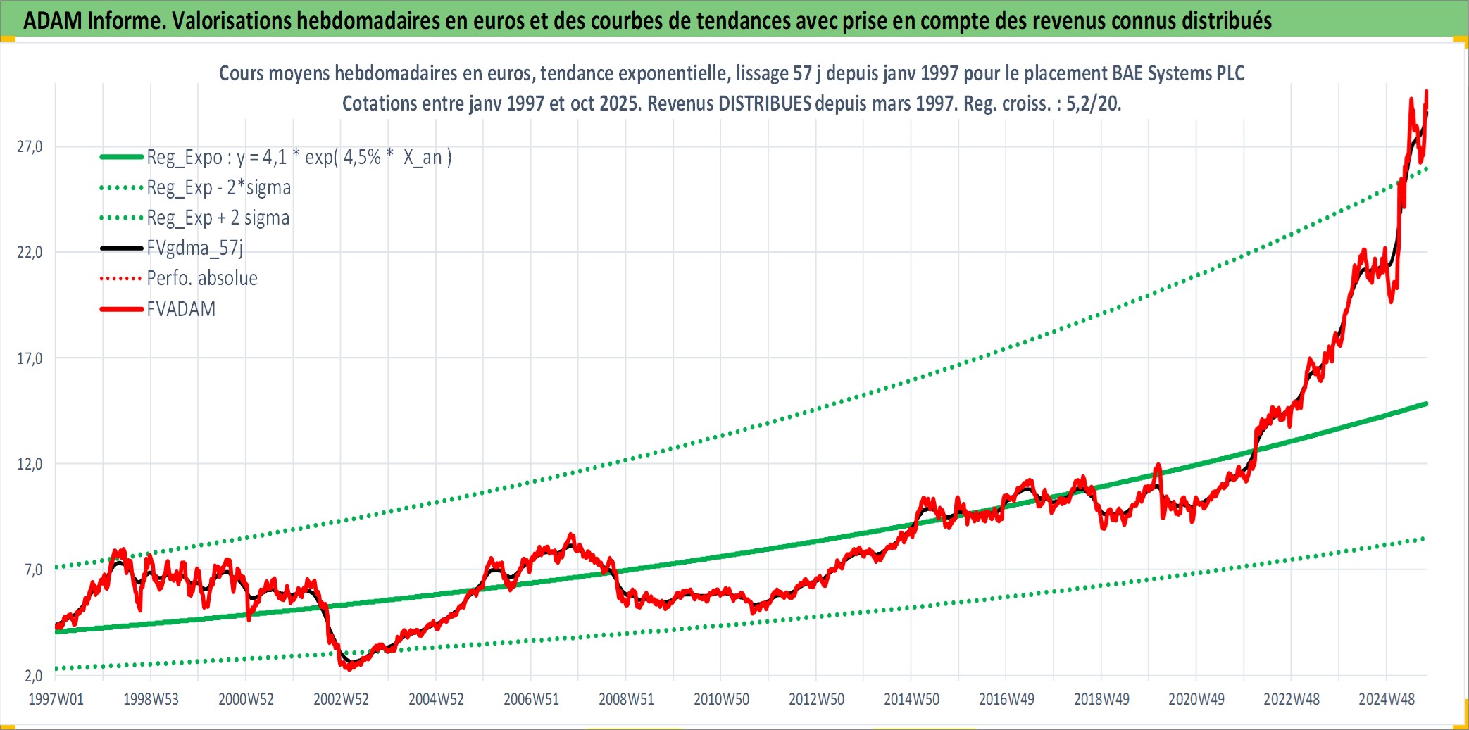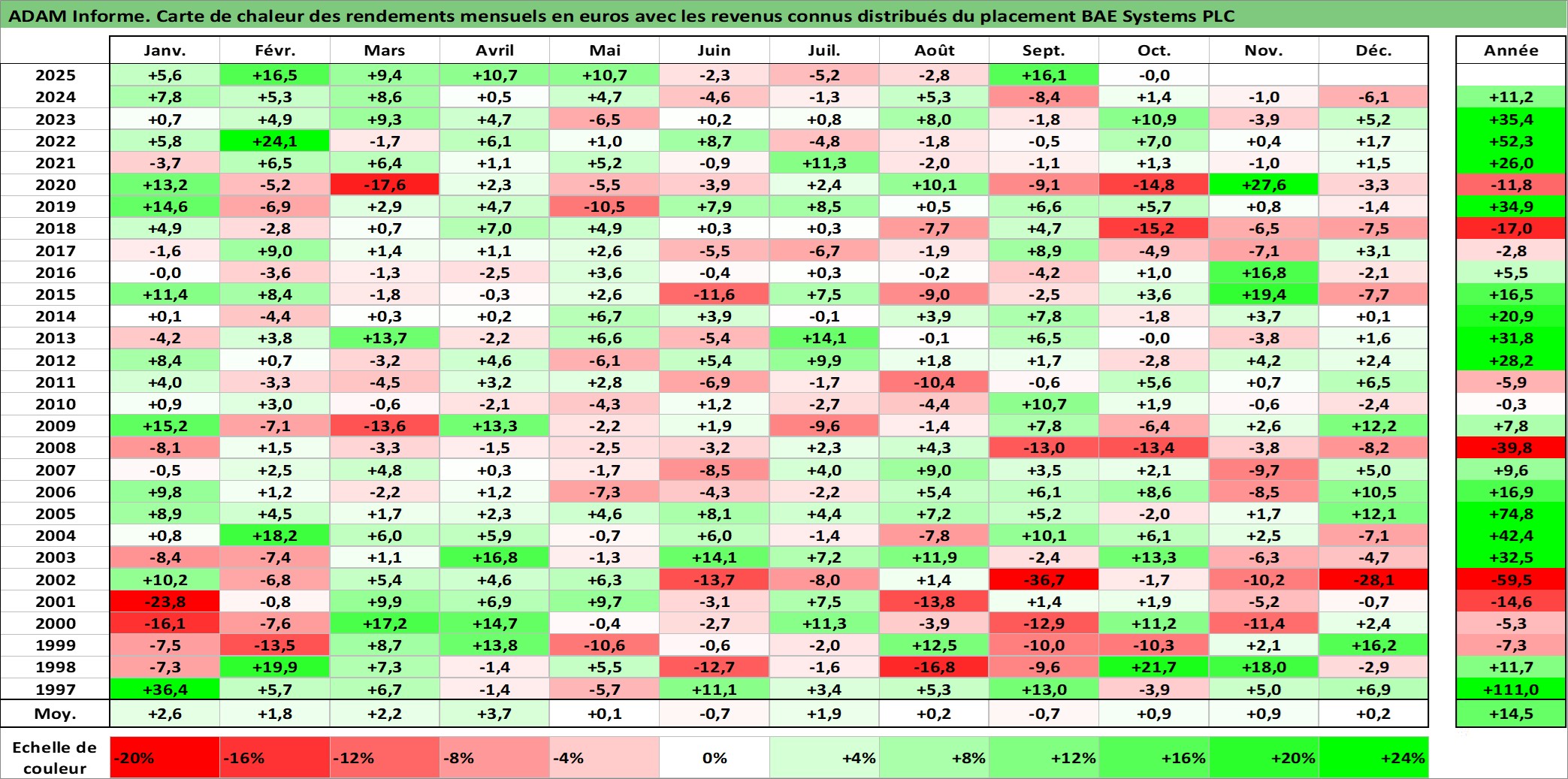Site dédié aux investisseursPage dédiée sur site financeAnalyse des valorisations hebdomadaires de l'action BAE Systems PLC. Cet actif est cote en GBX. Les valorisations sont en contrevaleur EURO et couvrent les semaines 1997W01 a 2025W40. Les revenus de cet actif financier sont pris en compte depuis la semaine 1997W11. La note globale ESG de cet actif est estimee a 5.0 (apres rebasage entre 0 et 20).