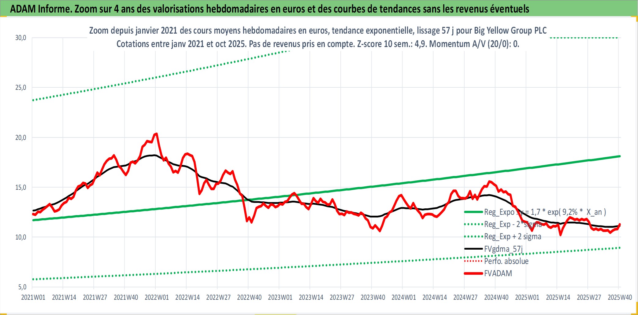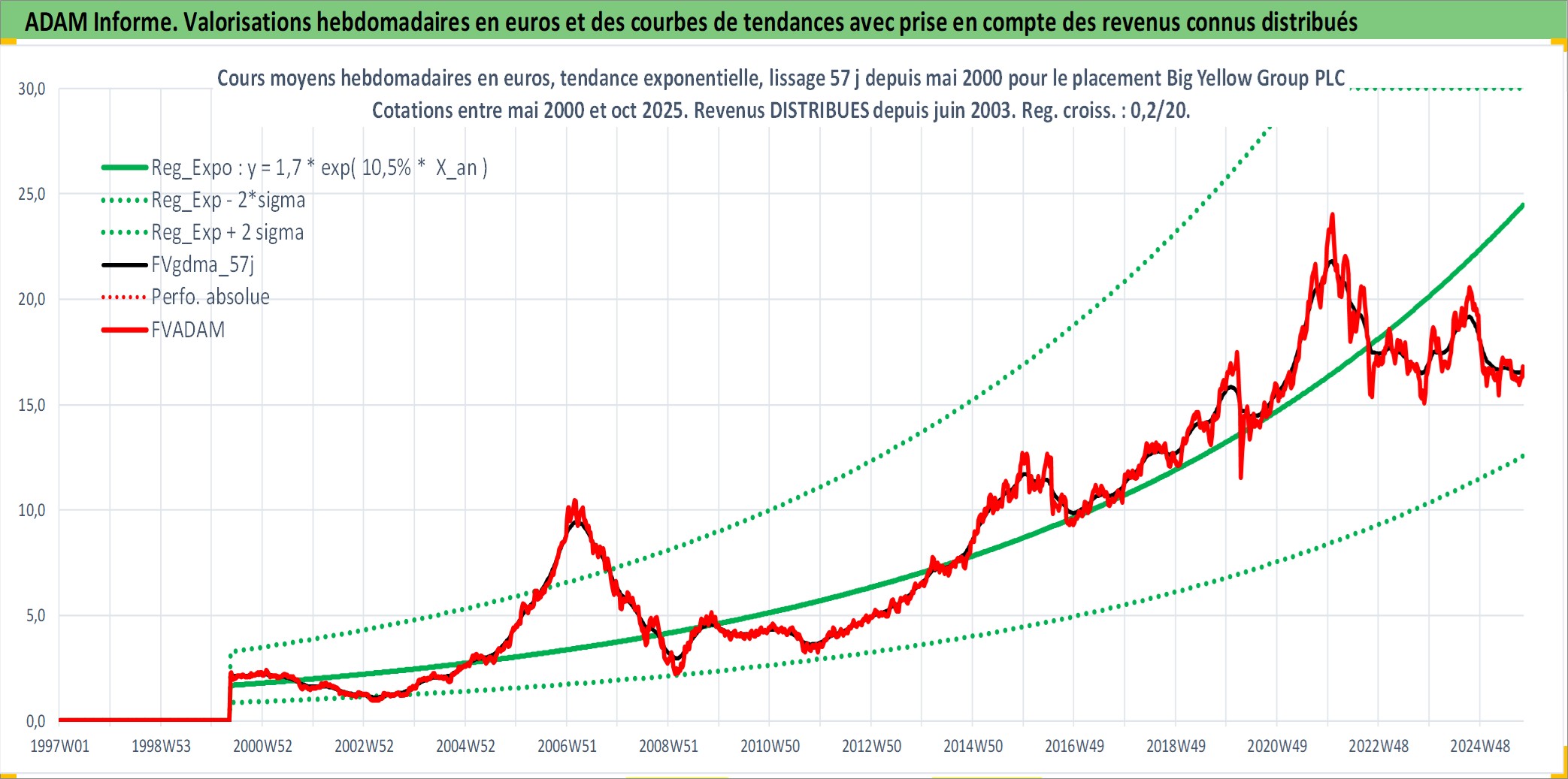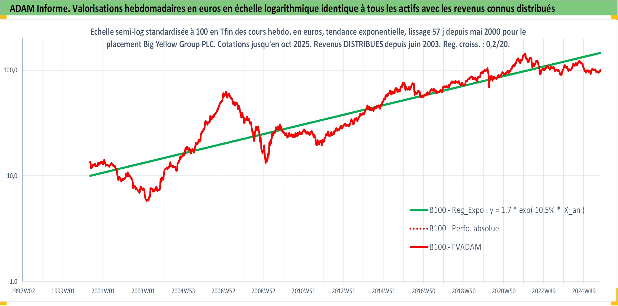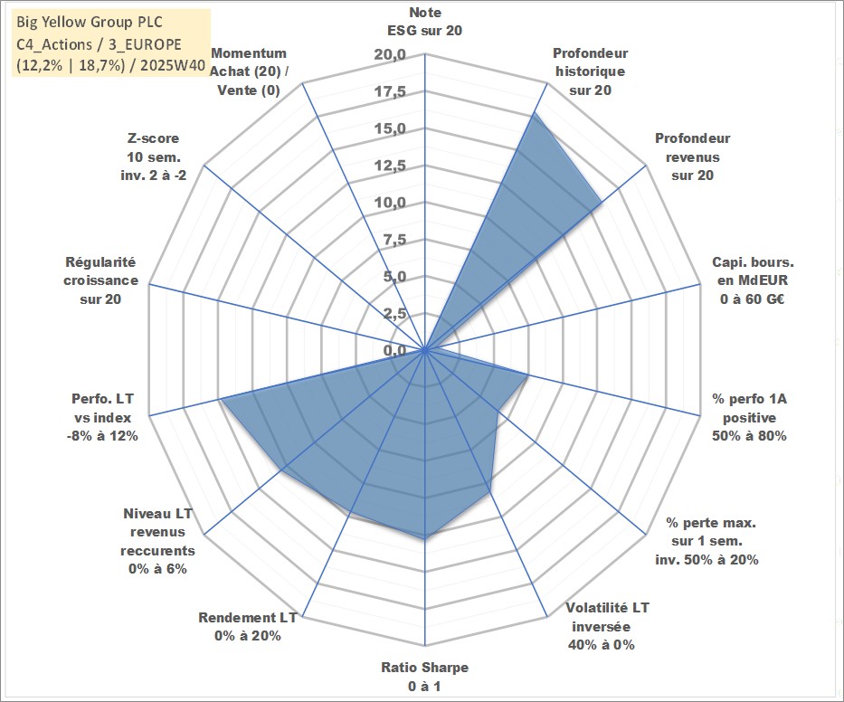 Site dédié aux investisseursPage dédiée sur site financeAnalyse des valorisations hebdomadaires de l'action Big Yellow Group PLC. Cet actif est cote en GBX. Les valorisations sont en contrevaleur EURO et couvrent les semaines 2000W19 a 2025W40. Les revenus de cet actif financier sont pris en compte depuis la semaine 2003W23. La note ESG de cet actif n'est pas connue.