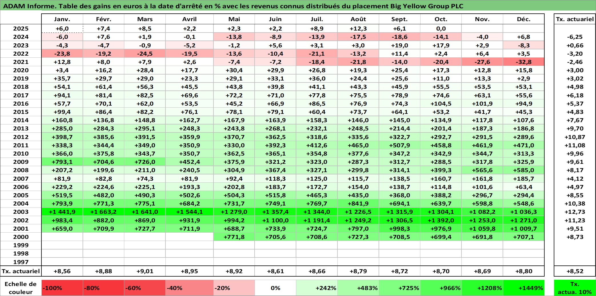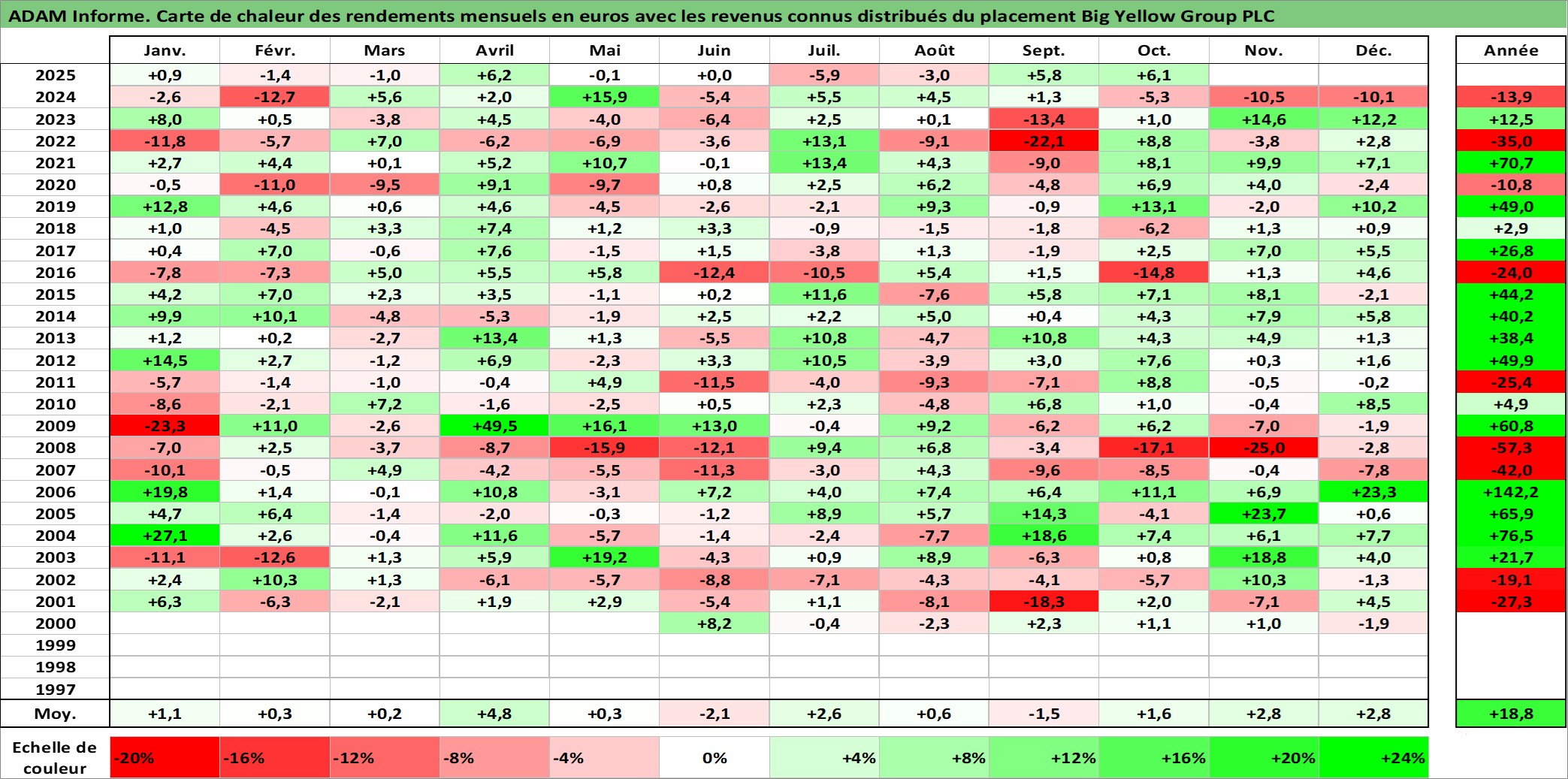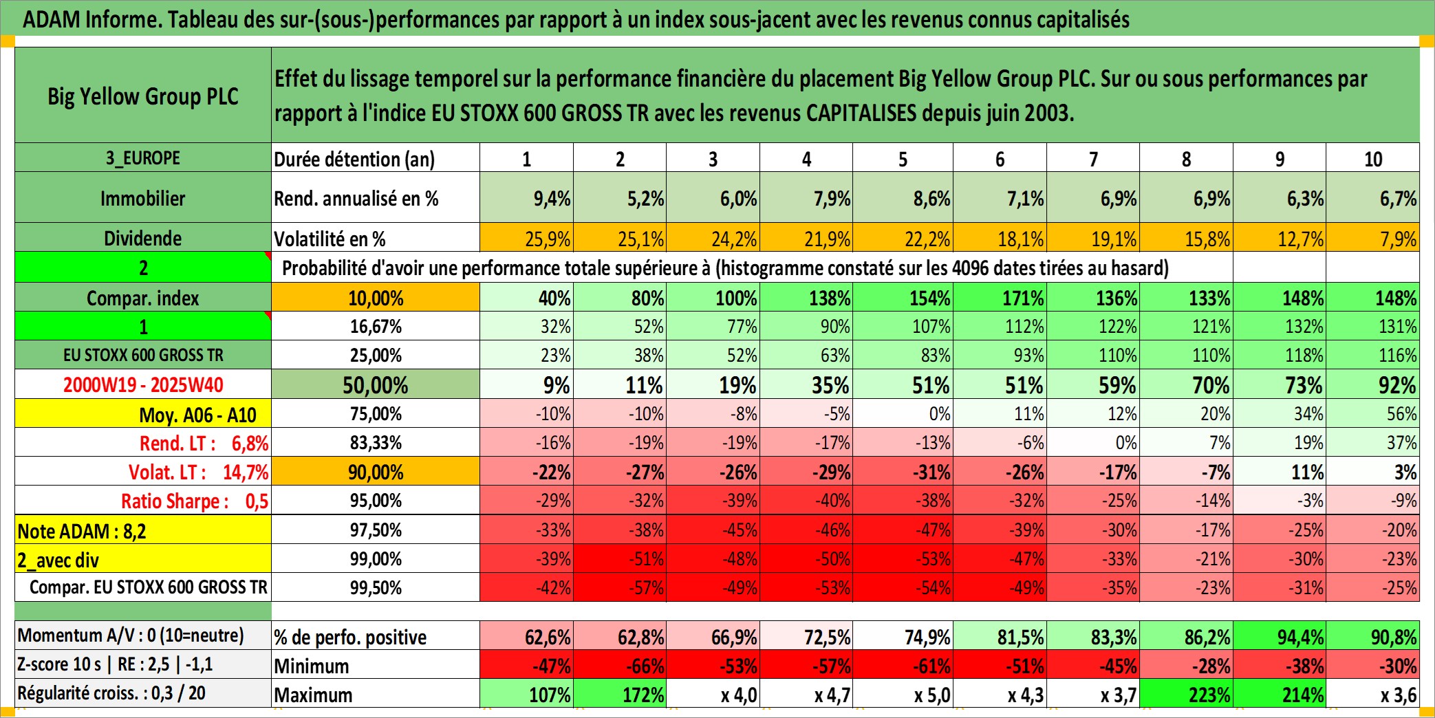 Site dédié aux investisseursPage dédiée sur site financeAnalyse des valorisations hebdomadaires de l'action Big Yellow Group PLC. Cet actif est cote en GBX. Les valorisations sont en contrevaleur EURO et couvrent les semaines 2000W19 a 2025W40. Les revenus de cet actif financier sont pris en compte depuis la semaine 2003W23. La note ESG de cet actif n'est pas connue.