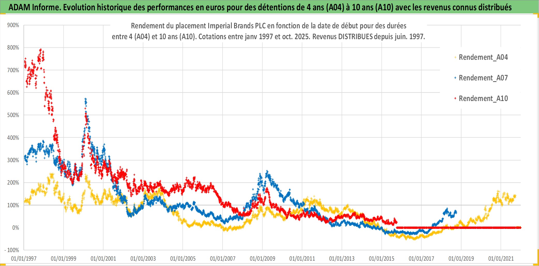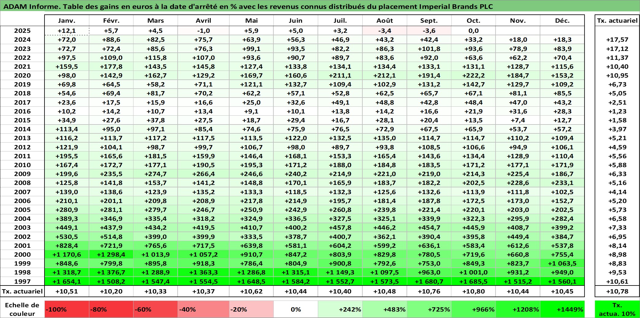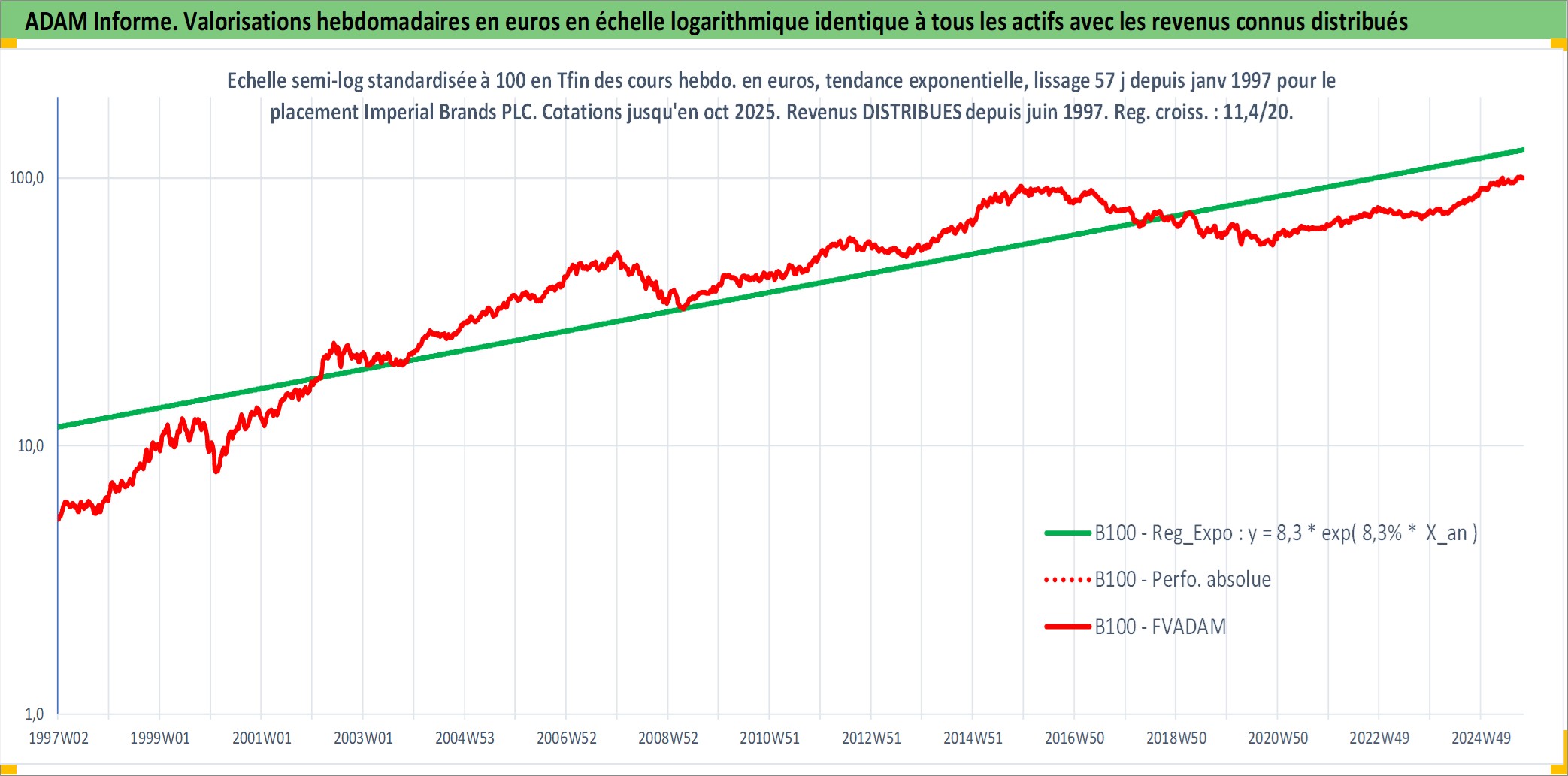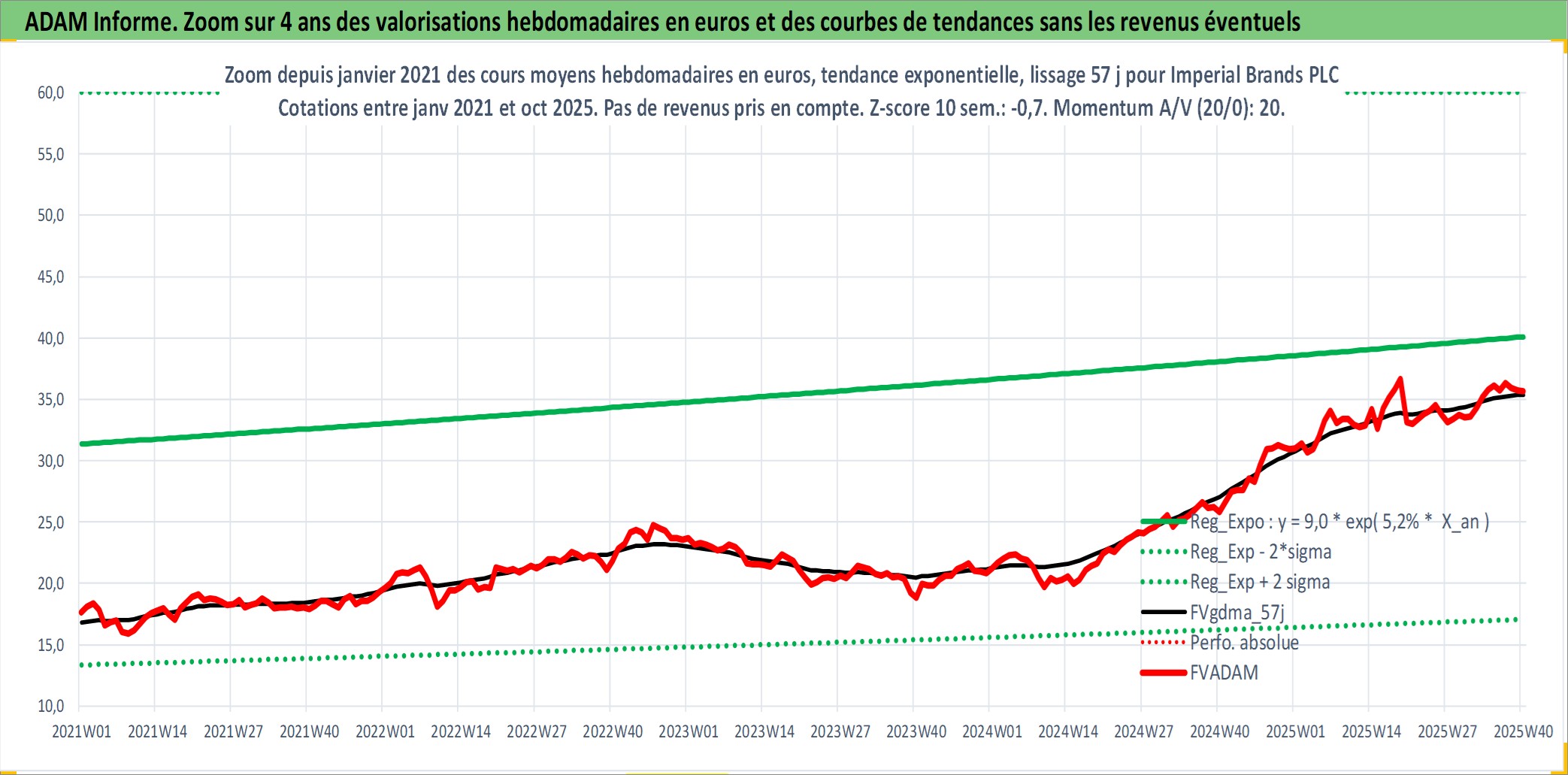 Site dédié aux investisseursPage dédiée sur site financeAnalyse des valorisations hebdomadaires de l'action Imperial Brands PLC. Cet actif est cote en GBX. Les valorisations sont en contrevaleur EURO et couvrent les semaines 1997W01 a 2025W40. Les revenus de cet actif financier sont pris en compte depuis la semaine 1997W23. La note globale ESG de cet actif est estimee a 6.0 (apres rebasage entre 0 et 20).