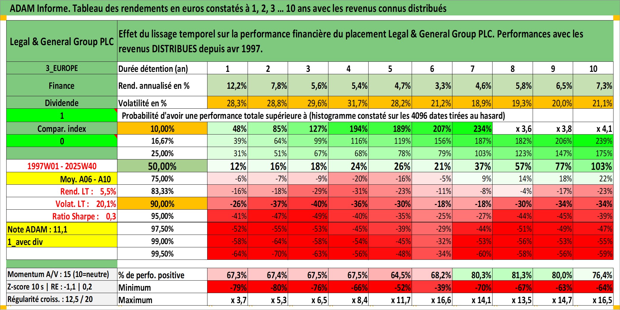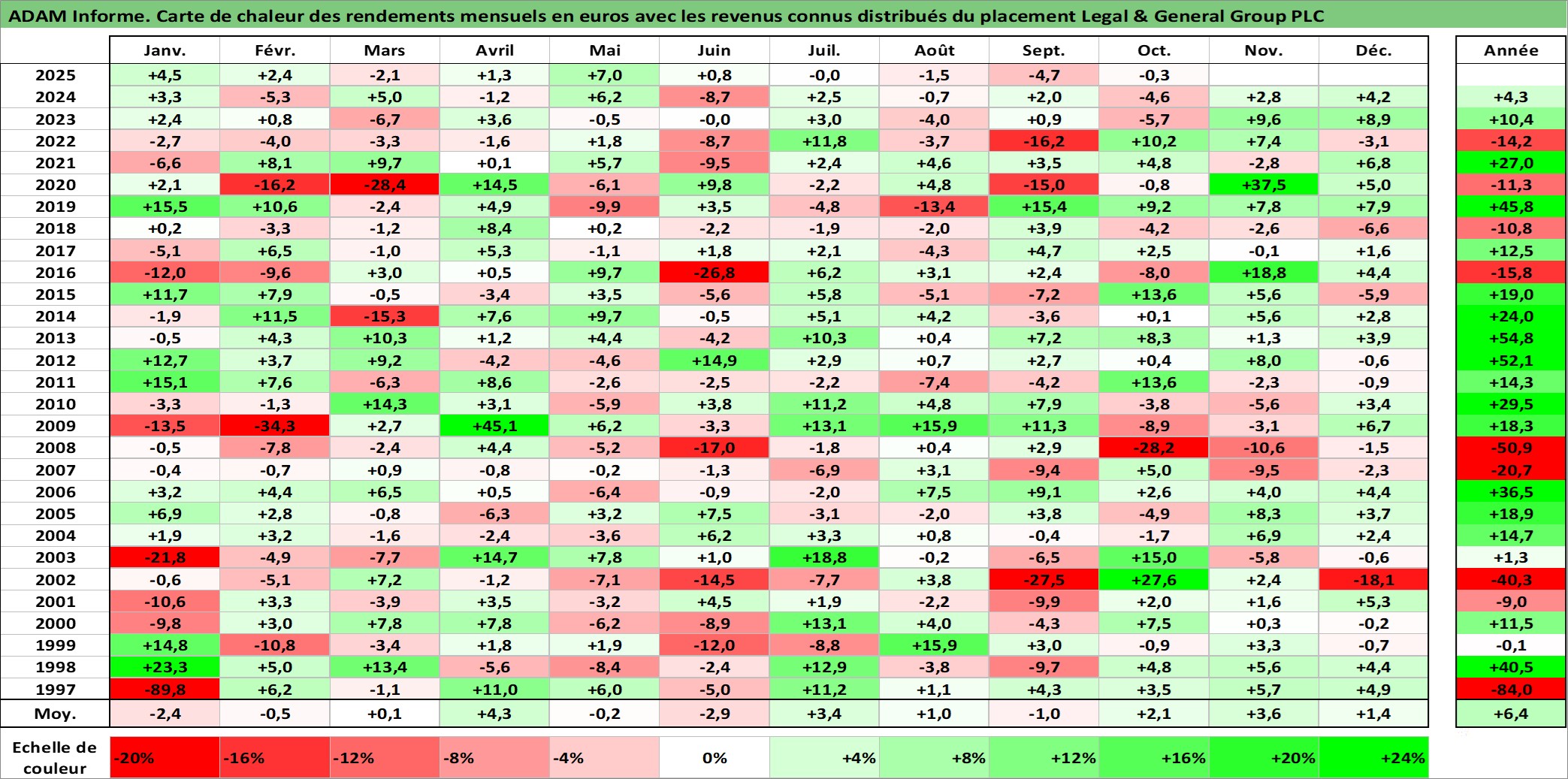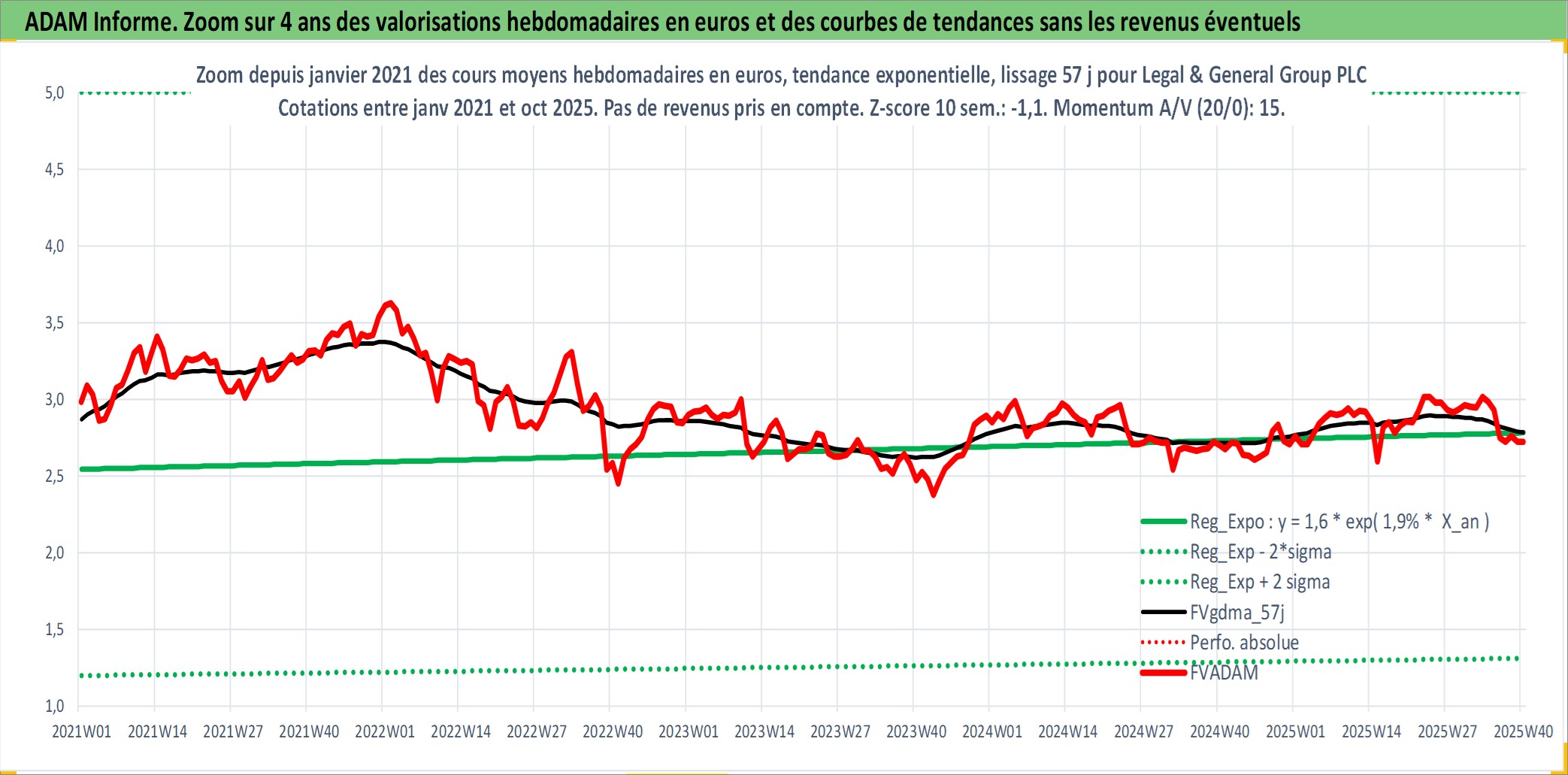 Site dédié aux investisseursPage dédiée sur site financeAnalyse des valorisations hebdomadaires de l'action Legal & General Group PLC. Cet actif est cote en GBX. Les valorisations sont en contrevaleur EURO et couvrent les semaines 1997W01 a 2025W40. Les revenus de cet actif financier sont pris en compte depuis la semaine 1997W18. La note globale ESG de cet actif est estimee a 12.0 (apres rebasage entre 0 et 20).