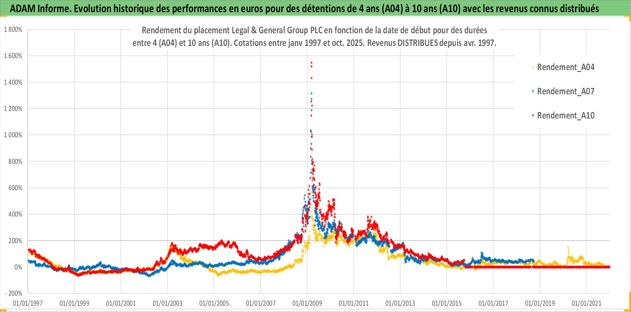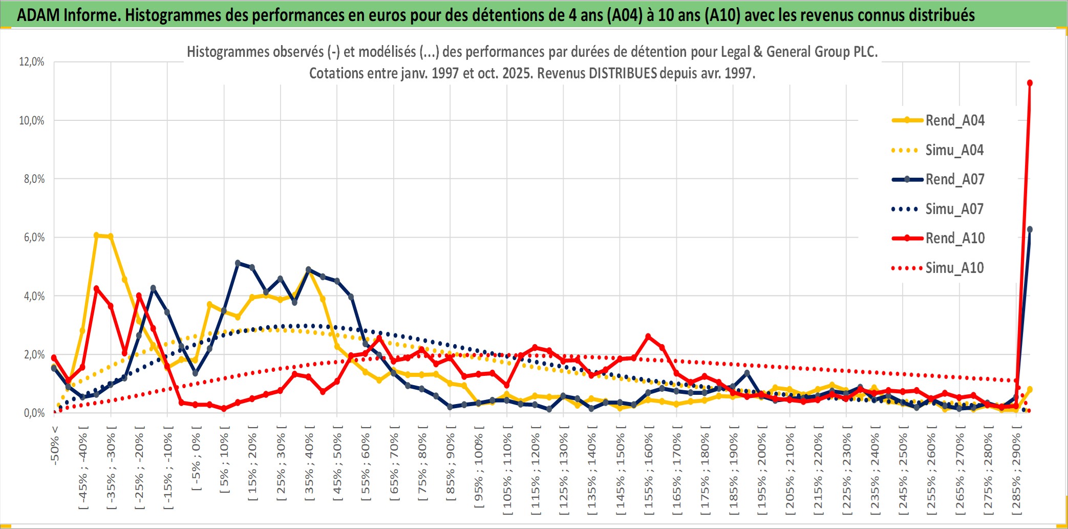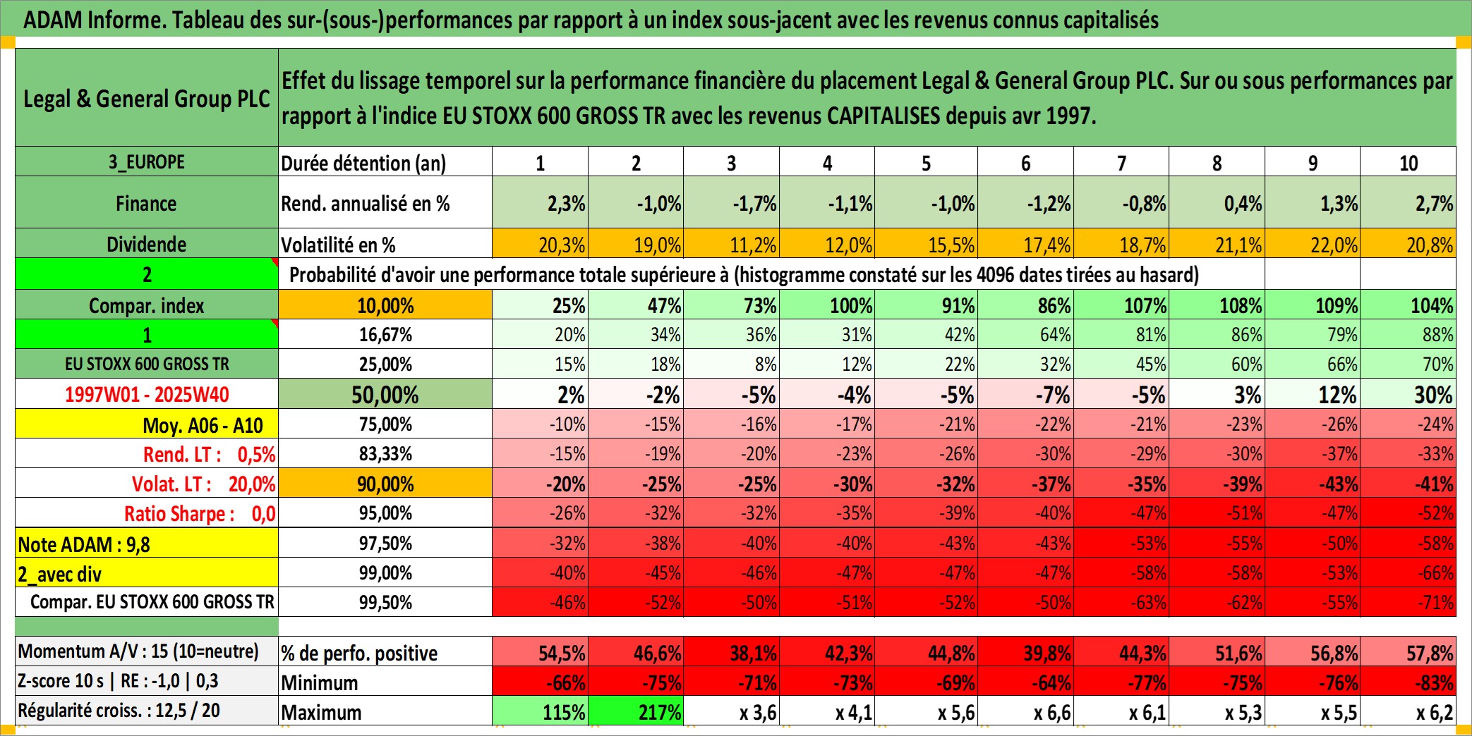 Site dédié aux investisseursPage dédiée sur site financeAnalyse des valorisations hebdomadaires de l'action Legal & General Group PLC. Cet actif est cote en GBX. Les valorisations sont en contrevaleur EURO et couvrent les semaines 1997W01 a 2025W40. Les revenus de cet actif financier sont pris en compte depuis la semaine 1997W18. La note globale ESG de cet actif est estimee a 12.0 (apres rebasage entre 0 et 20).
