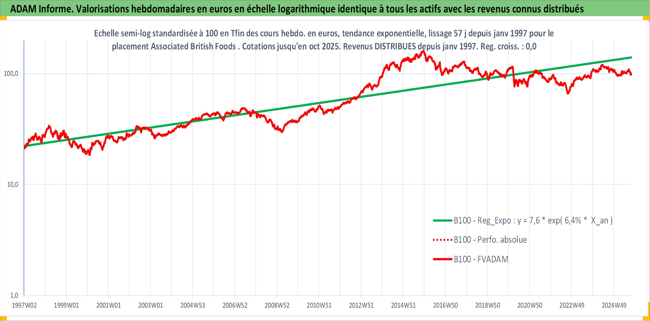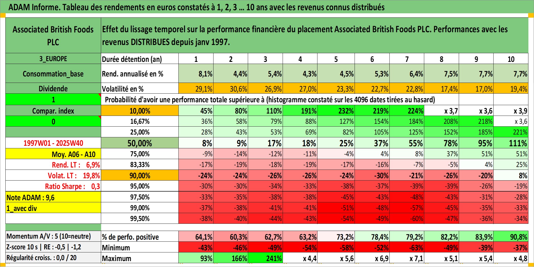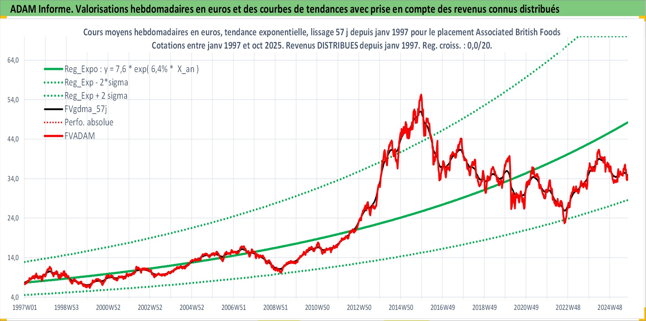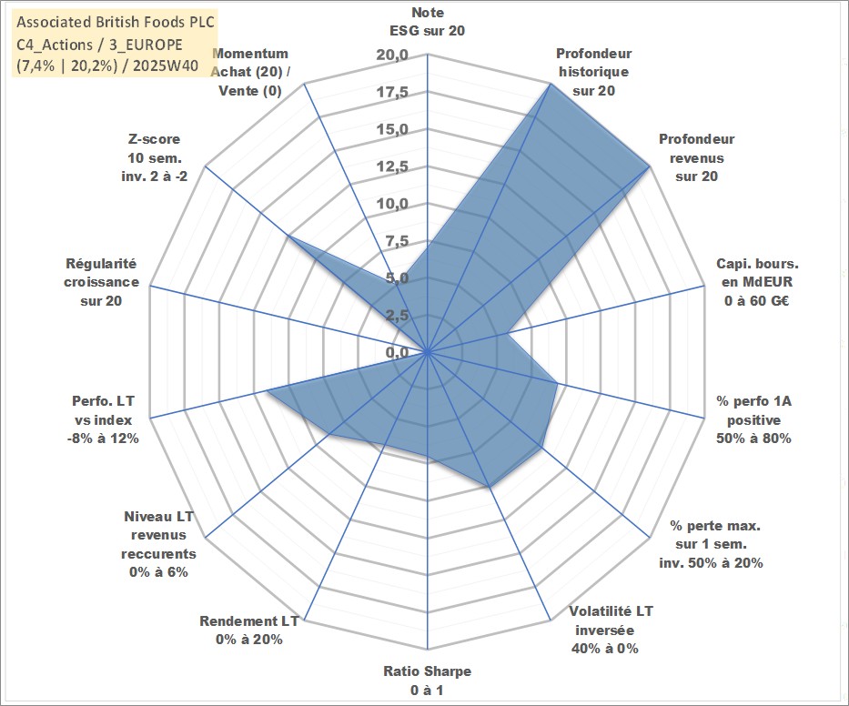 Site dédié aux investisseursPage dédiée sur site financeAnalyse des valorisations hebdomadaires de l'action Associated British Foods PLC. Cet actif est cote en GBX. Les valorisations sont en contrevaleur EURO et couvrent les semaines 1997W01 a 2025W40. Les revenus de cet actif financier sont pris en compte depuis la semaine 1997W05. La note globale ESG de cet actif est estimee a 7.0 (apres rebasage entre 0 et 20).