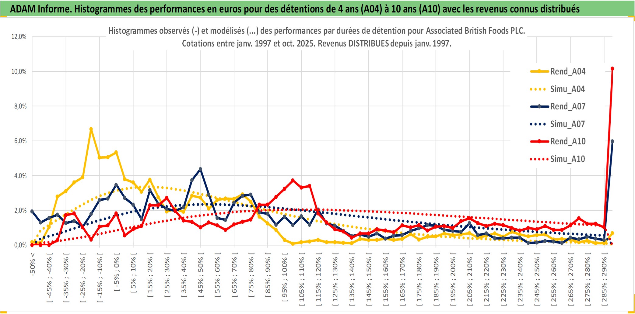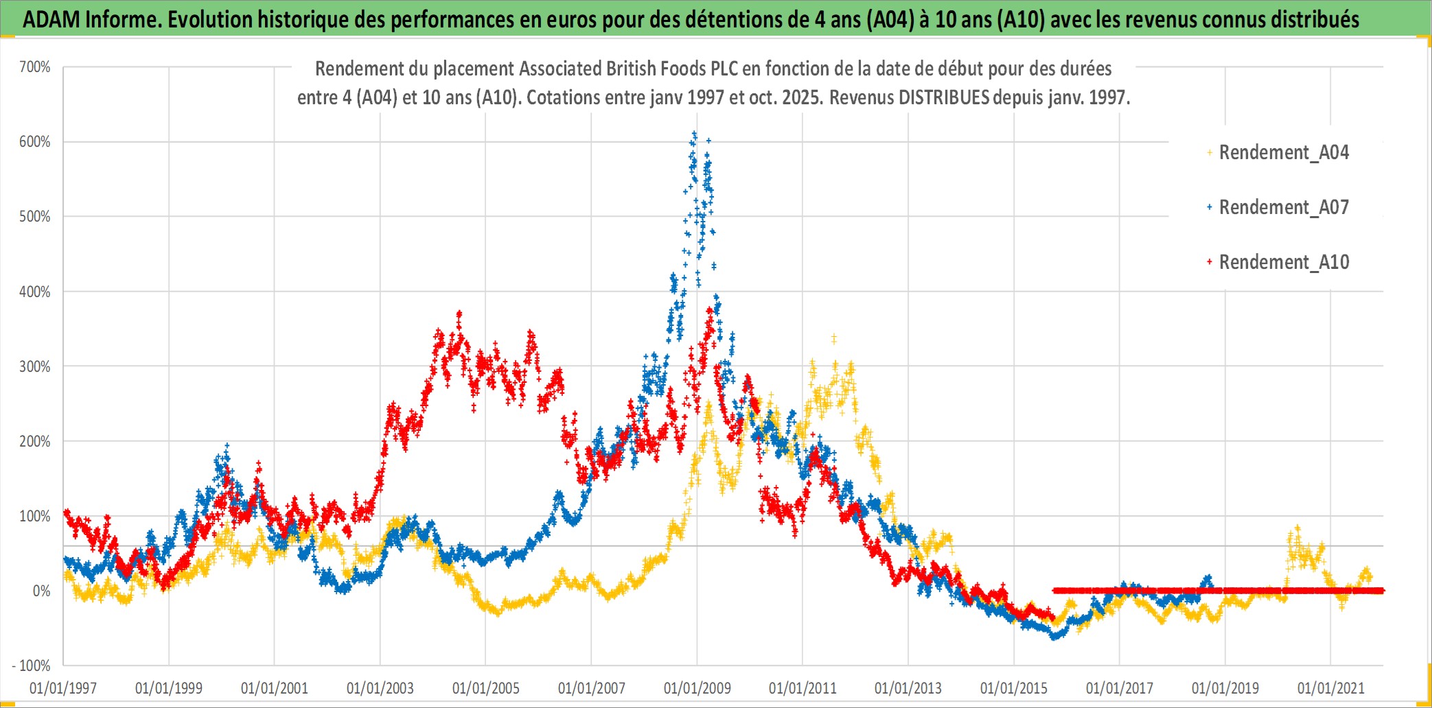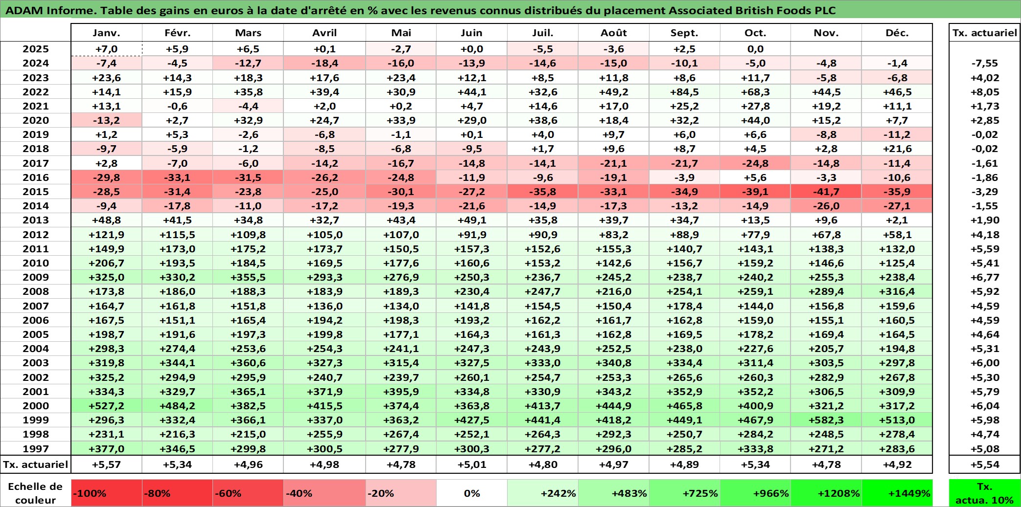 Site dédié aux investisseursPage dédiée sur site financeAnalyse des valorisations hebdomadaires de l'action Associated British Foods PLC. Cet actif est cote en GBX. Les valorisations sont en contrevaleur EURO et couvrent les semaines 1997W01 a 2025W40. Les revenus de cet actif financier sont pris en compte depuis la semaine 1997W05. La note globale ESG de cet actif est estimee a 7.0 (apres rebasage entre 0 et 20).