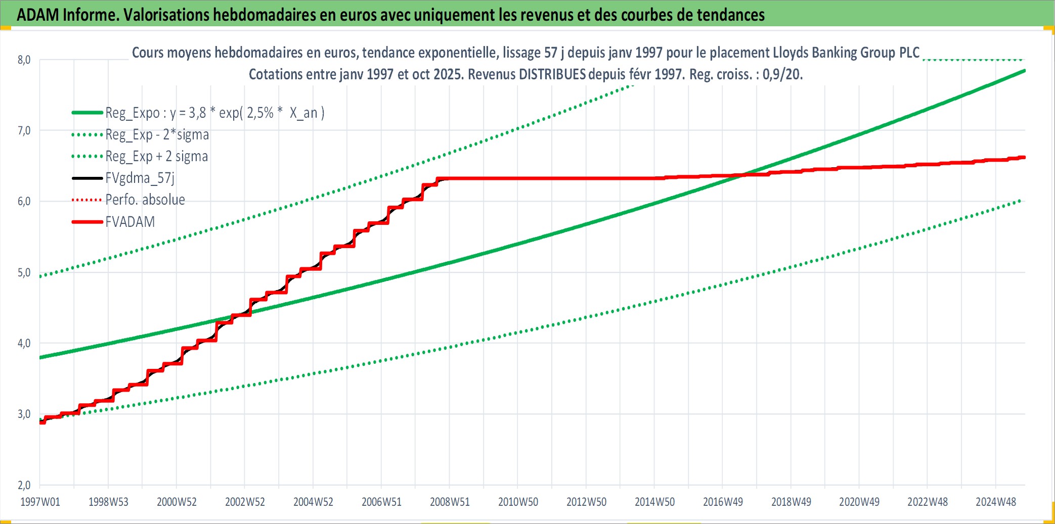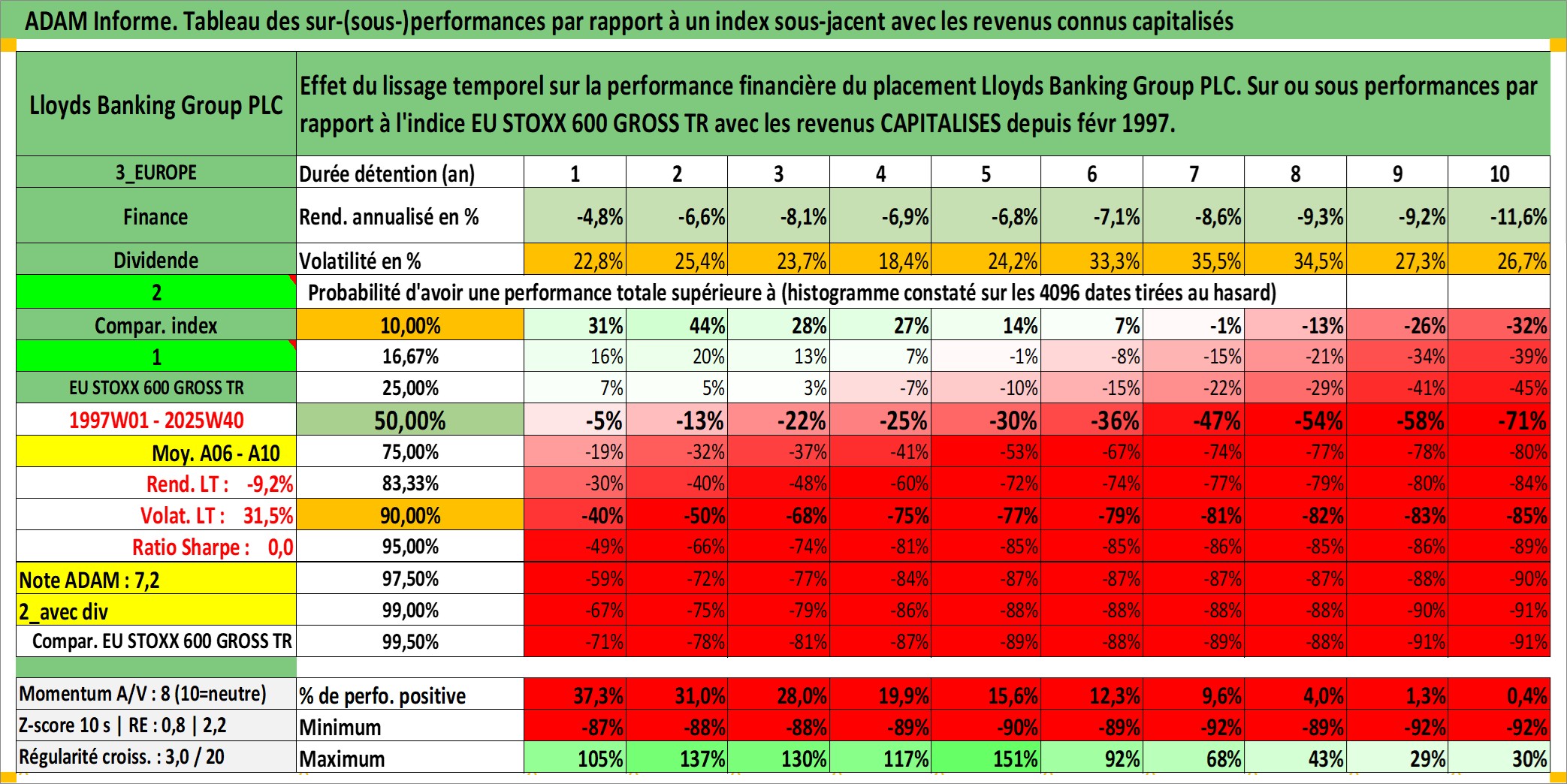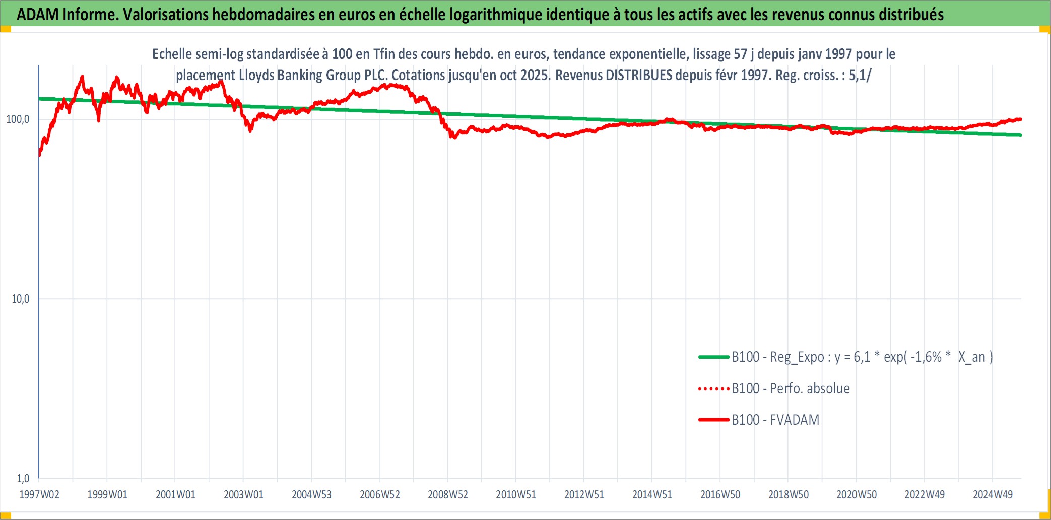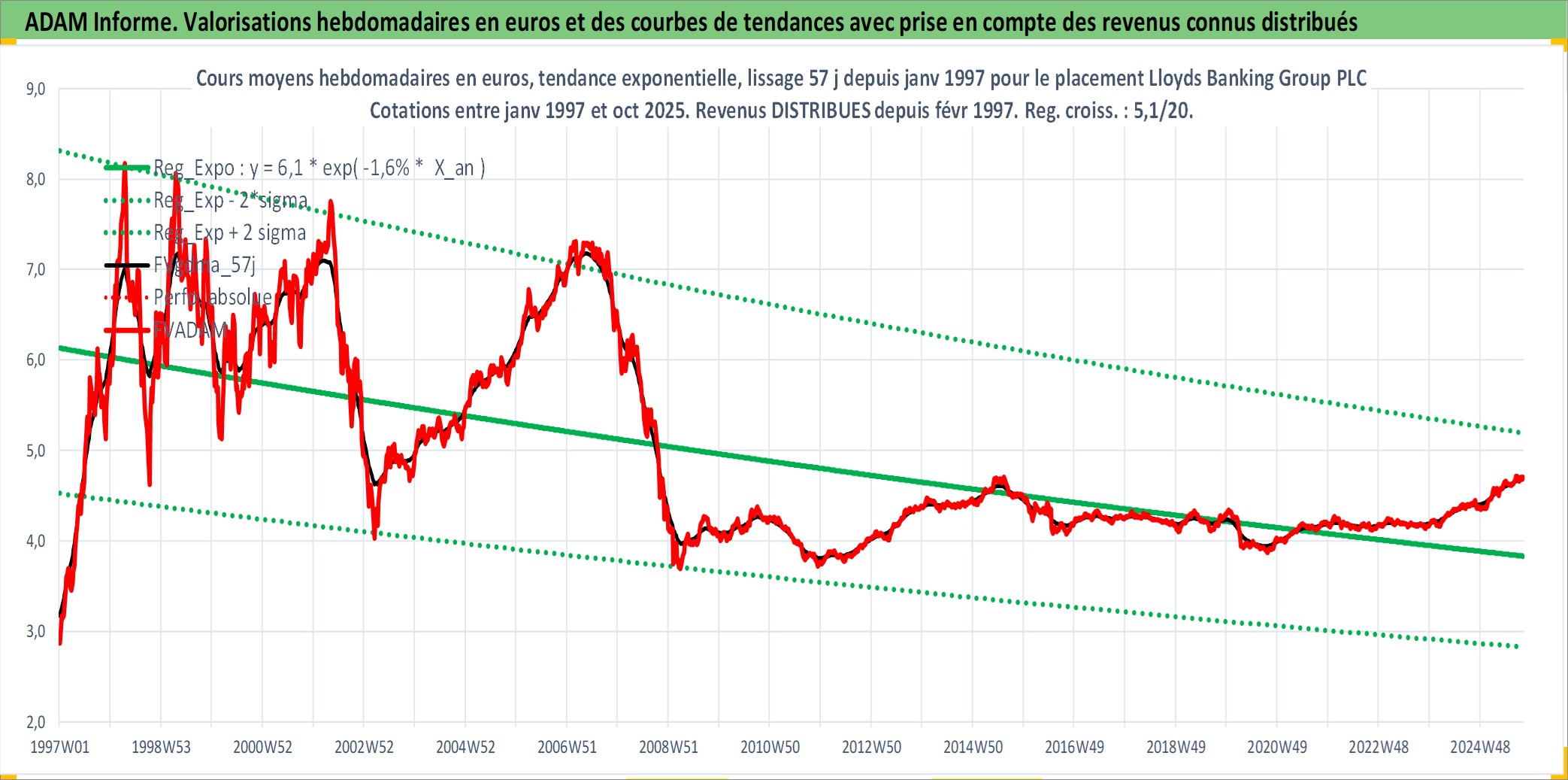 Site dédié aux investisseursPage dédiée sur site financeAnalyse des valorisations hebdomadaires de l'action Lloyds Banking Group PLC. Cet actif est cote en GBX. Les valorisations sont en contrevaleur EURO et couvrent les semaines 1997W01 a 2025W40. Les revenus de cet actif financier sont pris en compte depuis la semaine 1997W09. La note globale ESG de cet actif est estimee a 10.0 (apres rebasage entre 0 et 20).