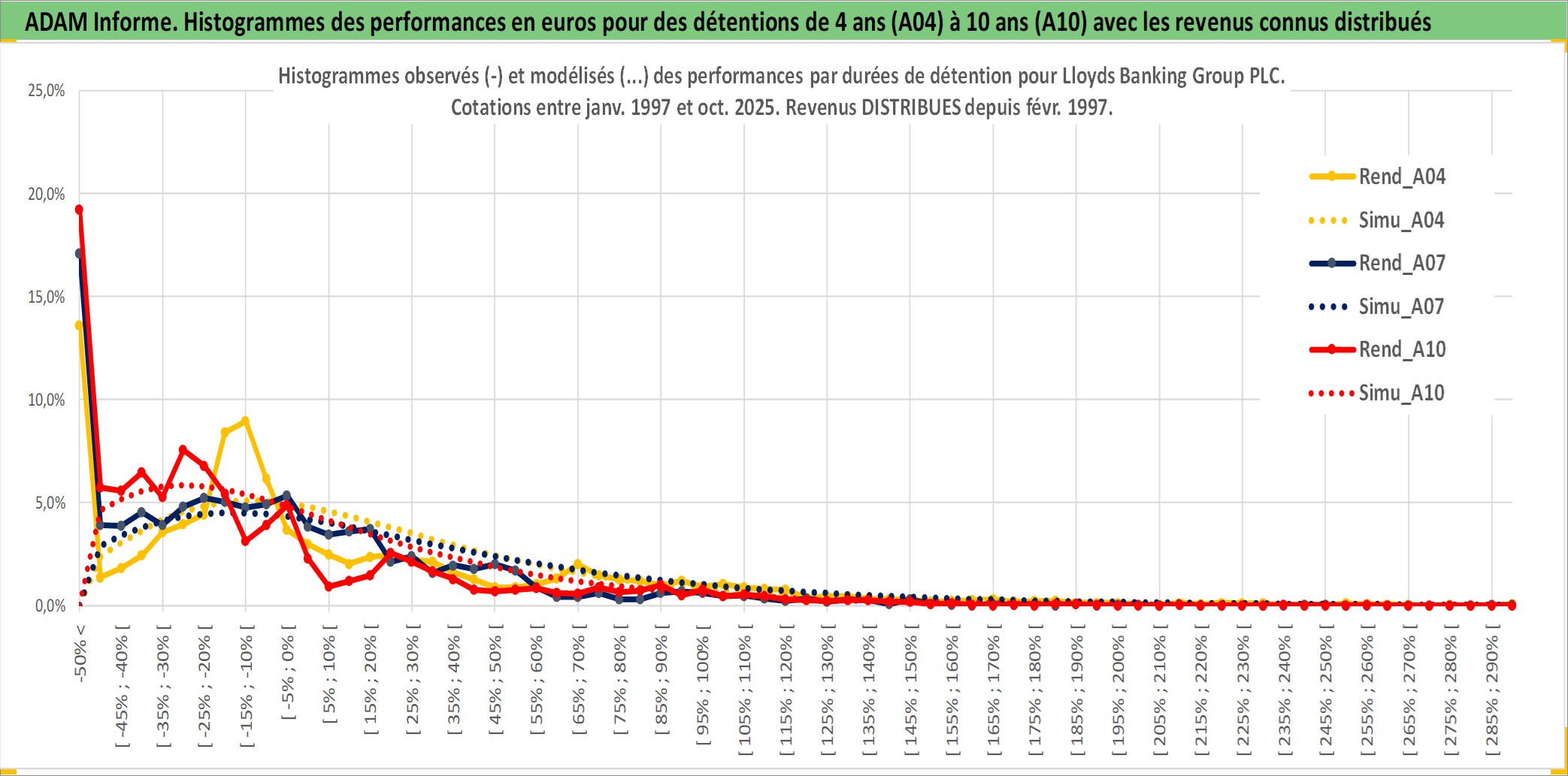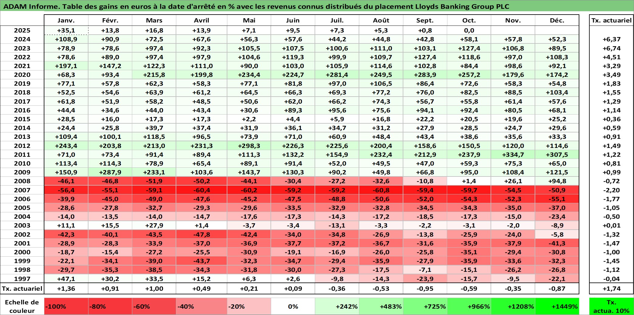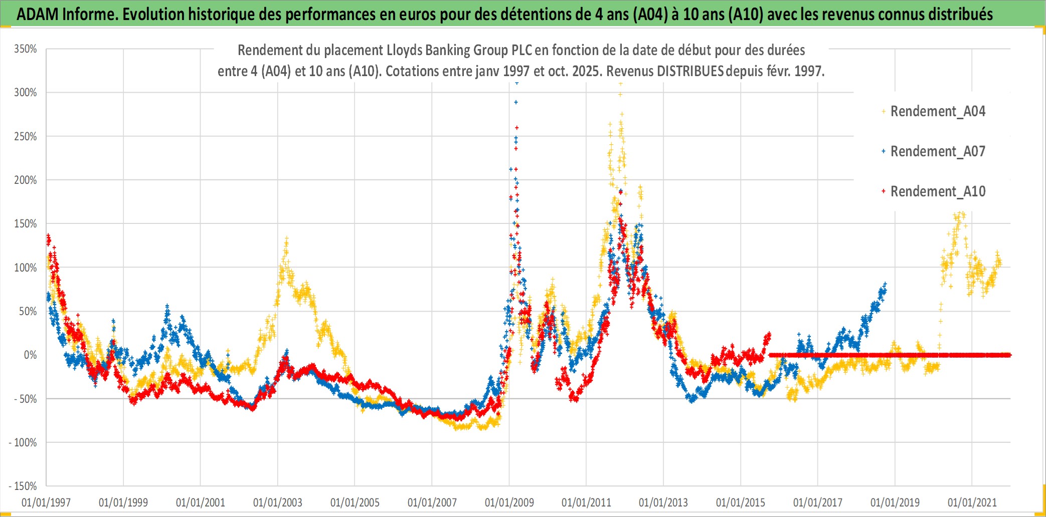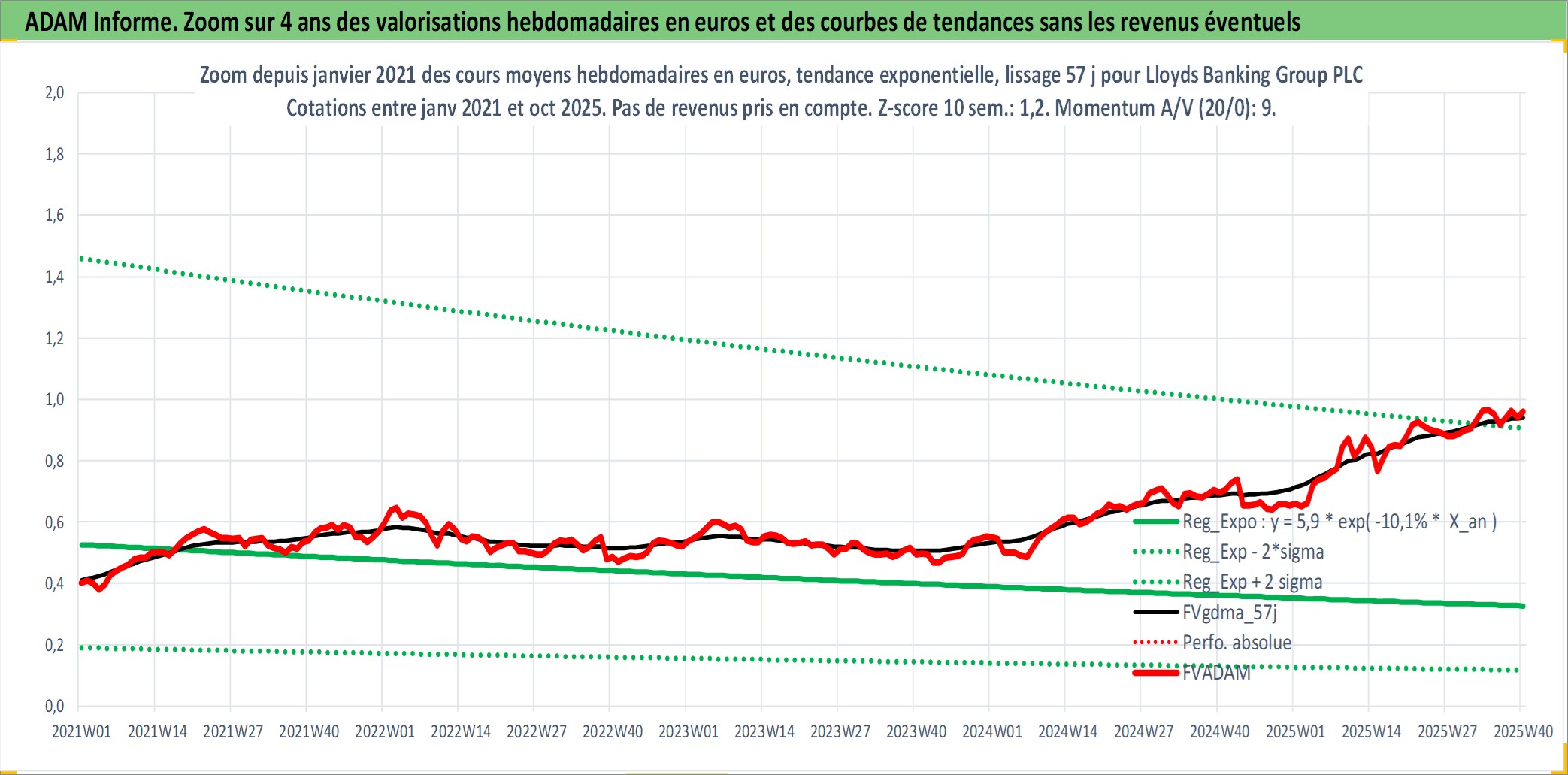 Site dédié aux investisseursPage dédiée sur site financeAnalyse des valorisations hebdomadaires de l'action Lloyds Banking Group PLC. Cet actif est cote en GBX. Les valorisations sont en contrevaleur EURO et couvrent les semaines 1997W01 a 2025W40. Les revenus de cet actif financier sont pris en compte depuis la semaine 1997W09. La note globale ESG de cet actif est estimee a 10.0 (apres rebasage entre 0 et 20).