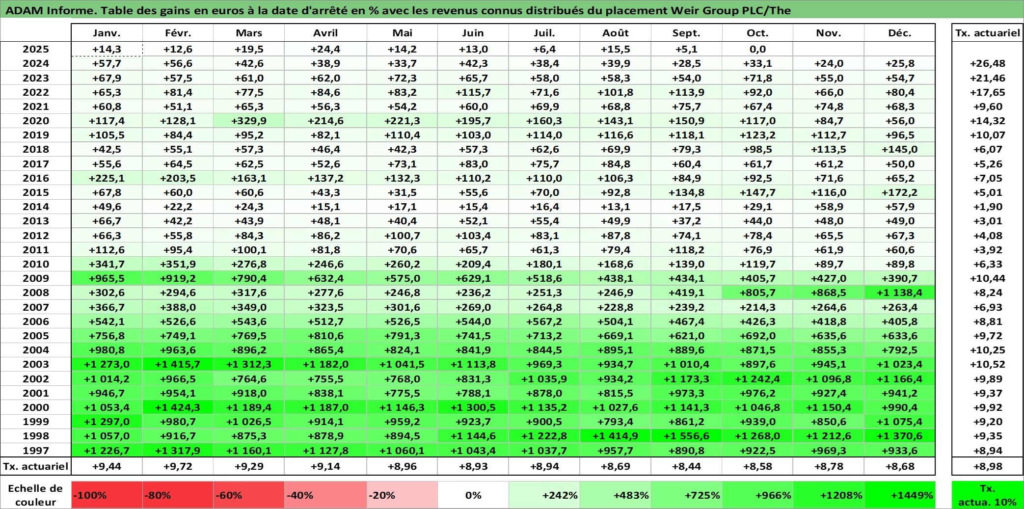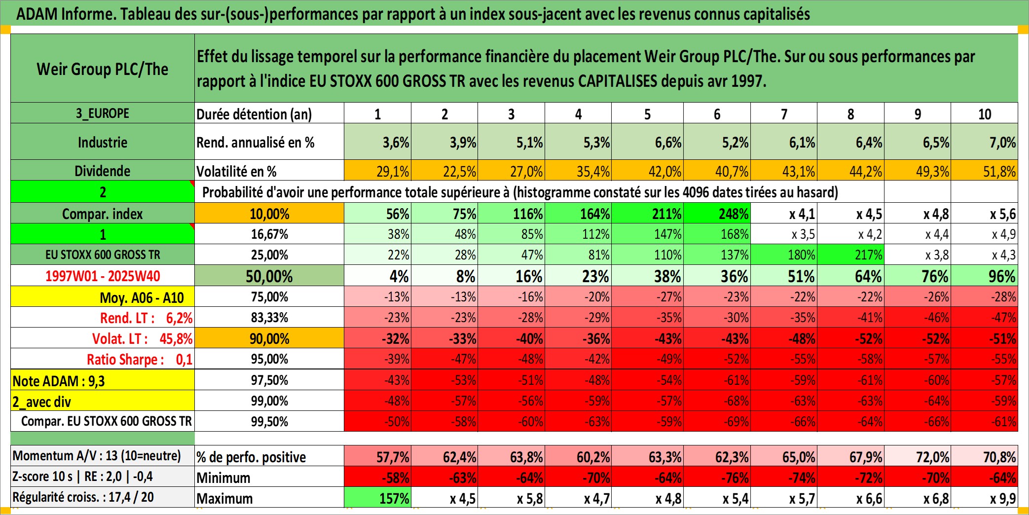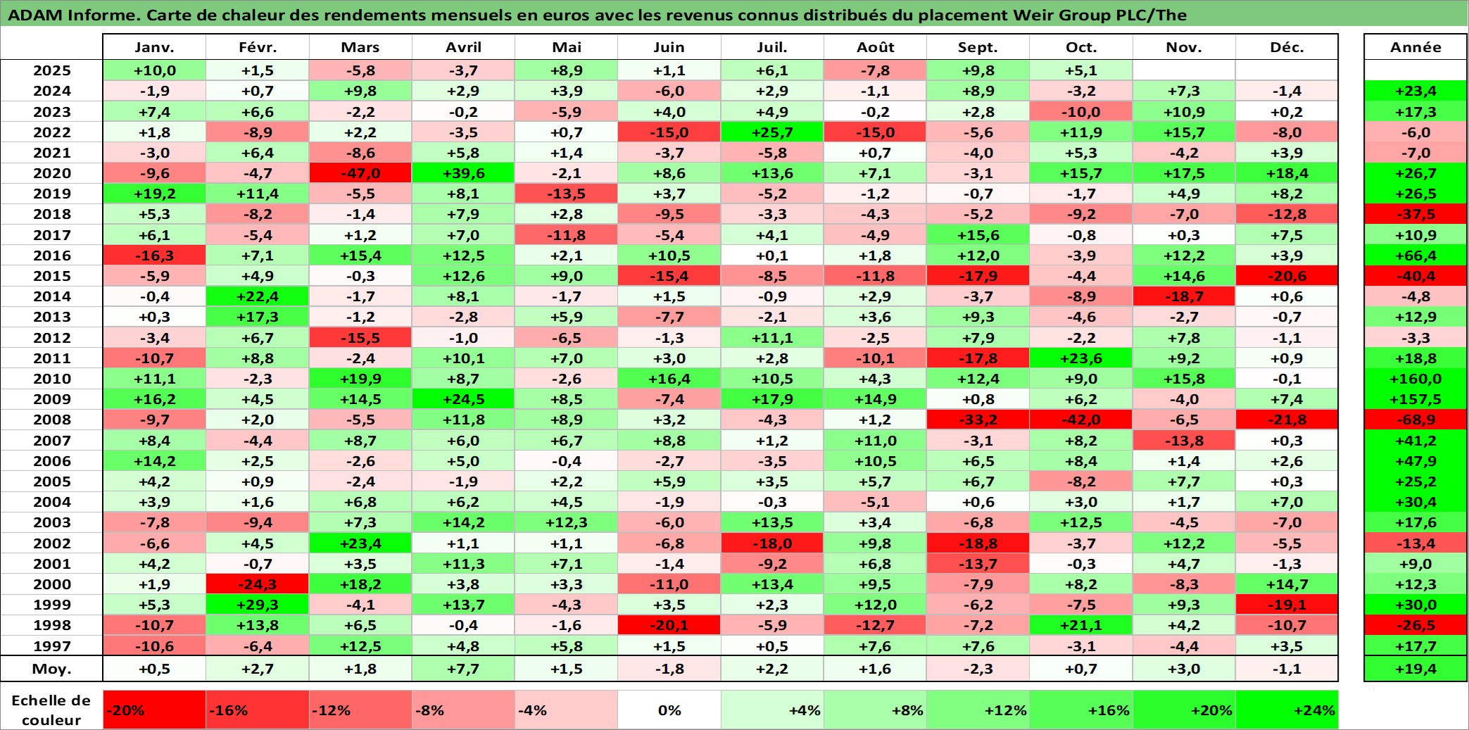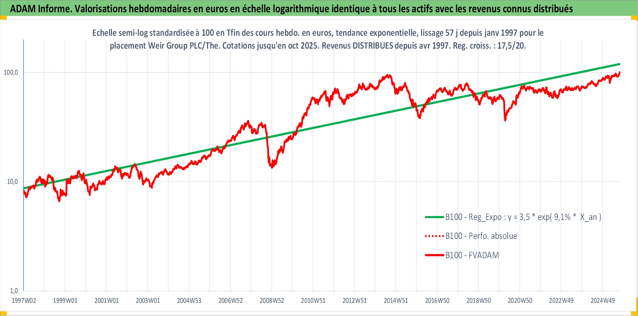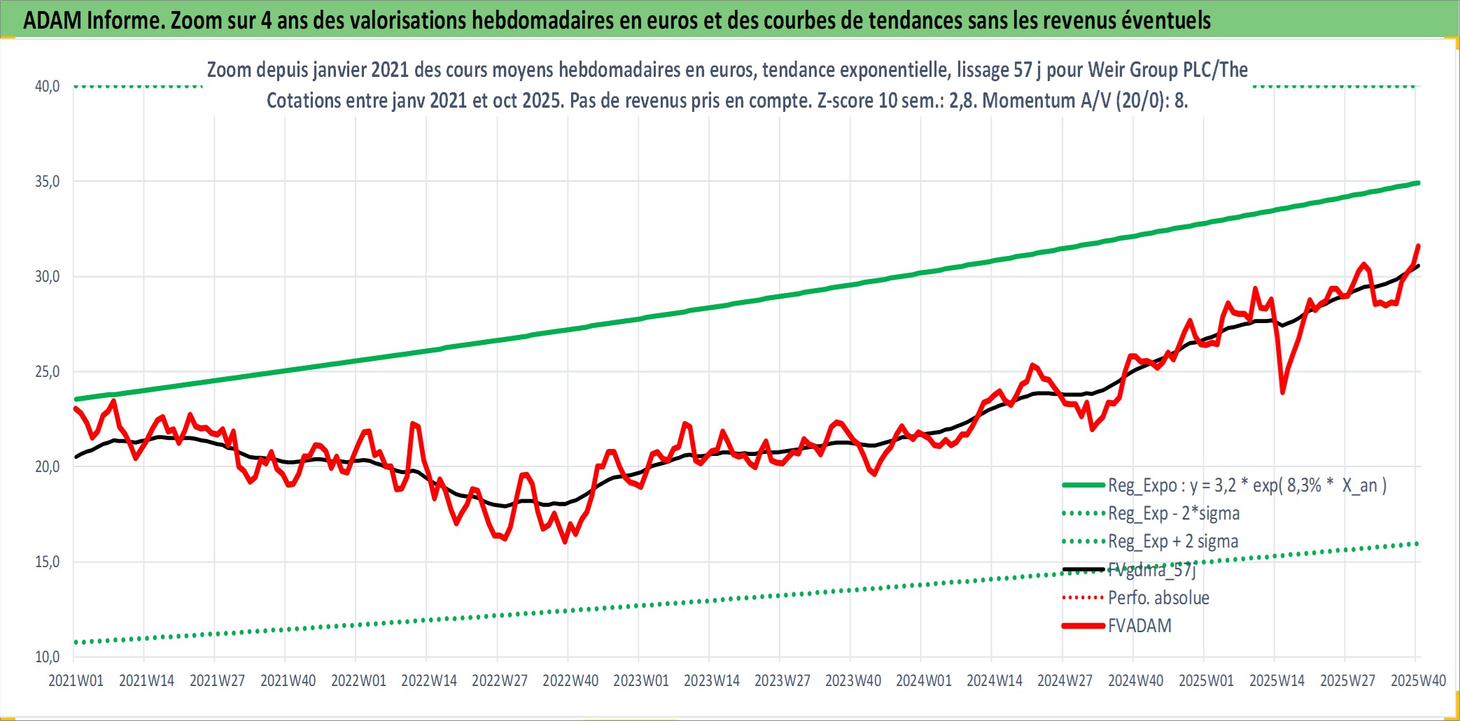 Site dédié aux investisseursPage dédiée sur site financeAnalyse des valorisations hebdomadaires de l'action Weir Group PLC/The. Cet actif est cote en GBX. Les valorisations sont en contrevaleur EURO et couvrent les semaines 1997W01 a 2025W40. Les revenus de cet actif financier sont pris en compte depuis la semaine 1997W14. La note globale ESG de cet actif est estimee a 9.0 (apres rebasage entre 0 et 20).