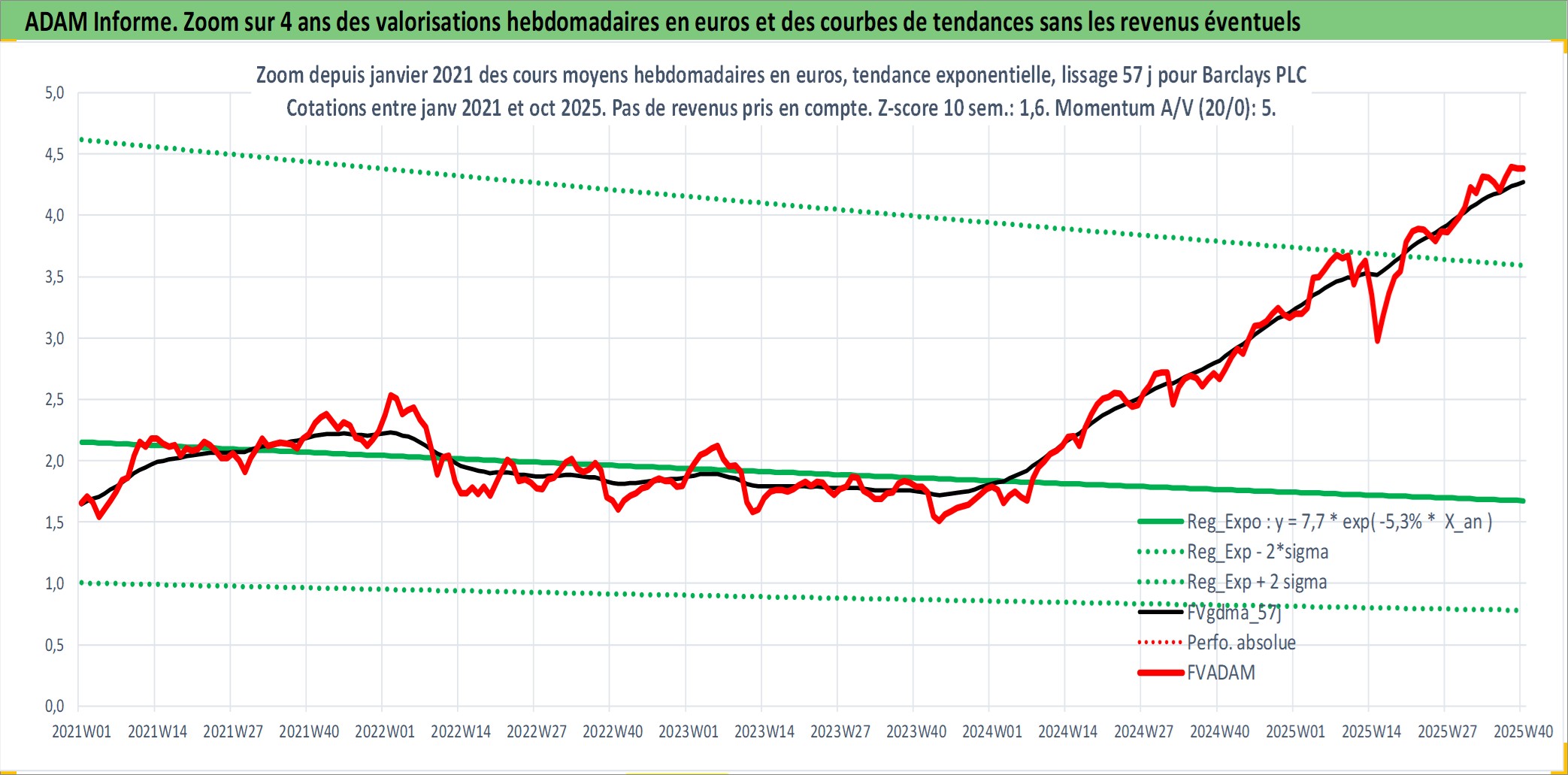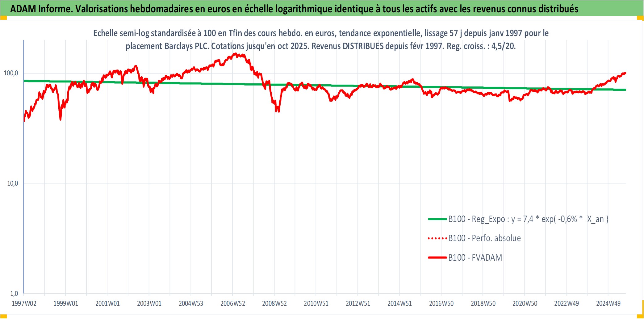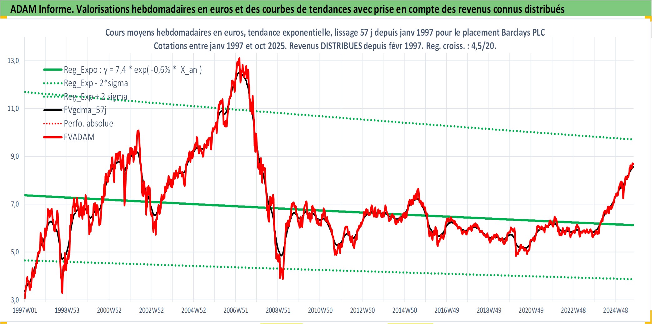Site dédié aux investisseursPage dédiée sur site financeAnalyse des valorisations hebdomadaires de l'action Barclays PLC. Cet actif est cote en GBX. Les valorisations sont en contrevaleur EURO et couvrent les semaines 1997W01 a 2025W40. Les revenus de cet actif financier sont pris en compte depuis la semaine 1997W09. La note globale ESG de cet actif est estimee a 8.0 (apres rebasage entre 0 et 20).