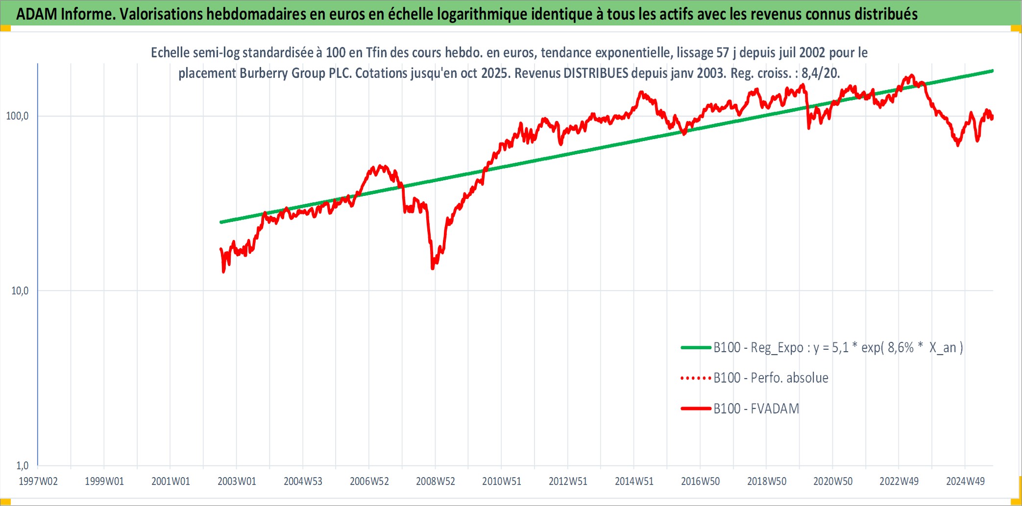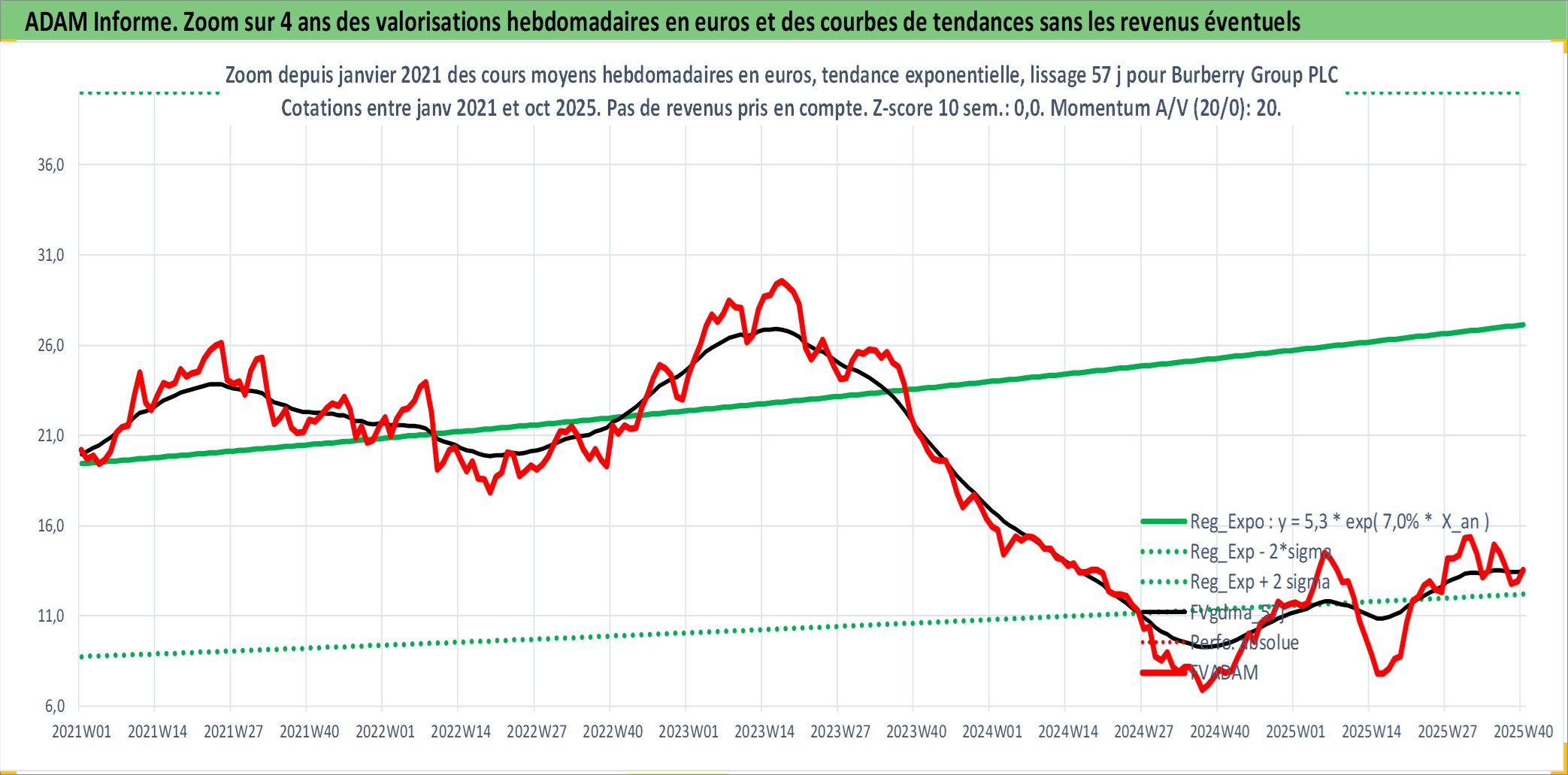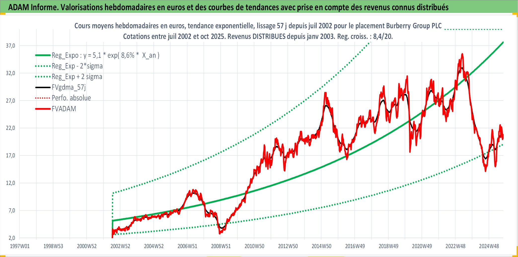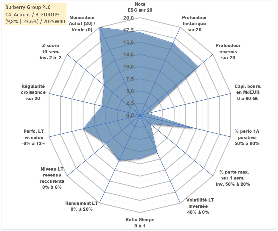 Site dédié aux investisseursPage dédiée sur site financeAnalyse des valorisations hebdomadaires de l'action Burberry Group PLC. Cet actif est cote en GBX. Les valorisations sont en contrevaleur EURO et couvrent les semaines 2002W28 a 2025W40. Les revenus de cet actif financier sont pris en compte depuis la semaine 2003W04. La note globale ESG de cet actif est estimee a 17.0 (apres rebasage entre 0 et 20).