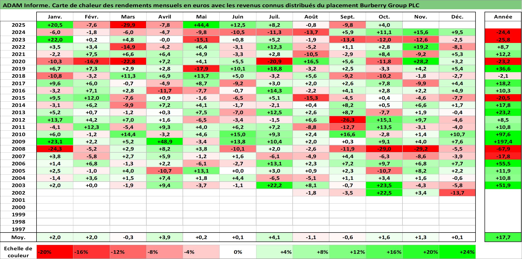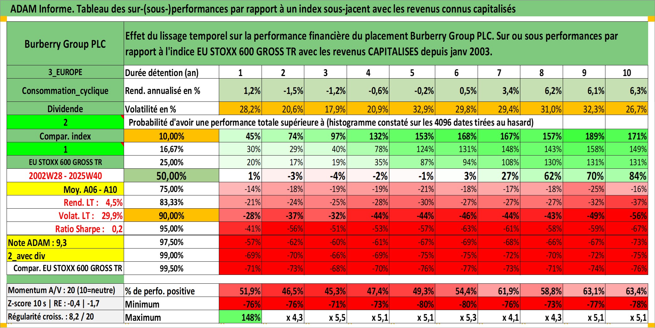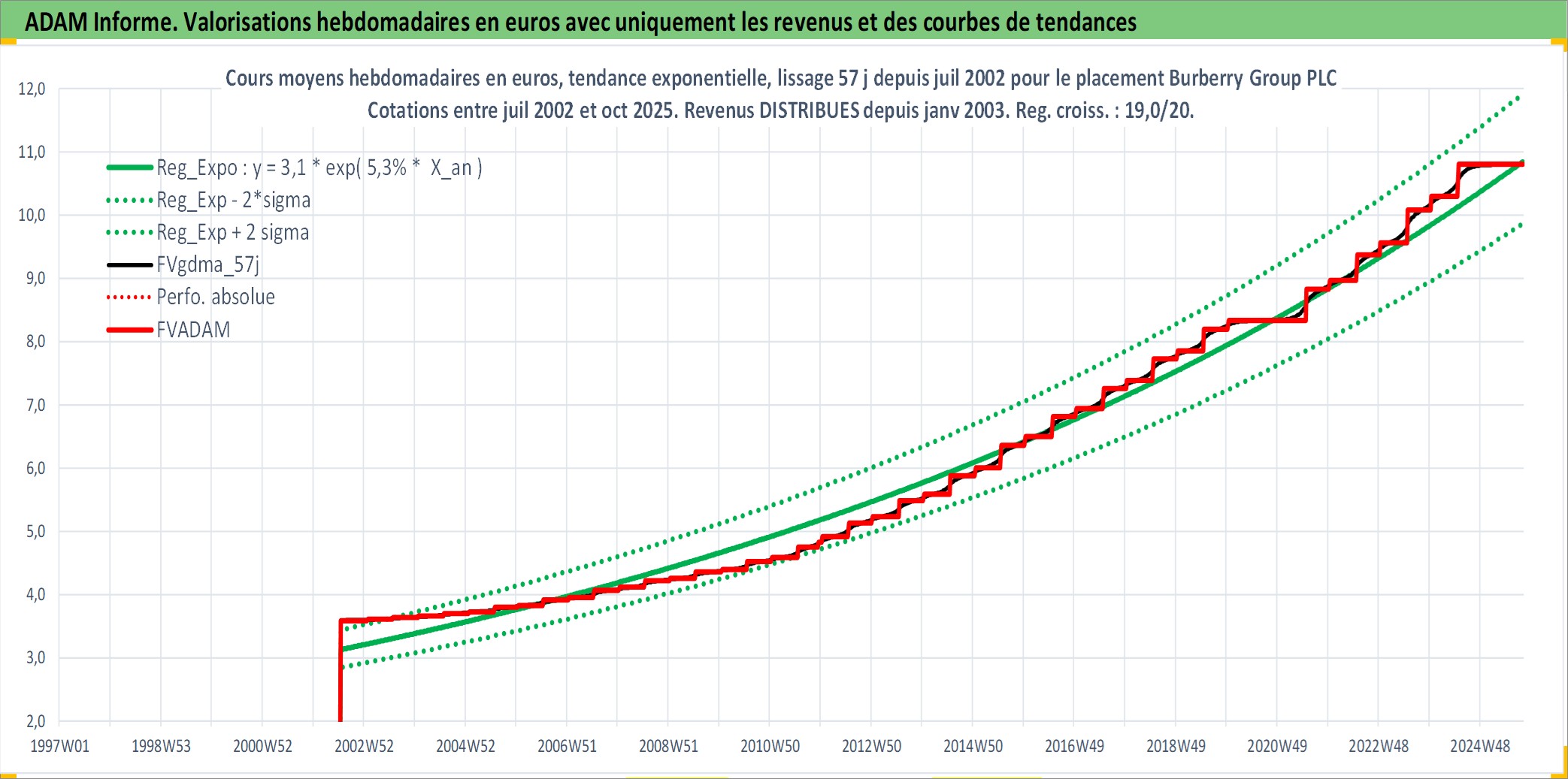 Site dédié aux investisseursPage dédiée sur site financeAnalyse des valorisations hebdomadaires de l'action Burberry Group PLC. Cet actif est cote en GBX. Les valorisations sont en contrevaleur EURO et couvrent les semaines 2002W28 a 2025W40. Les revenus de cet actif financier sont pris en compte depuis la semaine 2003W04. La note globale ESG de cet actif est estimee a 17.0 (apres rebasage entre 0 et 20).