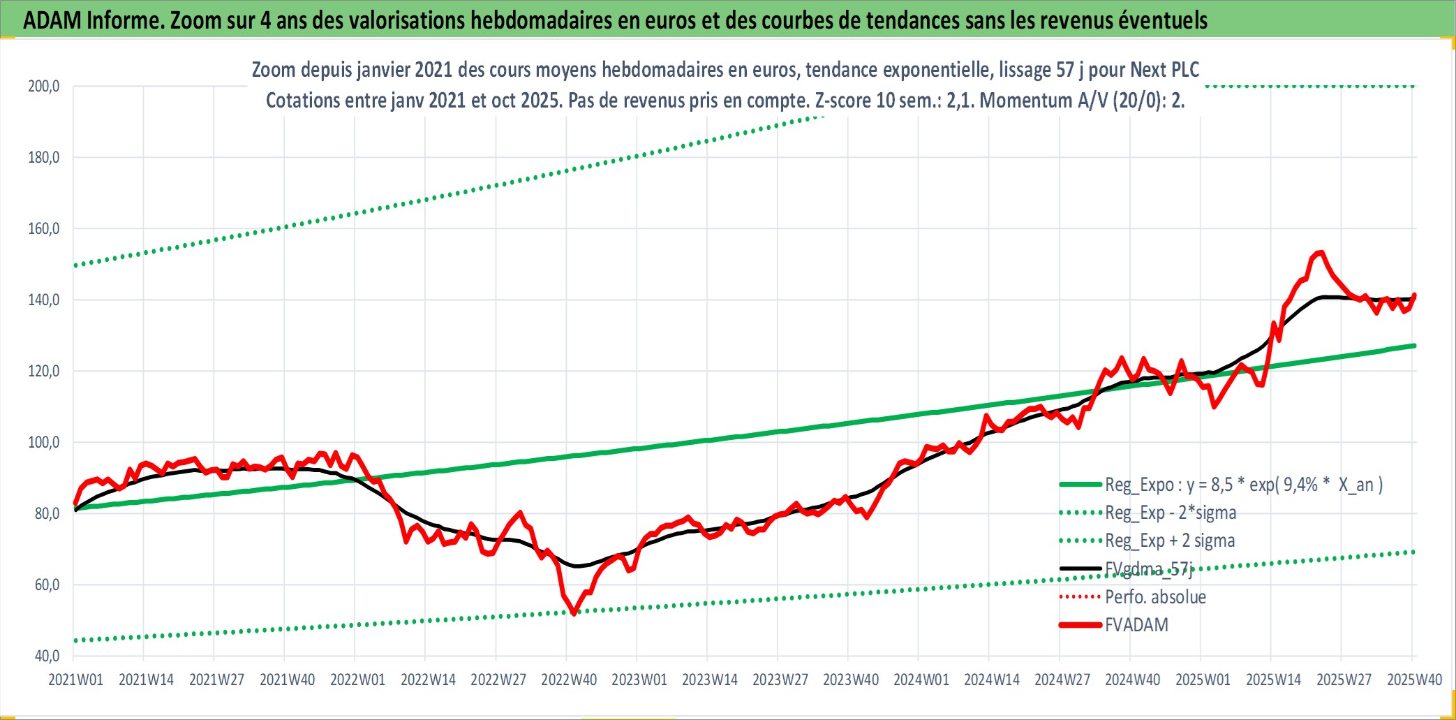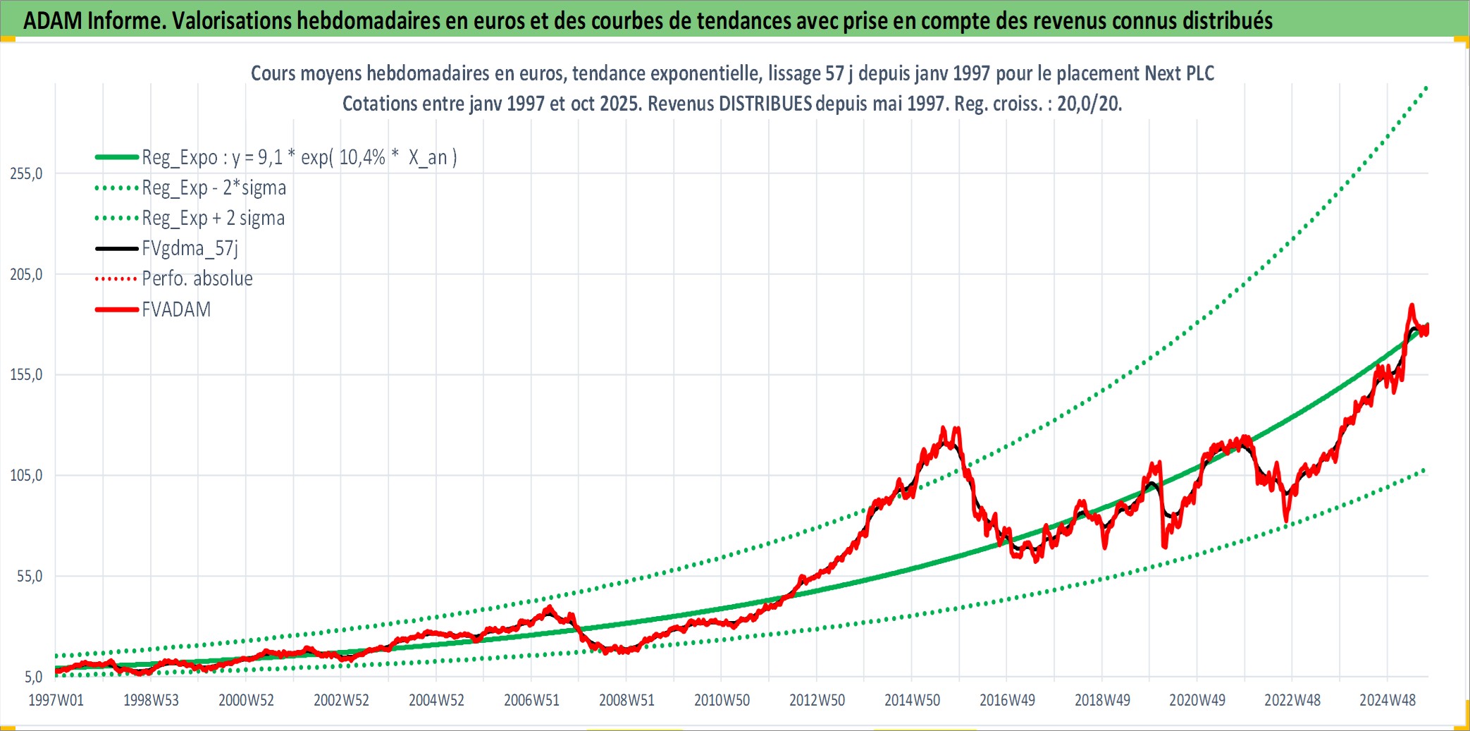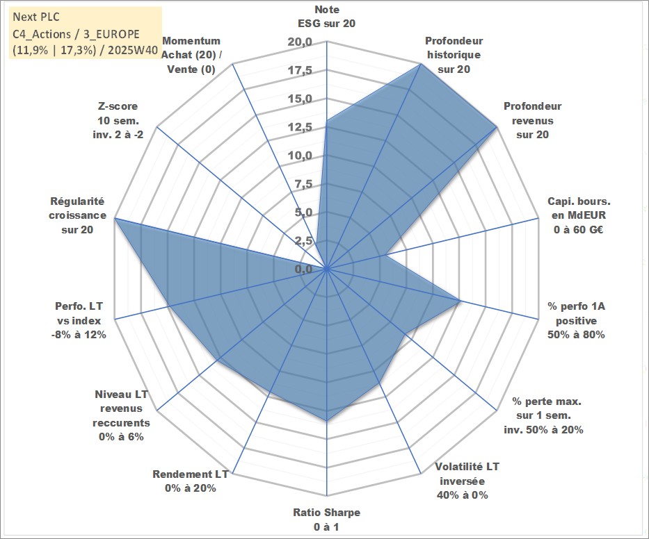 Site dédié aux investisseursPage dédiée sur site financeAnalyse des valorisations hebdomadaires de l'action Next PLC. Cet actif est cote en GBX. Les valorisations sont en contrevaleur EURO et couvrent les semaines 1997W01 a 2025W40. Les revenus de cet actif financier sont pris en compte depuis la semaine 1997W22. La note globale ESG de cet actif est estimee a 13.0 (apres rebasage entre 0 et 20).