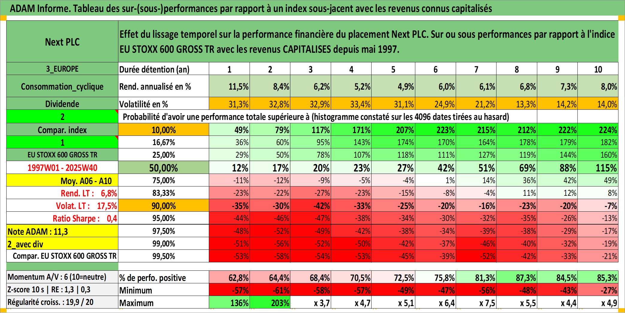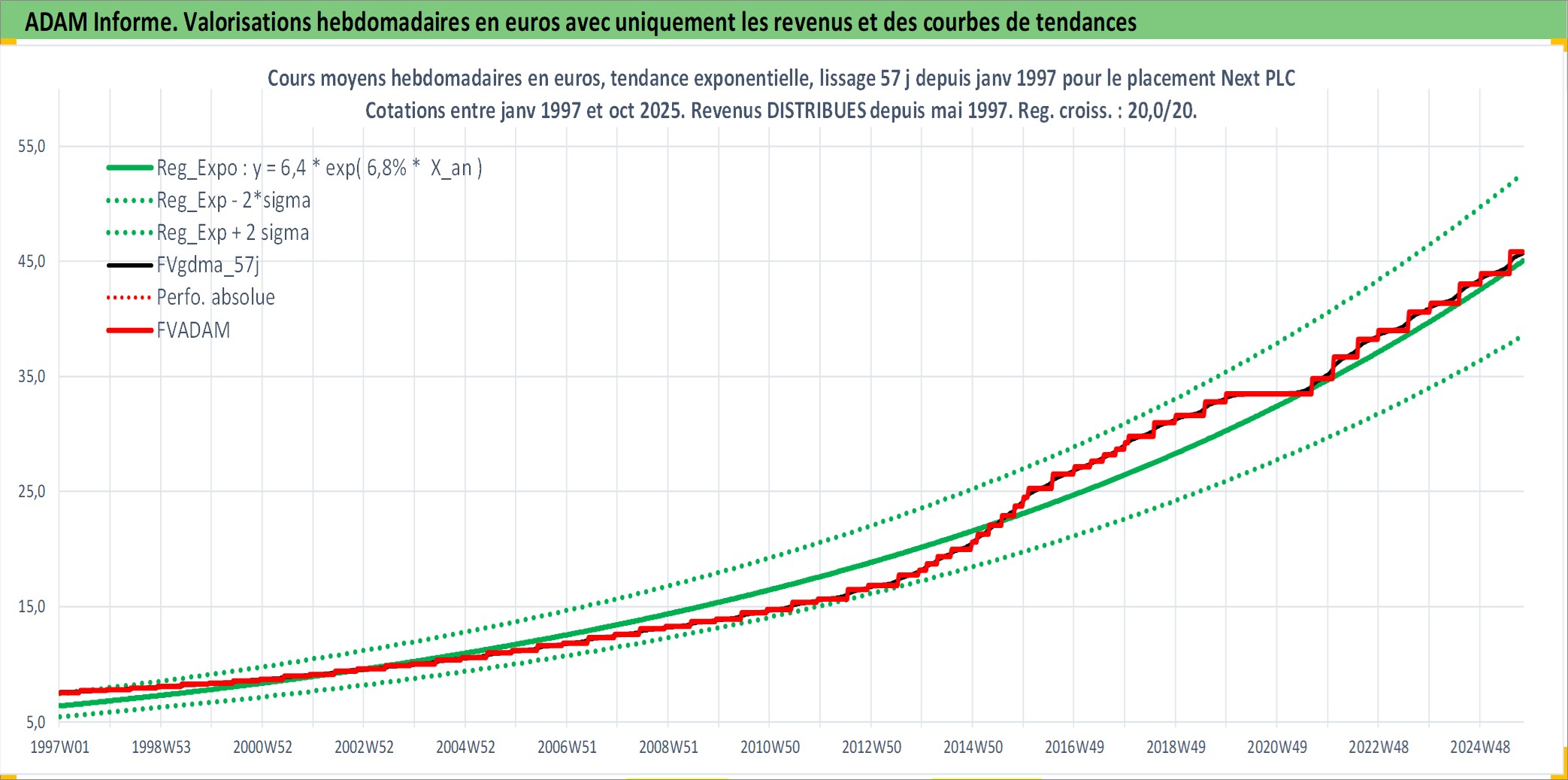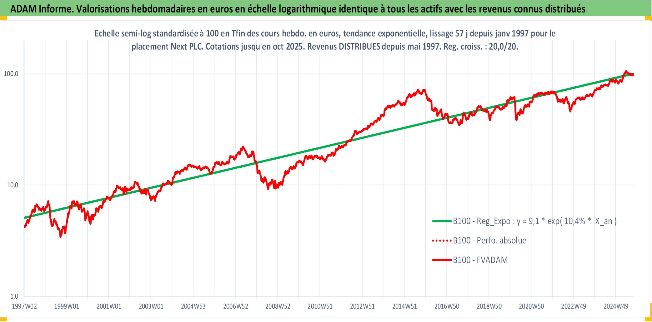 Site dédié aux investisseursPage dédiée sur site financeAnalyse des valorisations hebdomadaires de l'action Next PLC. Cet actif est cote en GBX. Les valorisations sont en contrevaleur EURO et couvrent les semaines 1997W01 a 2025W40. Les revenus de cet actif financier sont pris en compte depuis la semaine 1997W22. La note globale ESG de cet actif est estimee a 13.0 (apres rebasage entre 0 et 20).