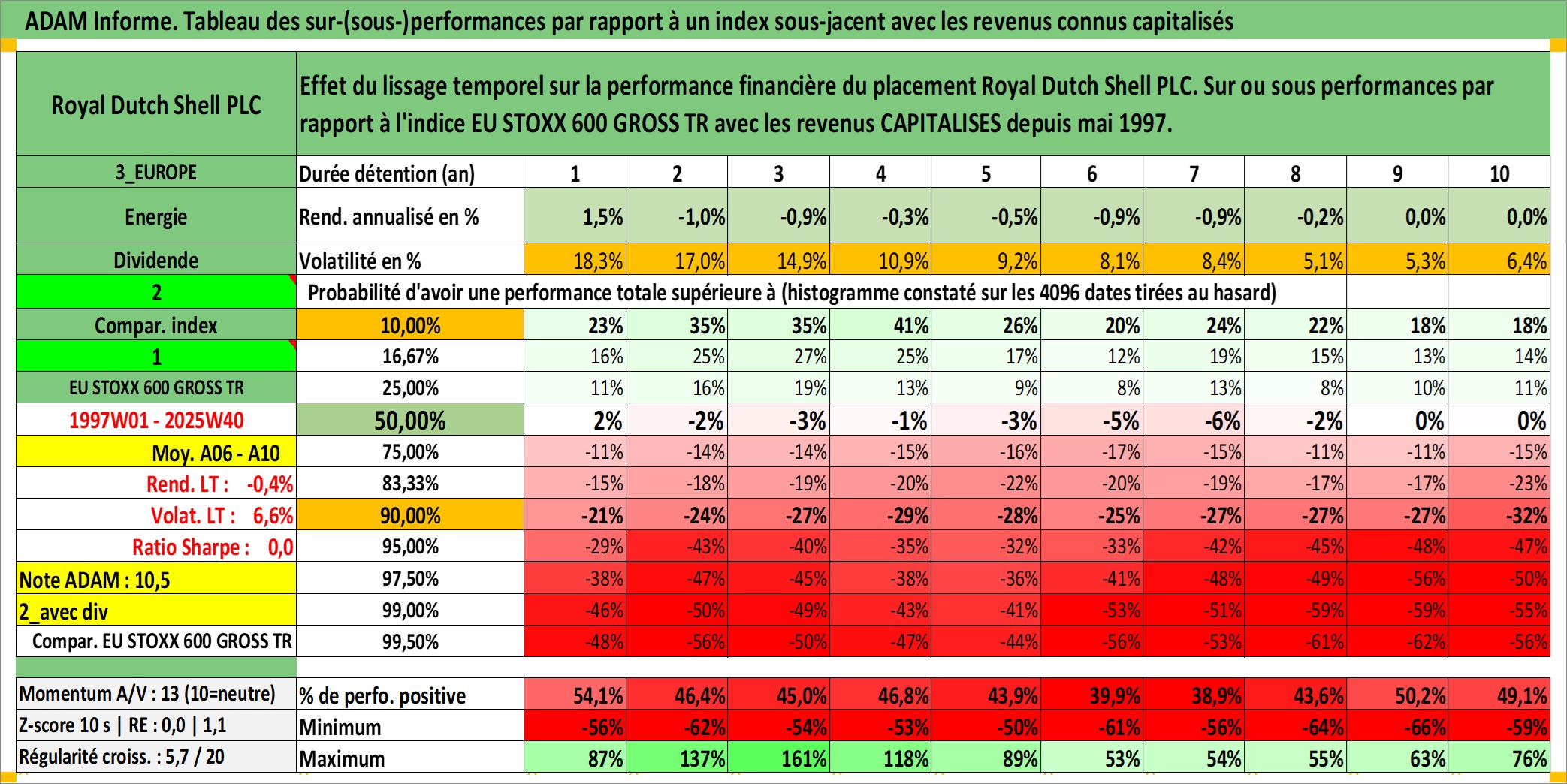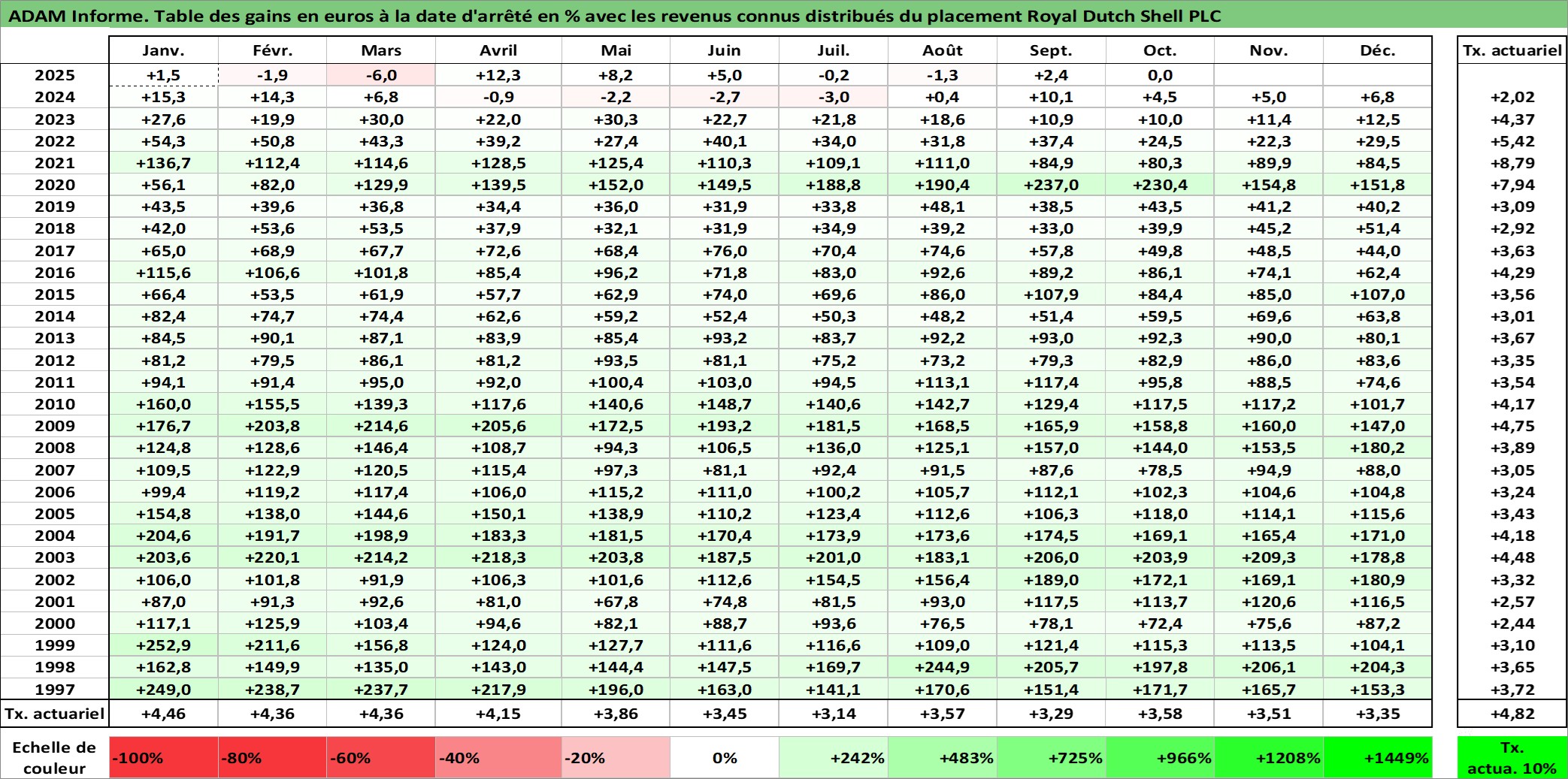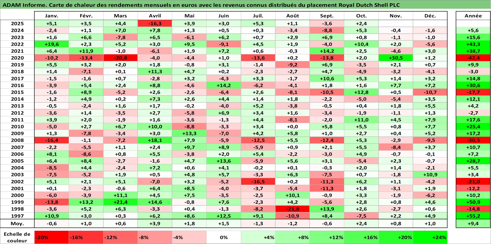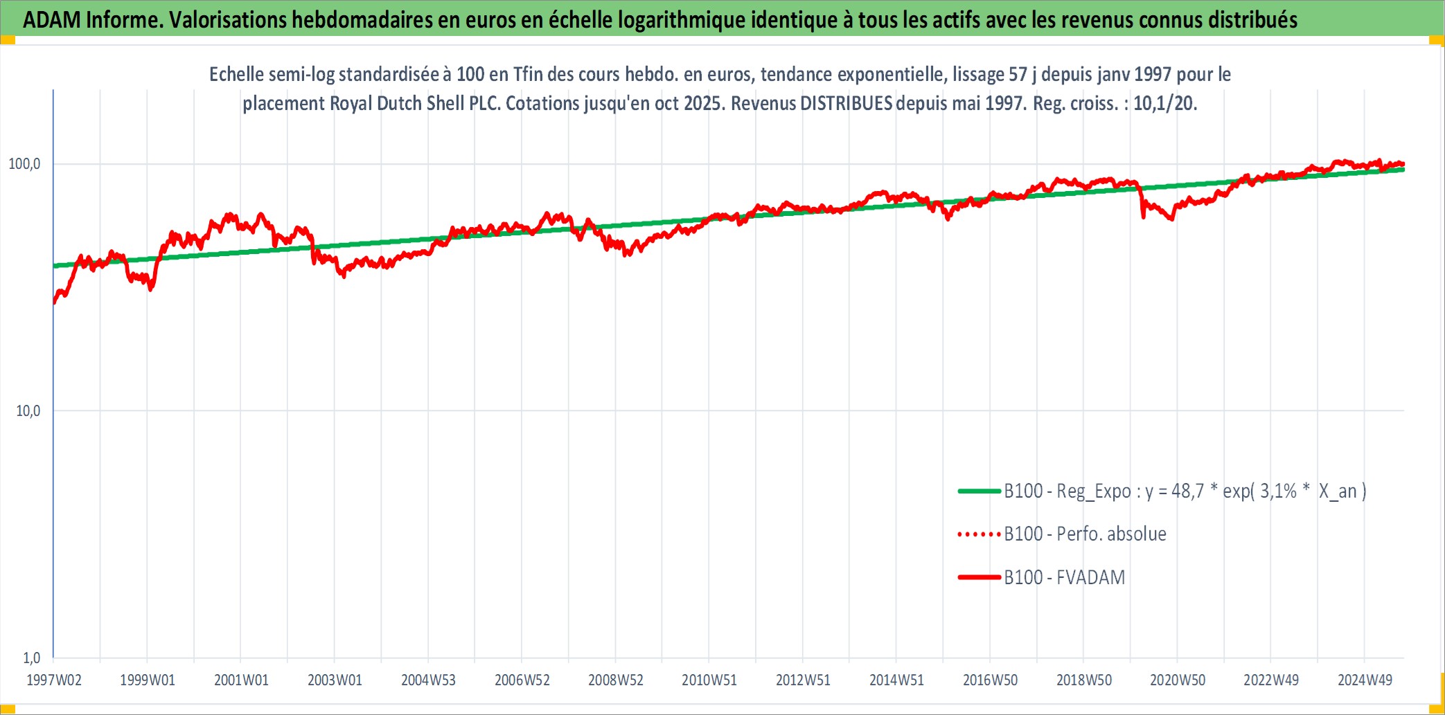 Site dédié aux investisseursPage dédiée sur site financeAnalyse des valorisations hebdomadaires de l'action Royal Dutch Shell PLC. Cet actif est cote en USD. Les valorisations sont en contrevaleur EURO et couvrent les semaines 1997W01 a 2025W40. Les revenus de cet actif financier sont pris en compte depuis la semaine 1997W20. La note ESG de cet actif n'est pas connue.