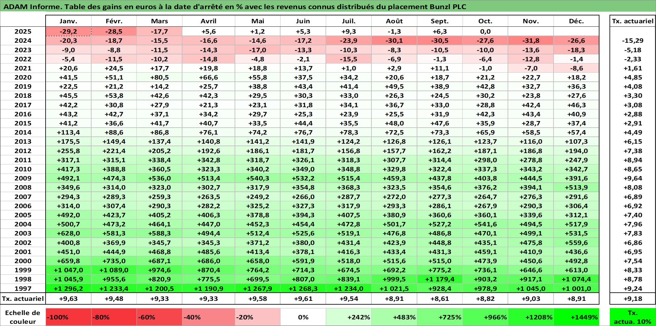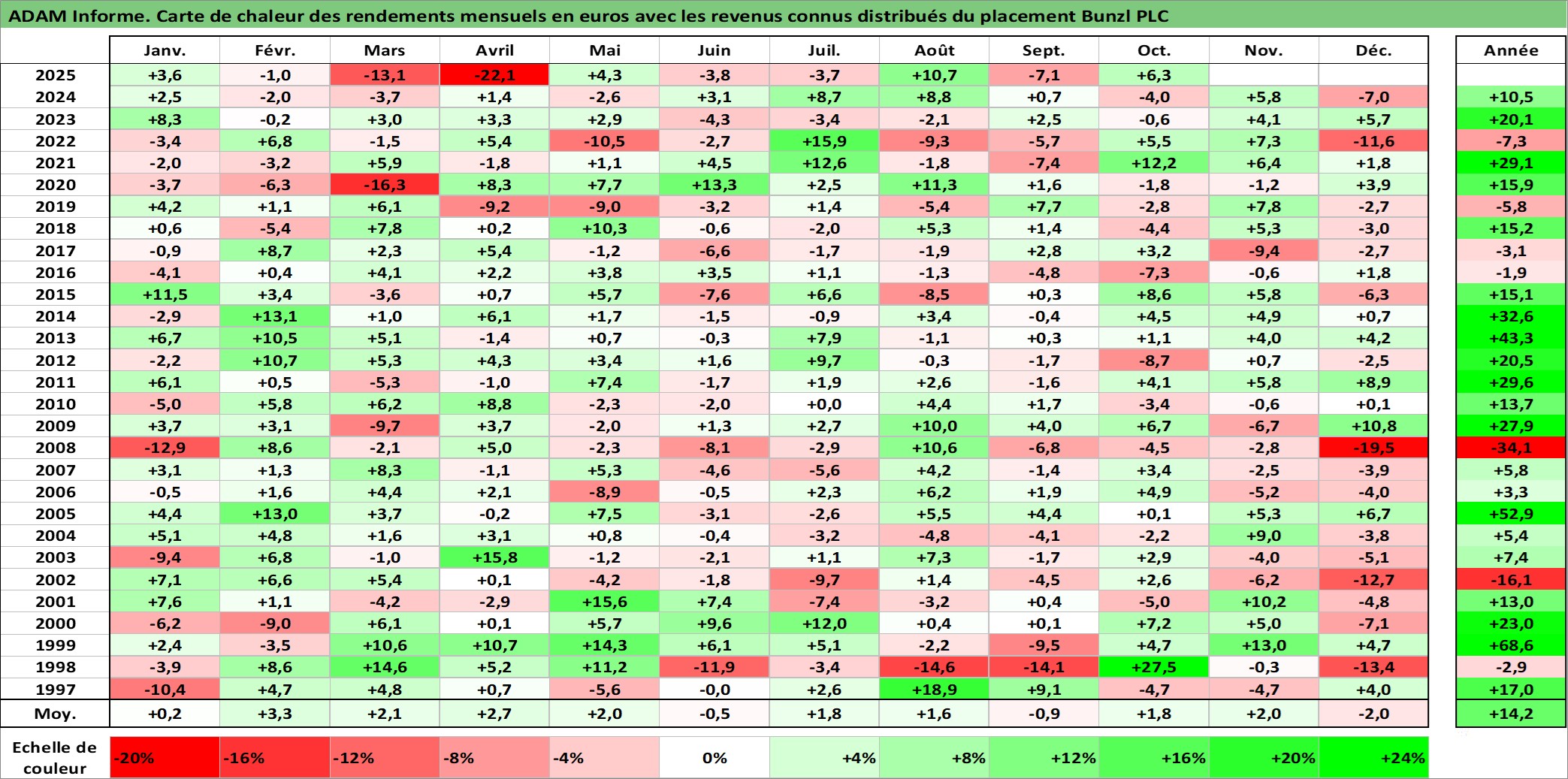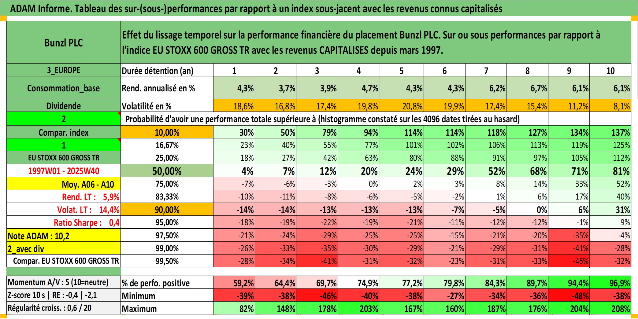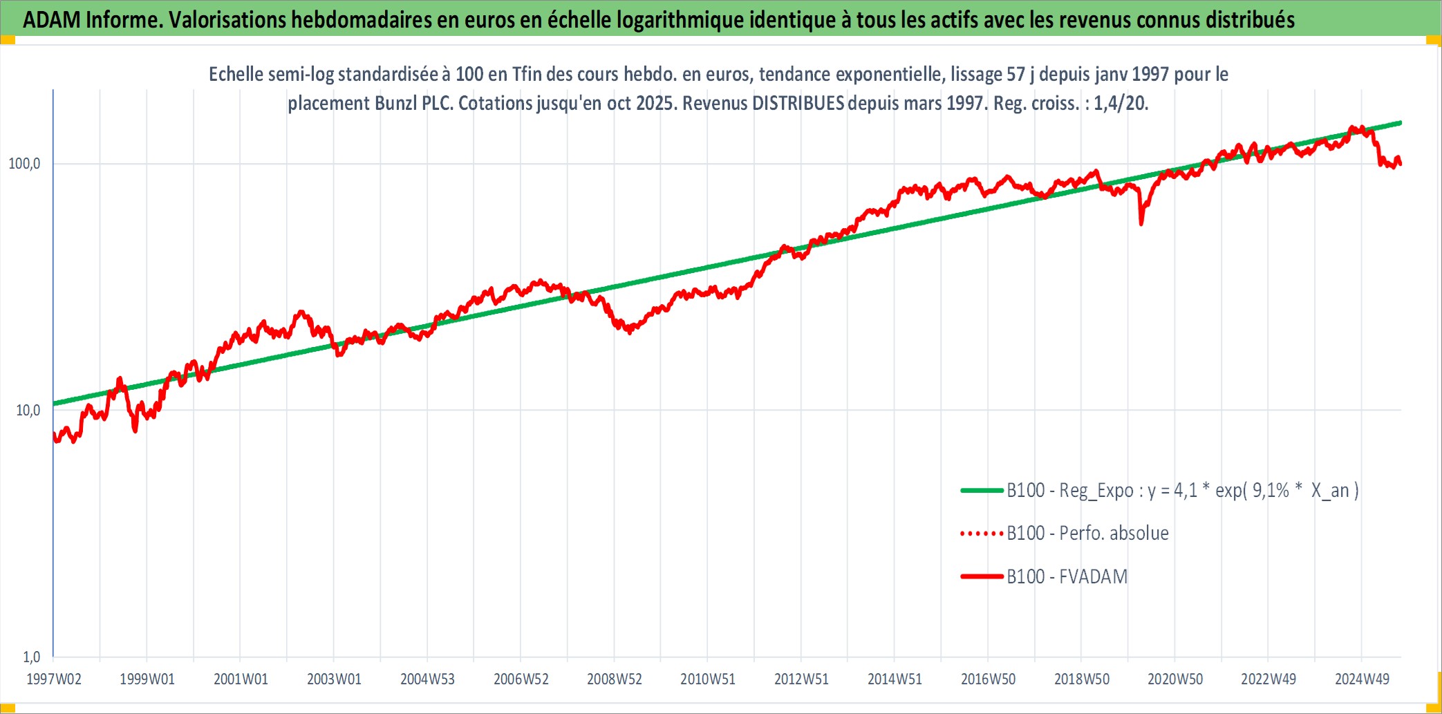 Site dédié aux investisseursPage dédiée sur site financeAnalyse des valorisations hebdomadaires de l'action Bunzl PLC. Cet actif est cote en GBX. Les valorisations sont en contrevaleur EURO et couvrent les semaines 1997W01 a 2025W40. Les revenus de cet actif financier sont pris en compte depuis la semaine 1997W13. La note globale ESG de cet actif est estimee a 13.0 (apres rebasage entre 0 et 20).