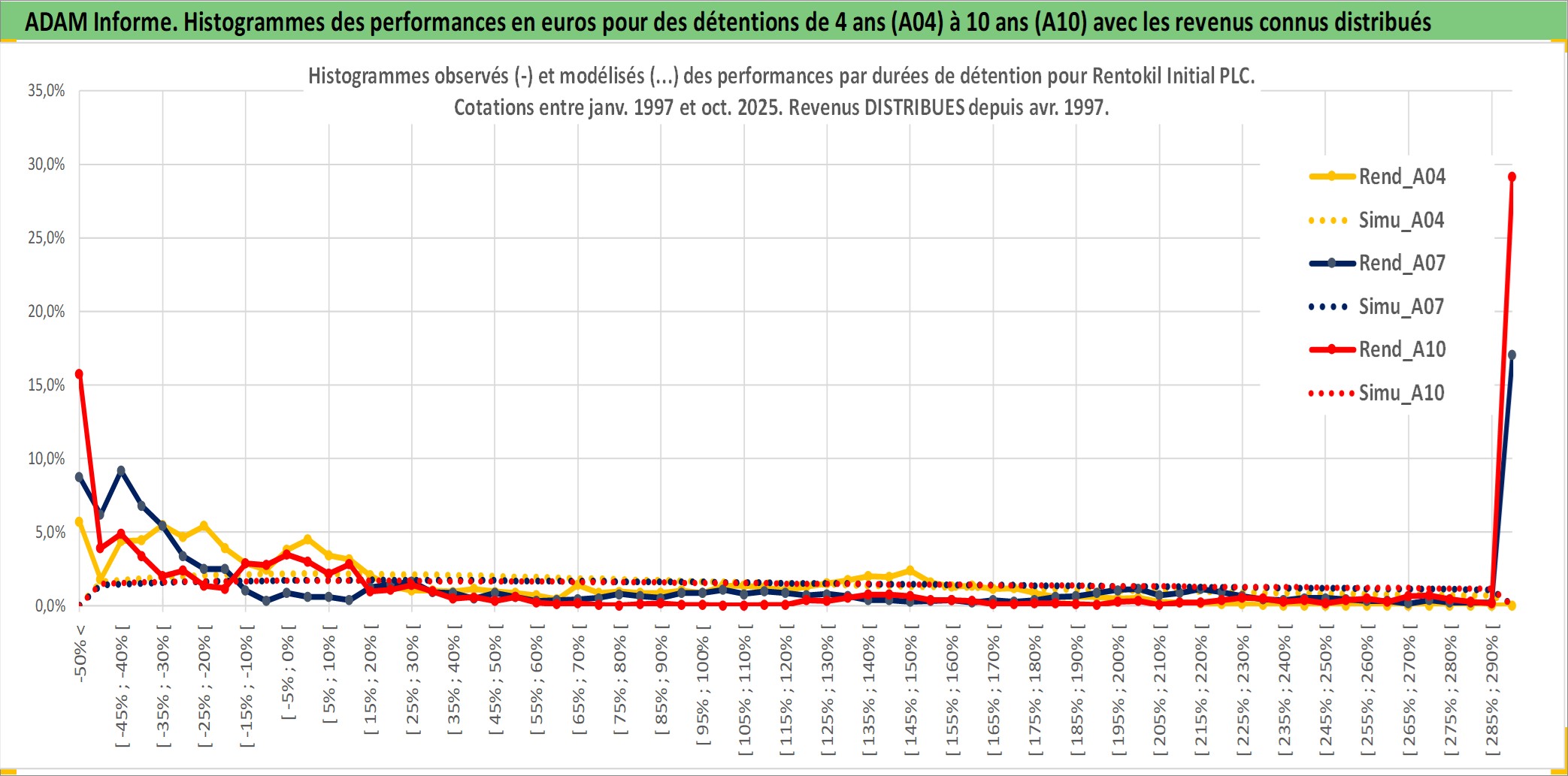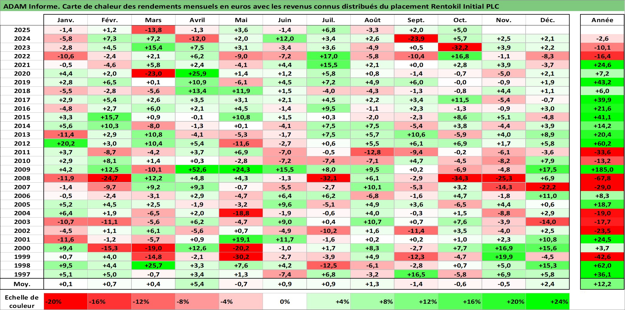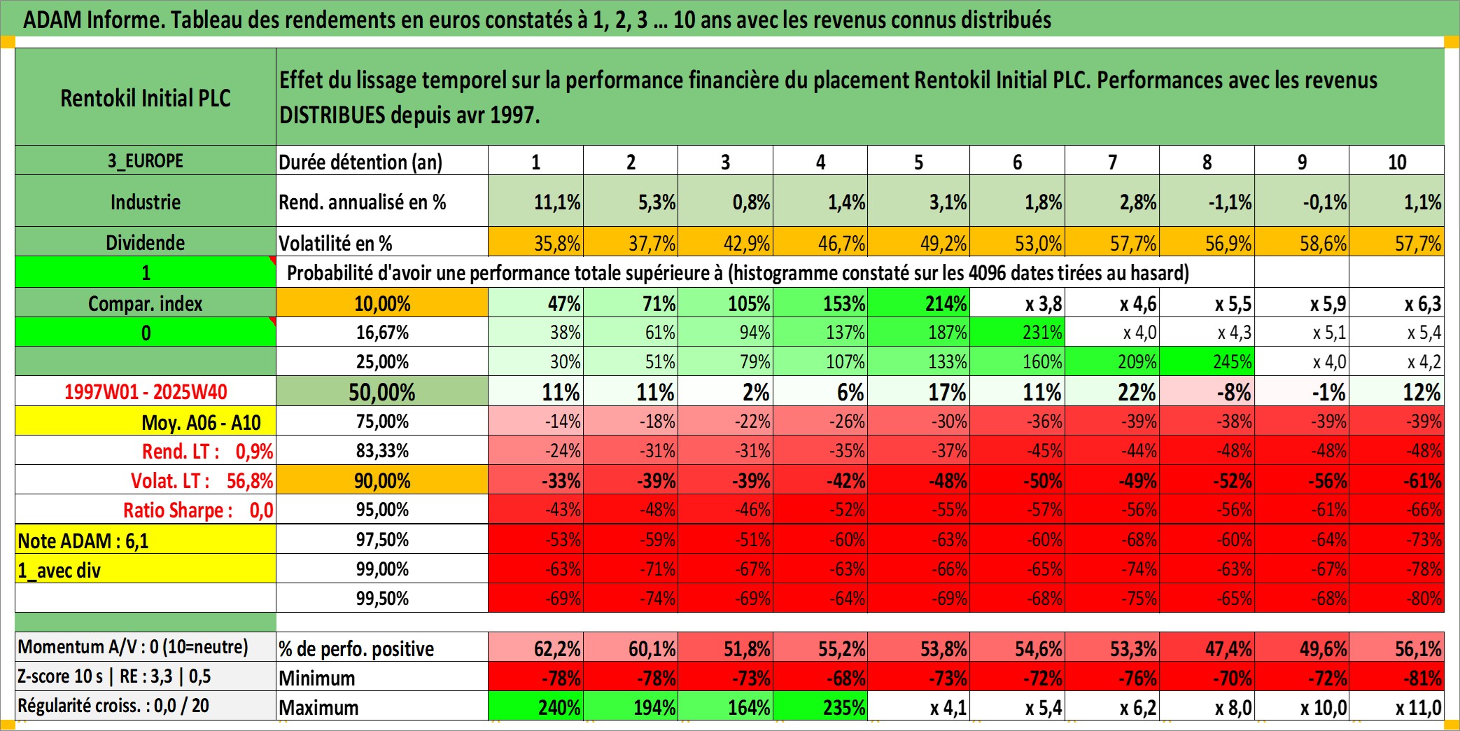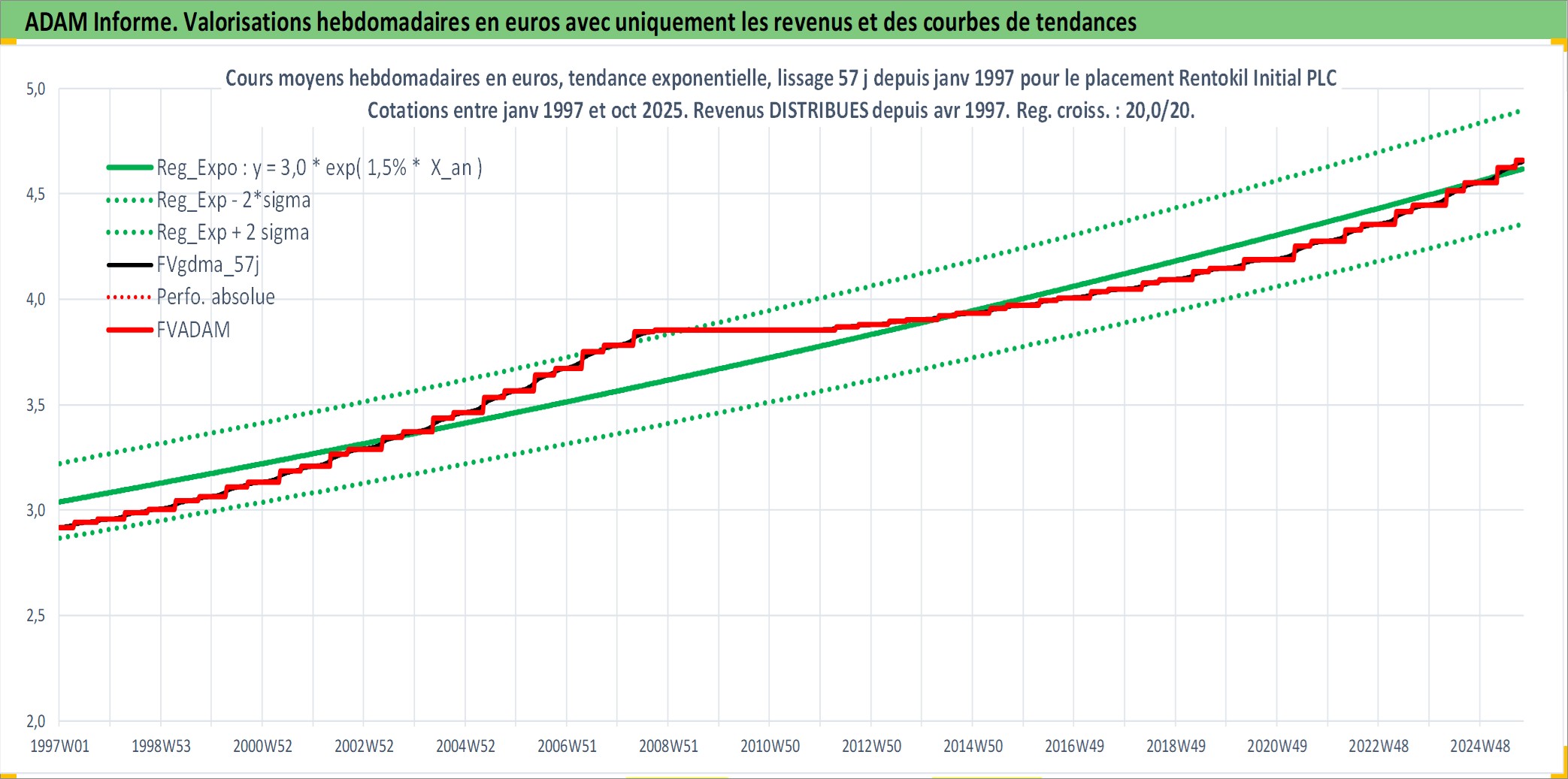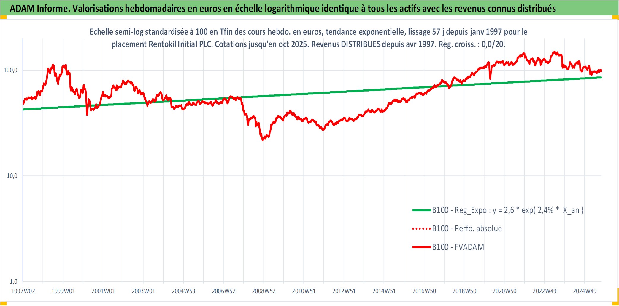 Site dédié aux investisseursPage dédiée sur site financeAnalyse des valorisations hebdomadaires de l'action Rentokil Initial PLC. Cet actif est cote en GBX. Les valorisations sont en contrevaleur EURO et couvrent les semaines 1997W01 a 2025W40. Les revenus de cet actif financier sont pris en compte depuis la semaine 1997W16. La note globale ESG de cet actif est estimee a 13.0 (apres rebasage entre 0 et 20).