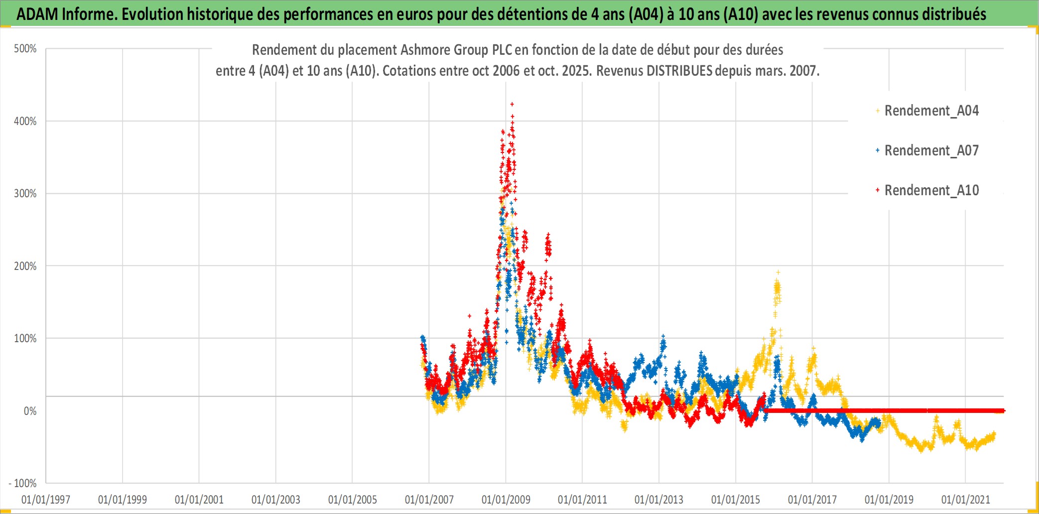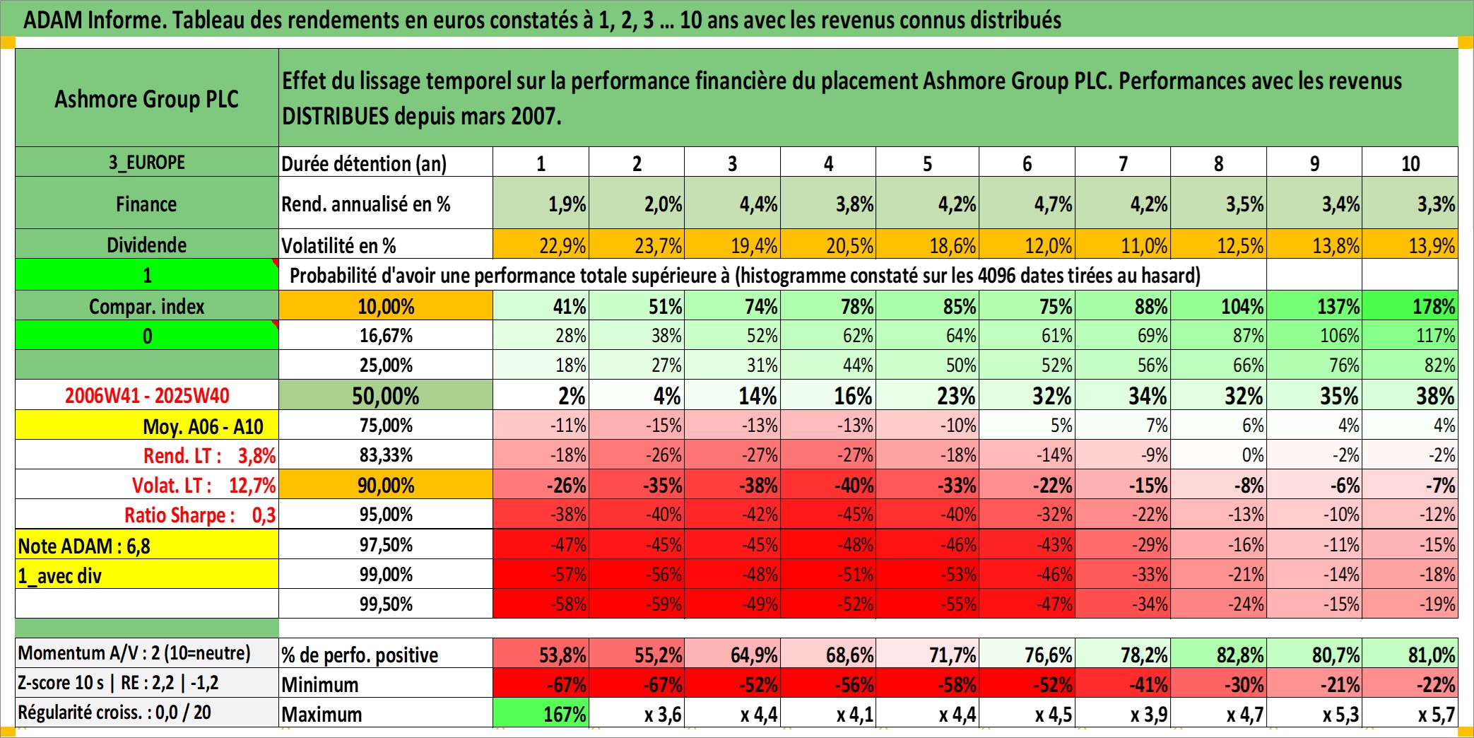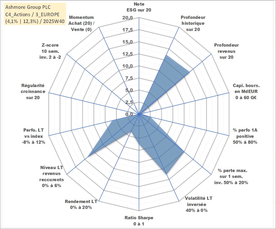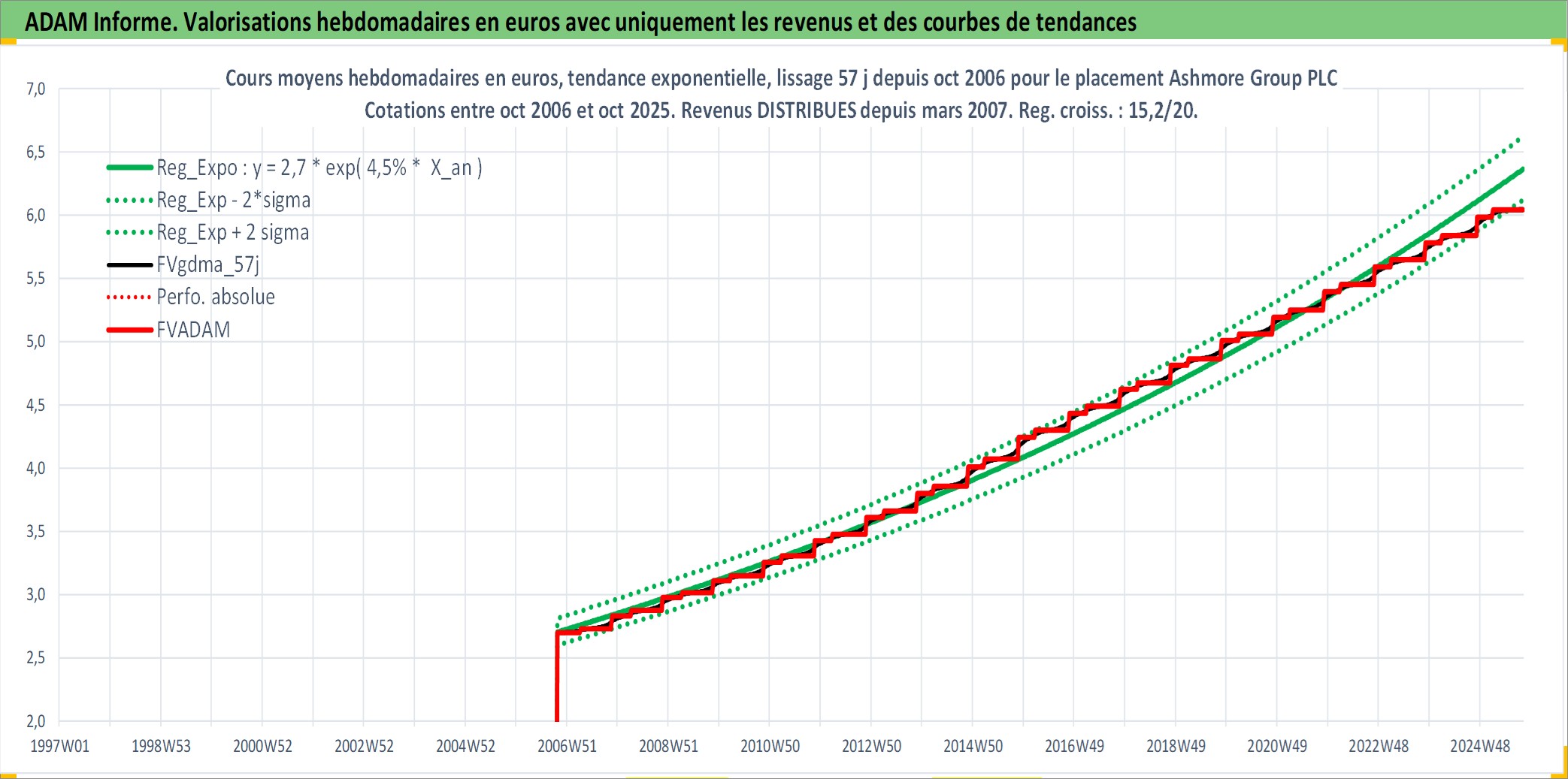 Site dédié aux investisseursPage dédiée sur site financeAnalyse des valorisations hebdomadaires de l'action Ashmore Group PLC. Cet actif est cote en GBX. Les valorisations sont en contrevaleur EURO et couvrent les semaines 2006W41 a 2025W40. Les revenus de cet actif financier sont pris en compte depuis la semaine 2007W13. La note ESG de cet actif n'est pas connue.