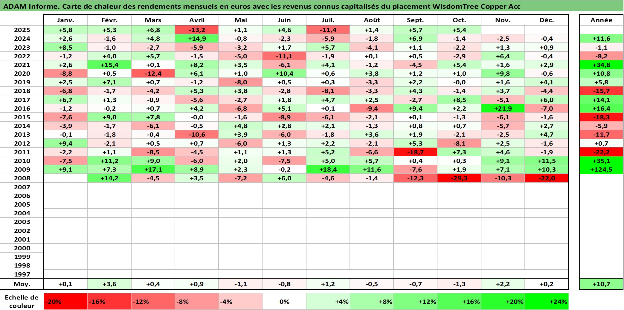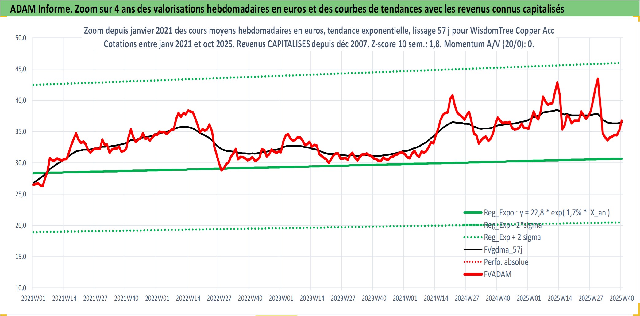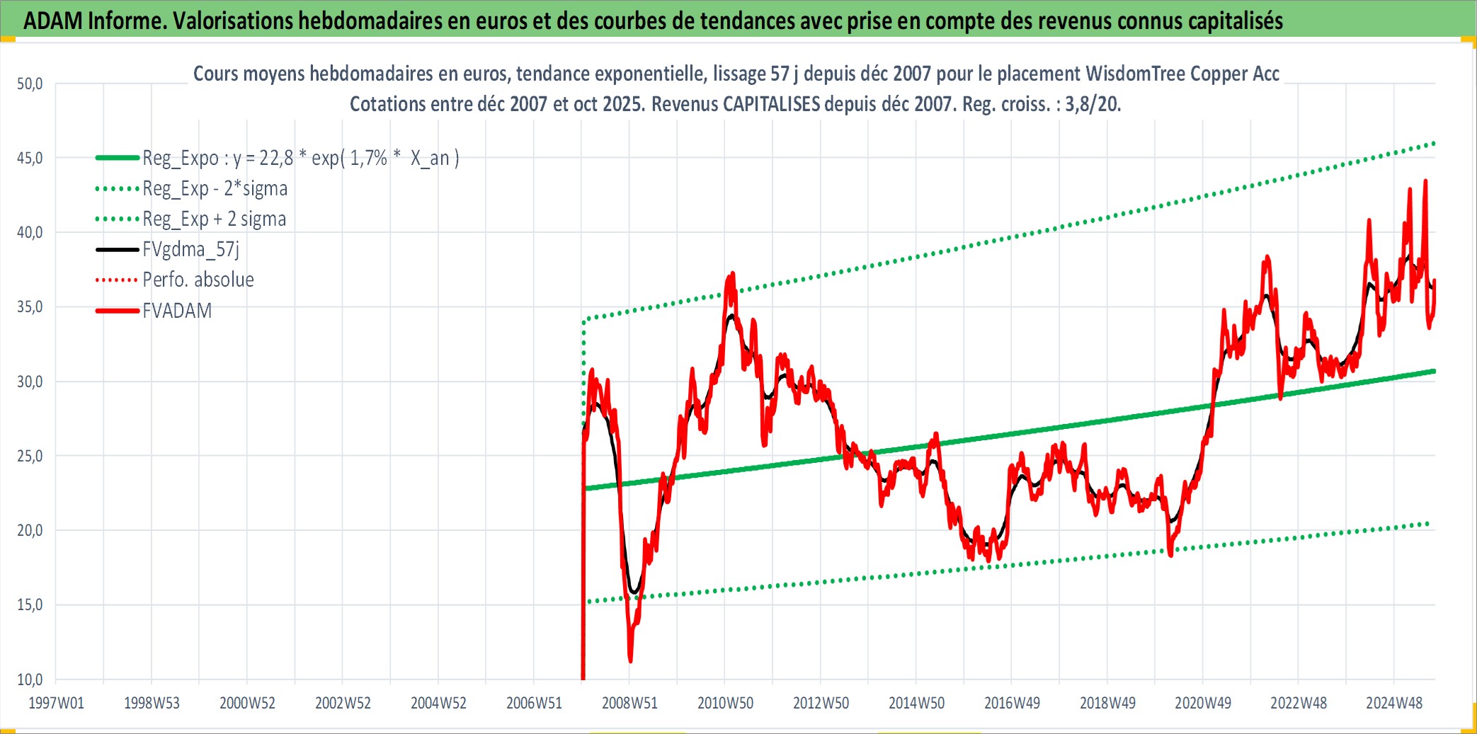 Site dédié aux investisseursPage dédiée sur site financeAnalyse des valorisations hebdomadaires du fonds WisdomTree Copper Acc. Cet actif est cote en USD. Les valorisations sont en contrevaleur EURO et couvrent les semaines 2008W01 a 2025W40. Les revenus de cet actif financier sont pris en compte depuis la semaine 2008W01. La note ESG de cet actif n'est pas connue.