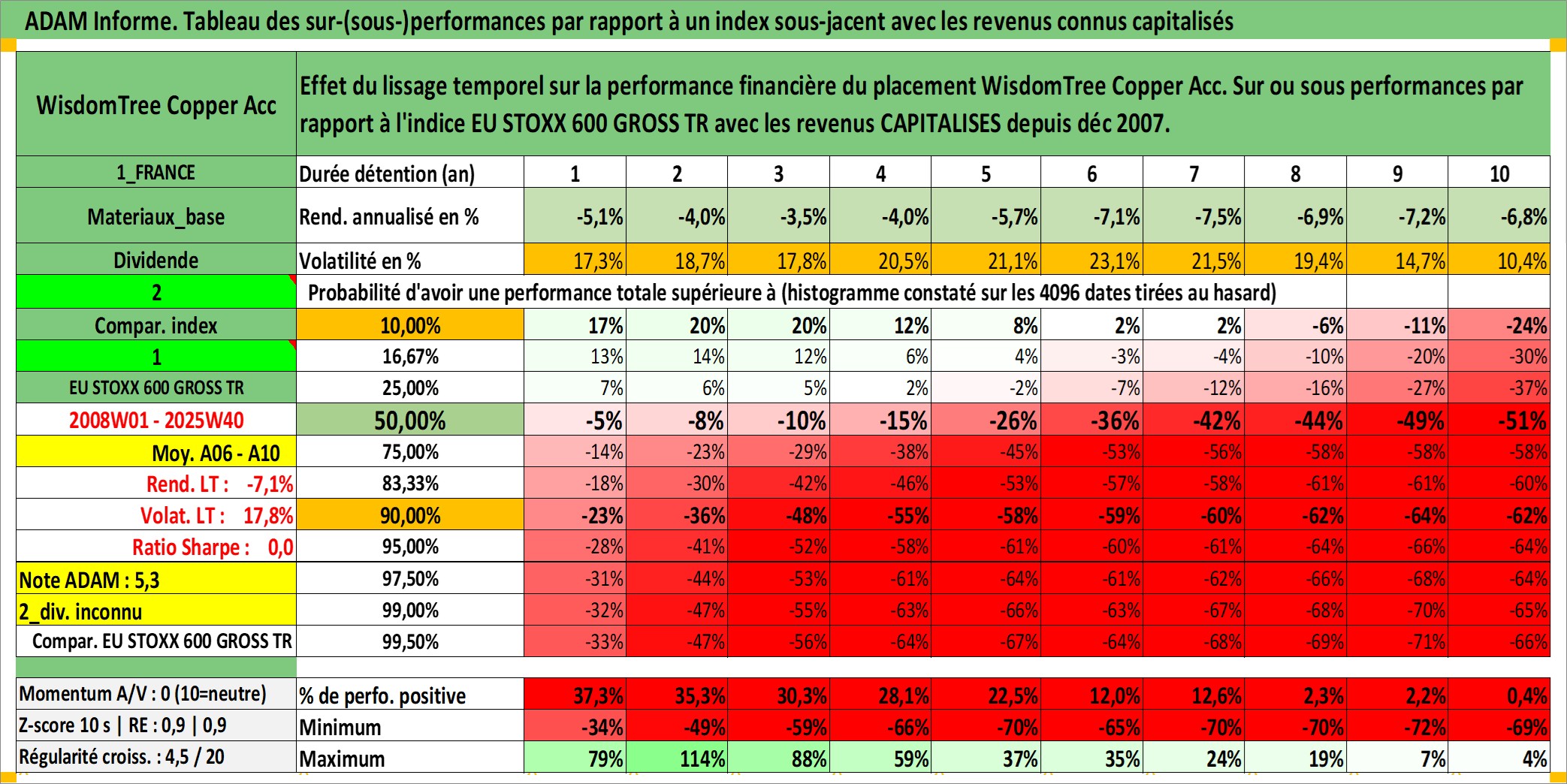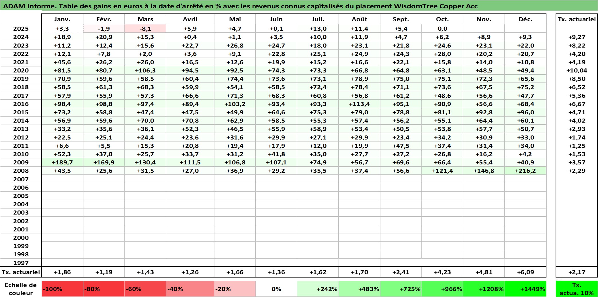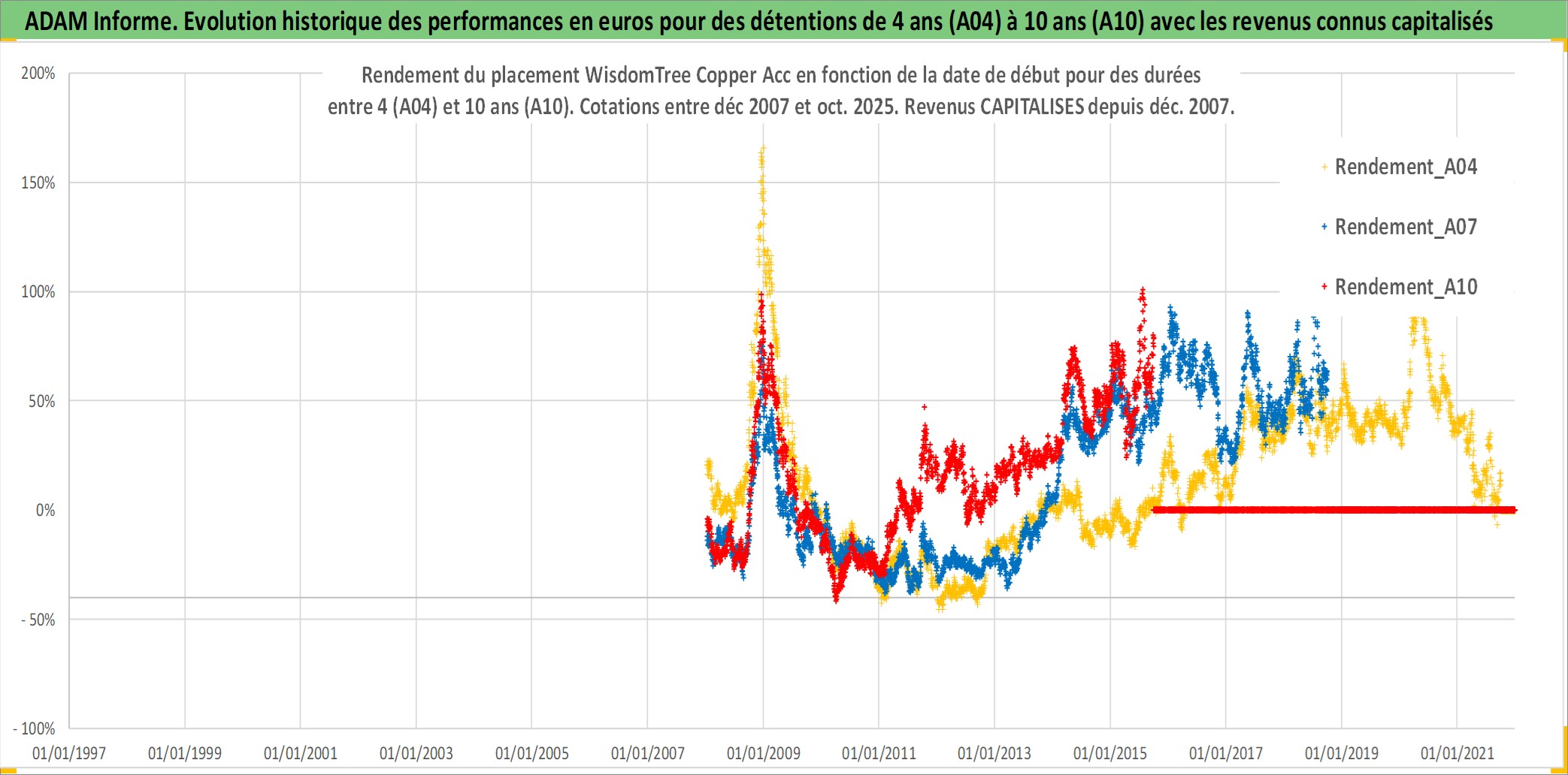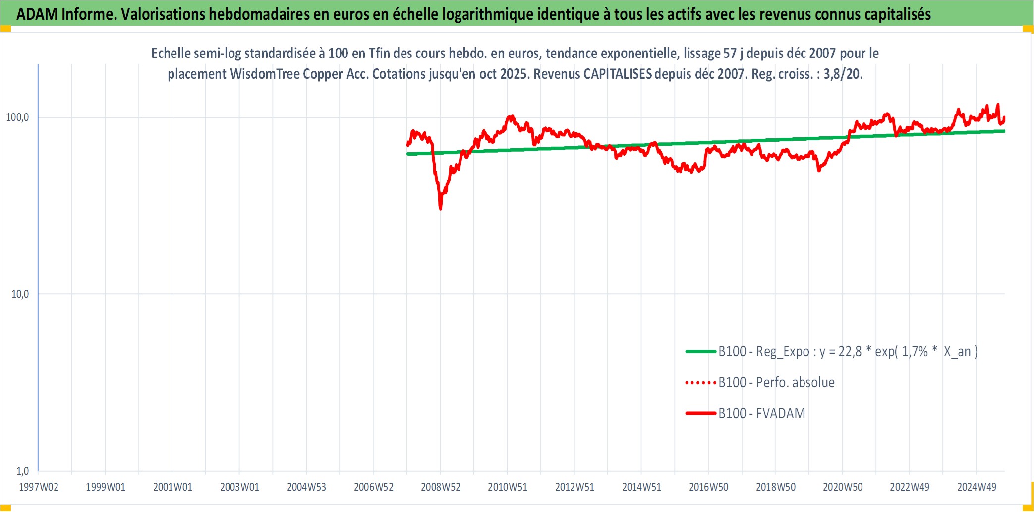 Site dédié aux investisseursPage dédiée sur site financeAnalyse des valorisations hebdomadaires du fonds WisdomTree Copper Acc. Cet actif est cote en USD. Les valorisations sont en contrevaleur EURO et couvrent les semaines 2008W01 a 2025W40. Les revenus de cet actif financier sont pris en compte depuis la semaine 2008W01. La note ESG de cet actif n'est pas connue.