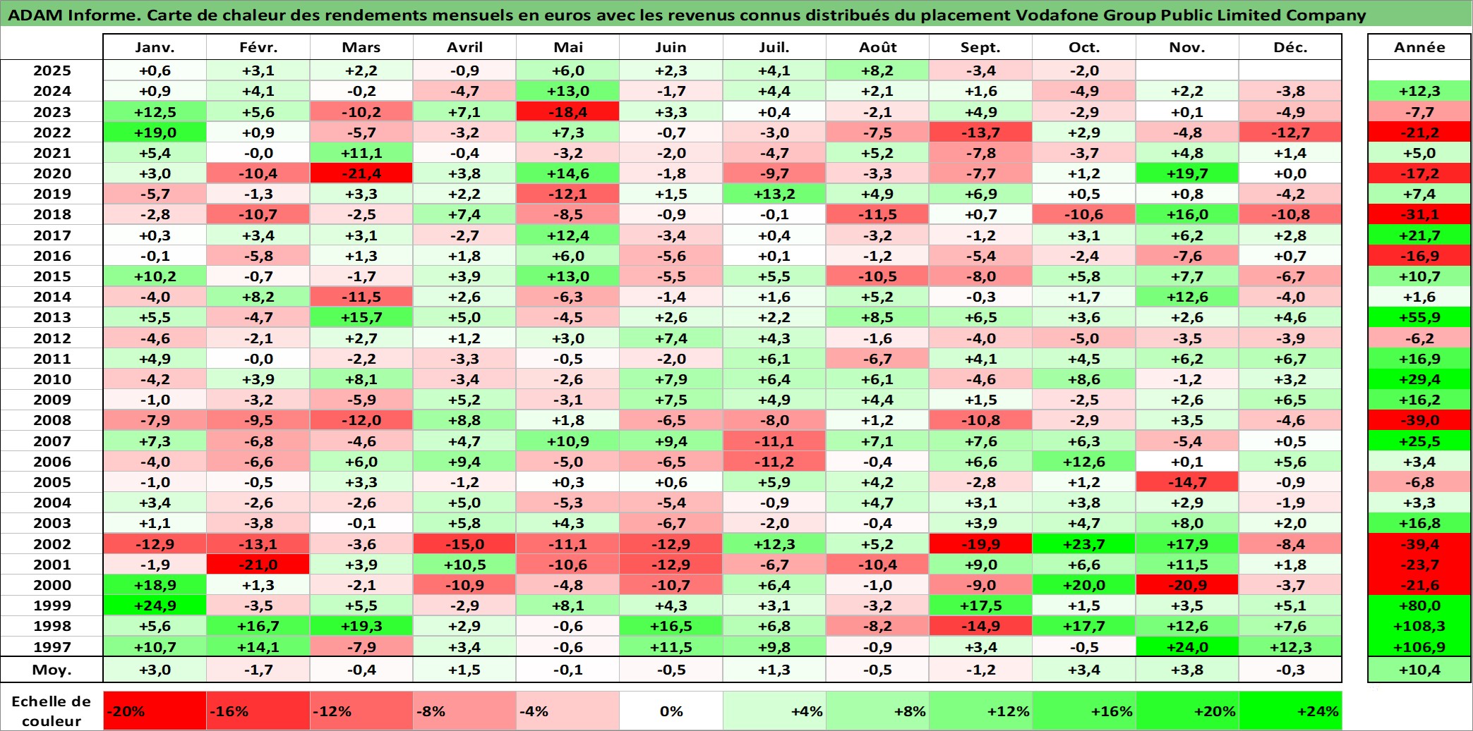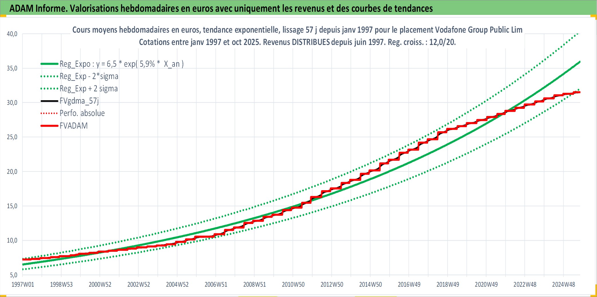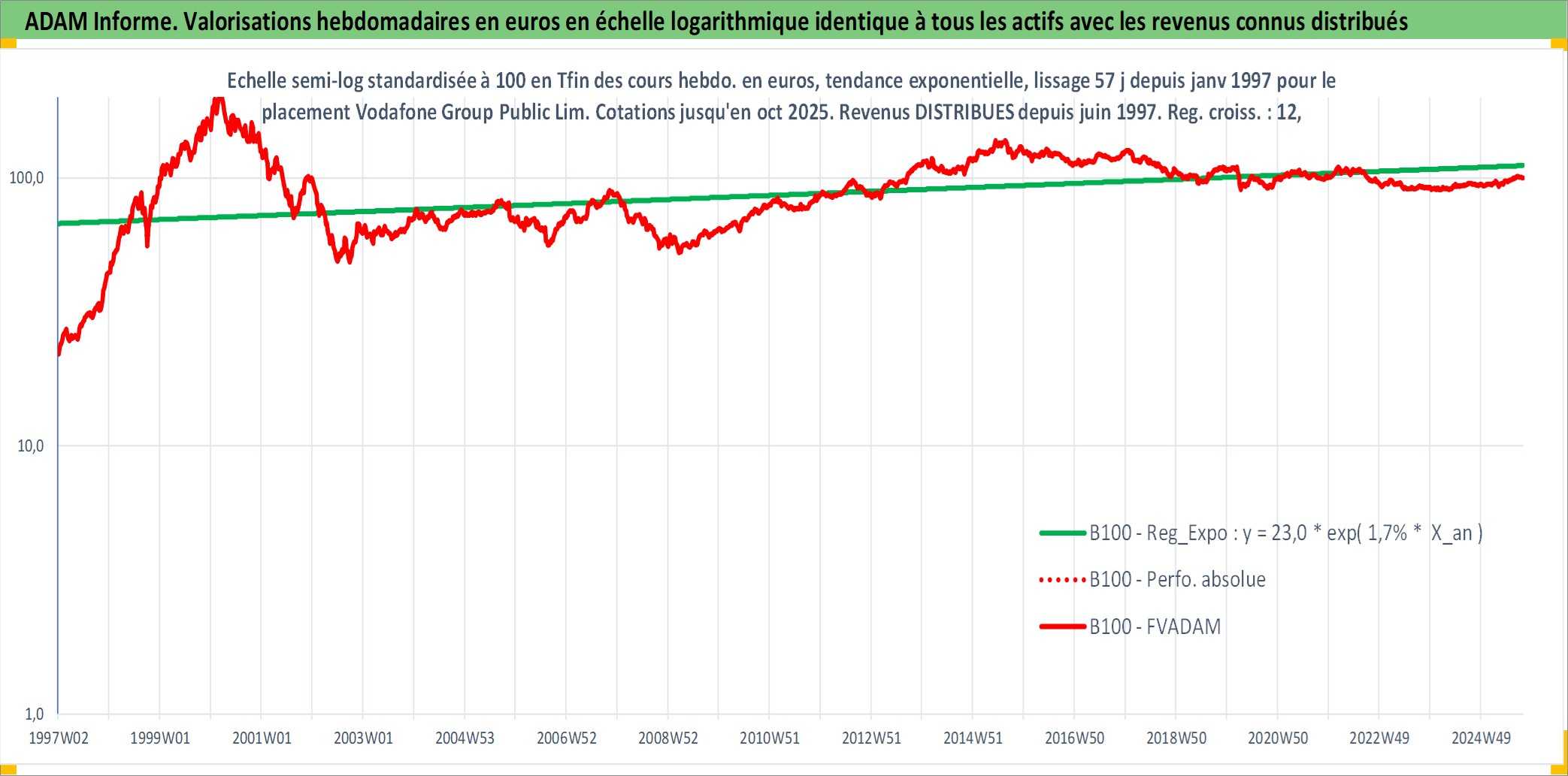 Site dédié aux investisseursPage dédiée sur site financeAnalyse des valorisations hebdomadaires de l'action Vodafone Group Public Limited Company. Cet actif est cote en USD. Les valorisations sont en contrevaleur EURO et couvrent les semaines 1997W01 a 2025W40. Les revenus de cet actif financier sont pris en compte depuis la semaine 1997W24. La note ESG de cet actif n'est pas connue.