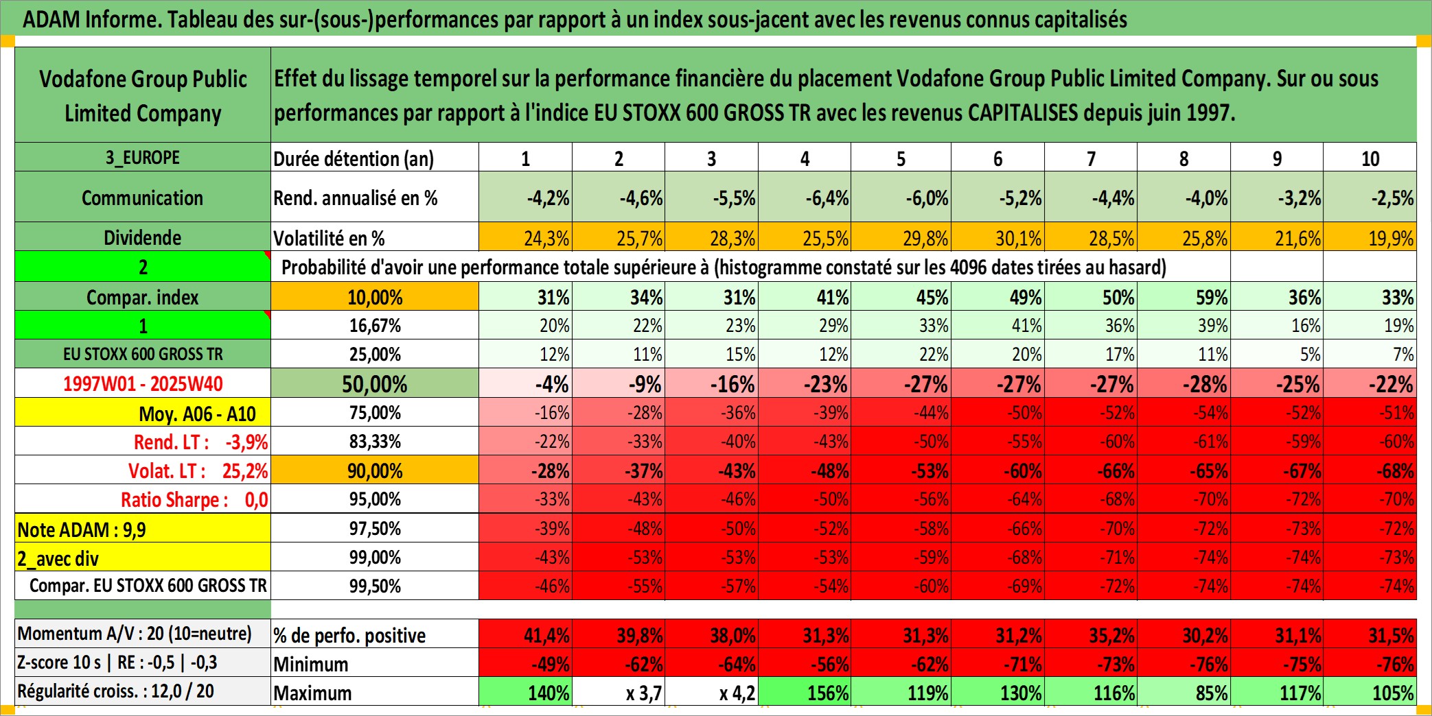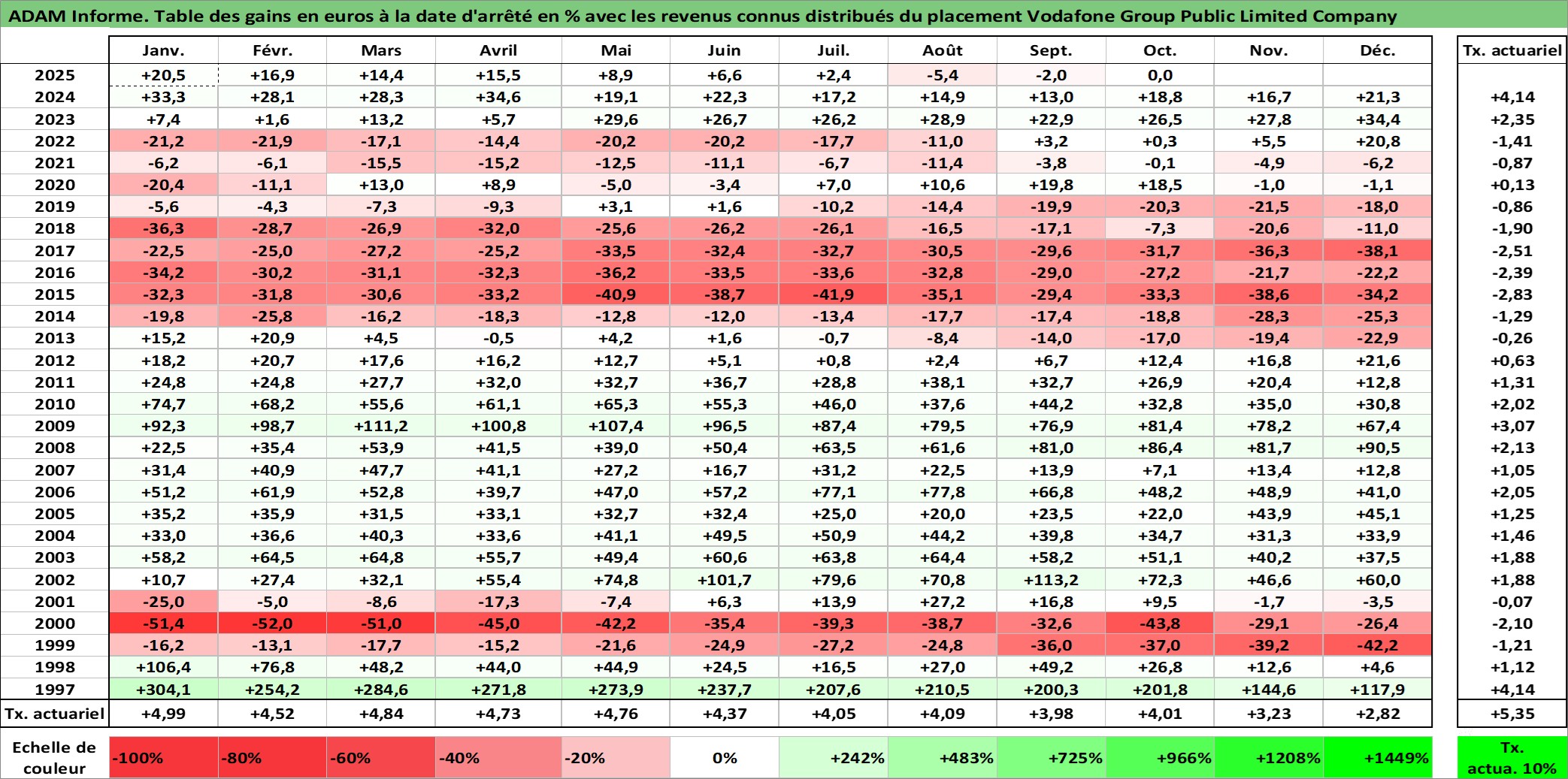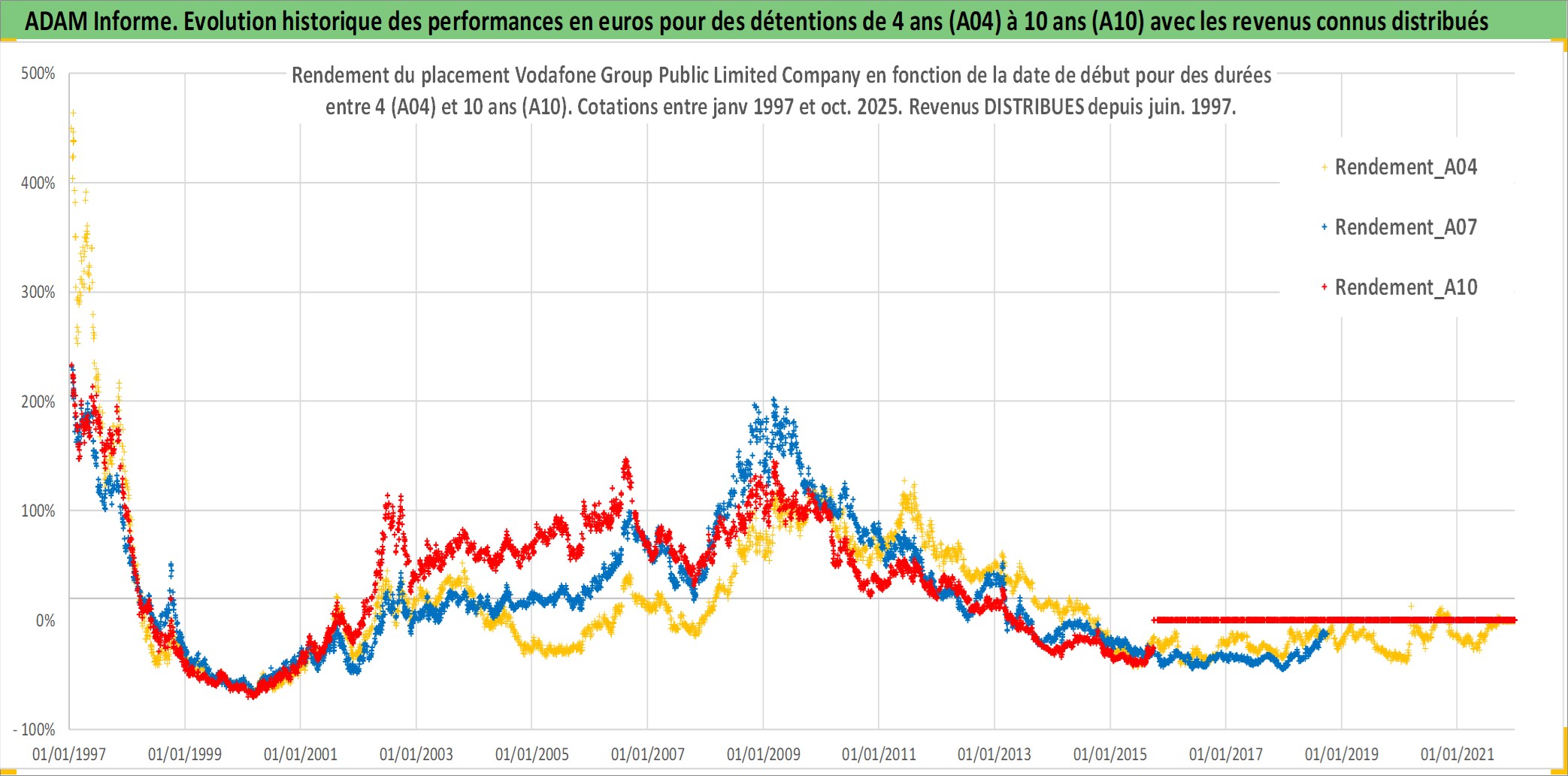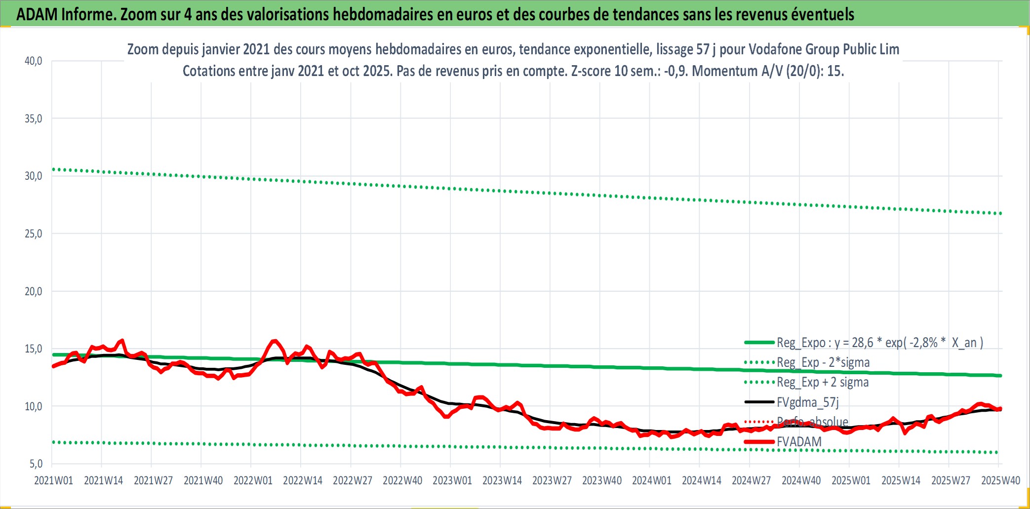 Site dédié aux investisseursPage dédiée sur site financeAnalyse des valorisations hebdomadaires de l'action Vodafone Group Public Limited Company. Cet actif est cote en USD. Les valorisations sont en contrevaleur EURO et couvrent les semaines 1997W01 a 2025W40. Les revenus de cet actif financier sont pris en compte depuis la semaine 1997W24. La note ESG de cet actif n'est pas connue.