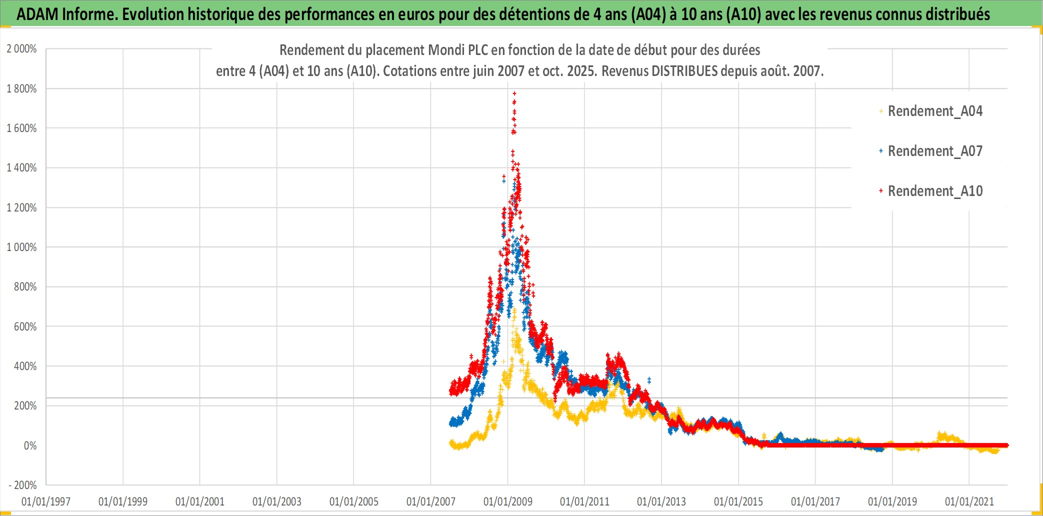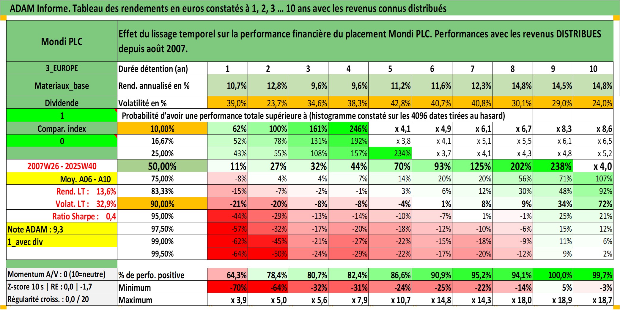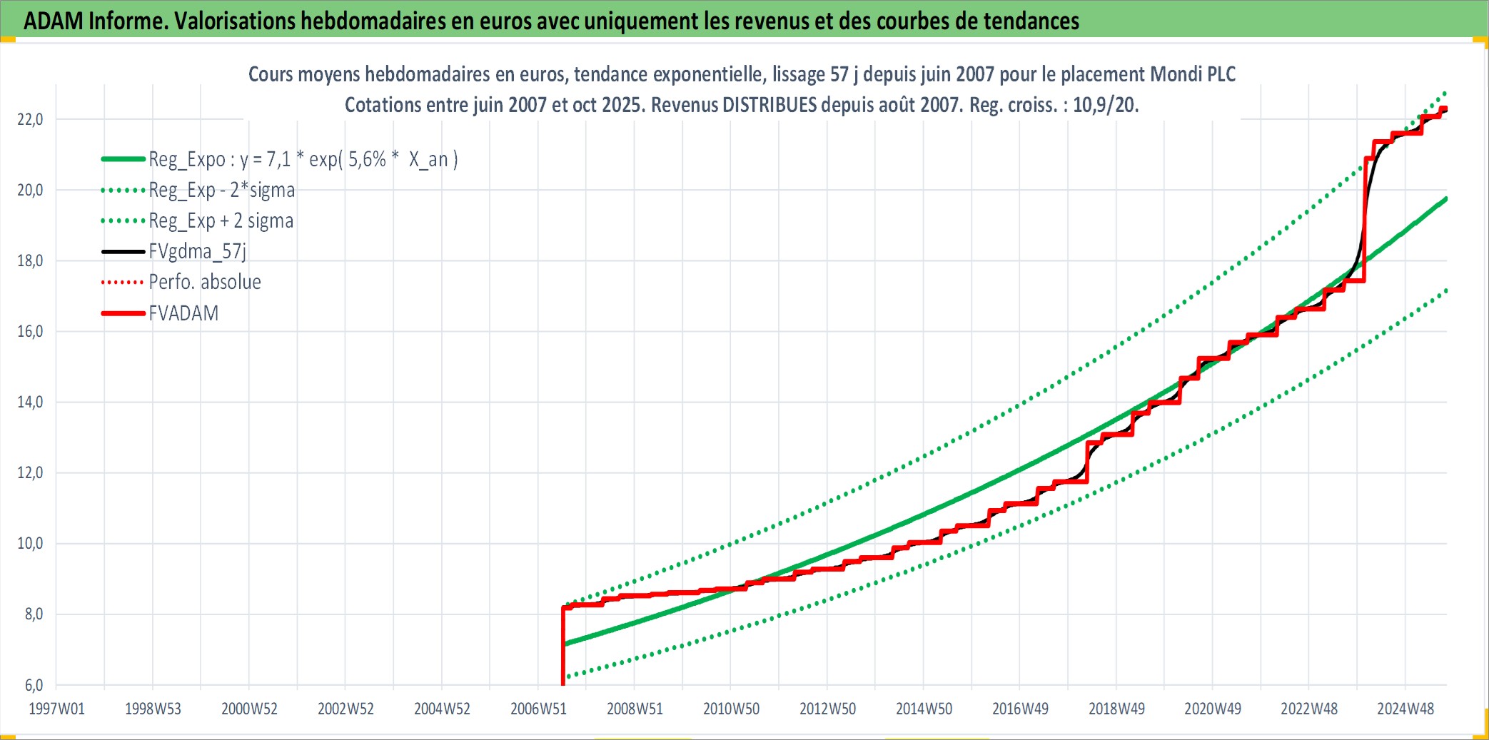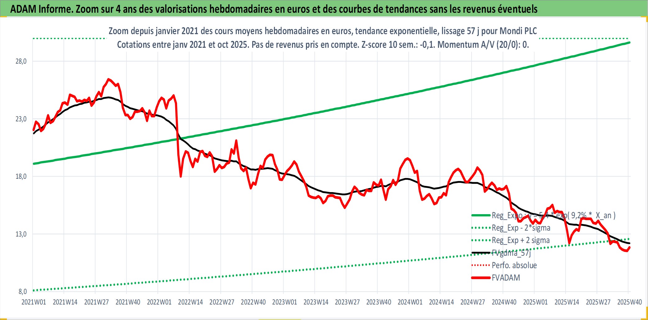 Site dédié aux investisseursPage dédiée sur site financeAnalyse des valorisations hebdomadaires de l'action Mondi PLC. Cet actif est cote en GBX. Les valorisations sont en contrevaleur EURO et couvrent les semaines 2007W26 a 2025W40. Les revenus de cet actif financier sont pris en compte depuis la semaine 2007W35. La note globale ESG de cet actif est estimee a 16.0 (apres rebasage entre 0 et 20).