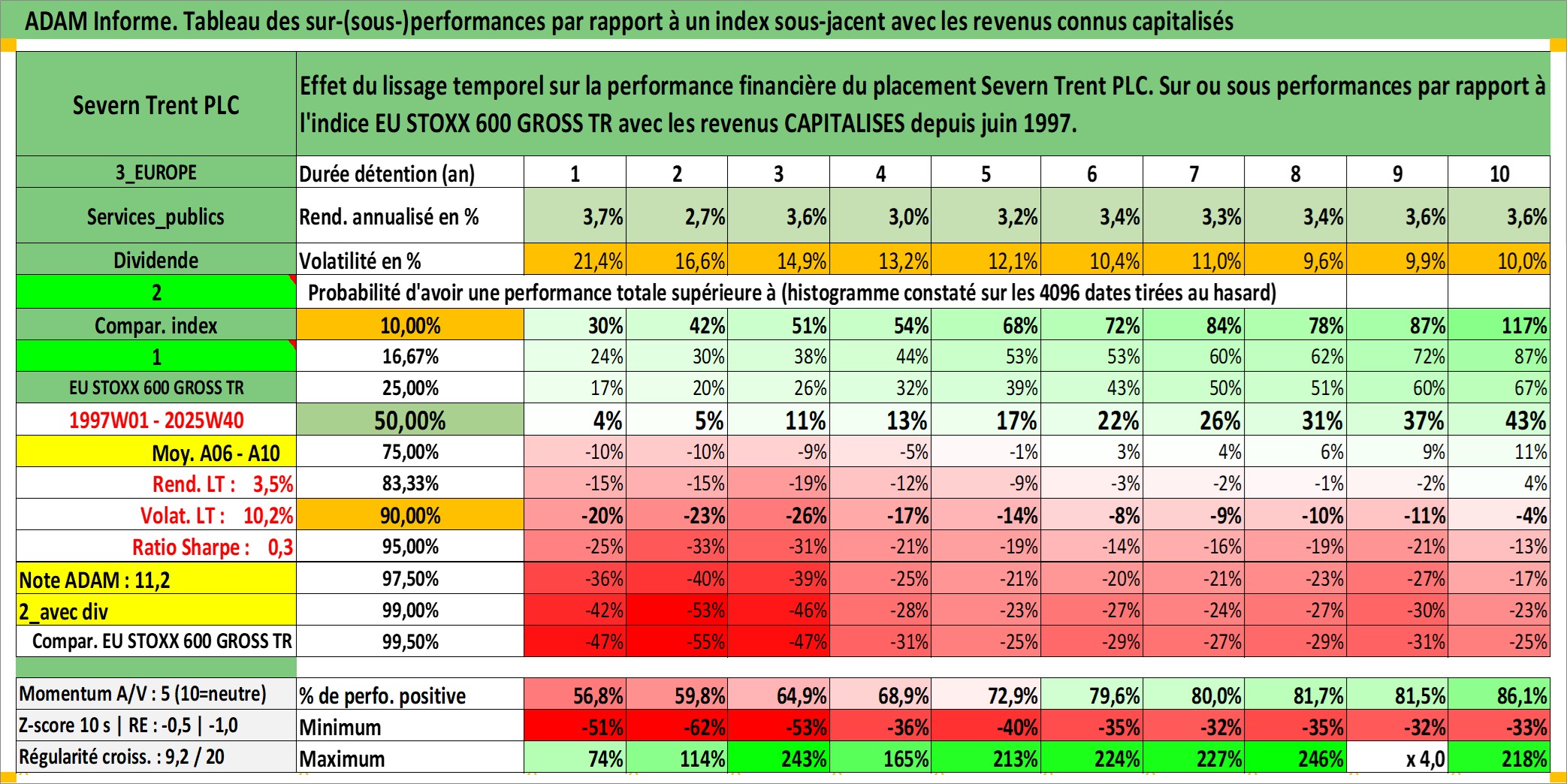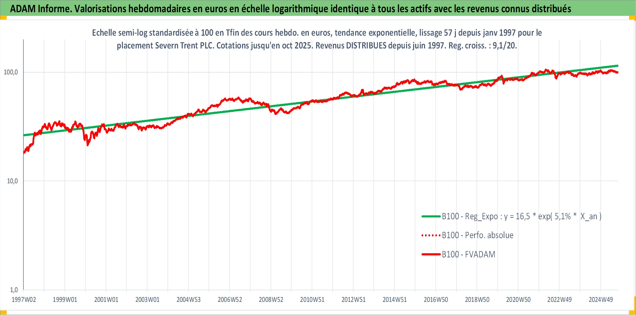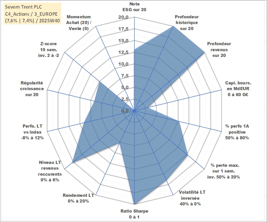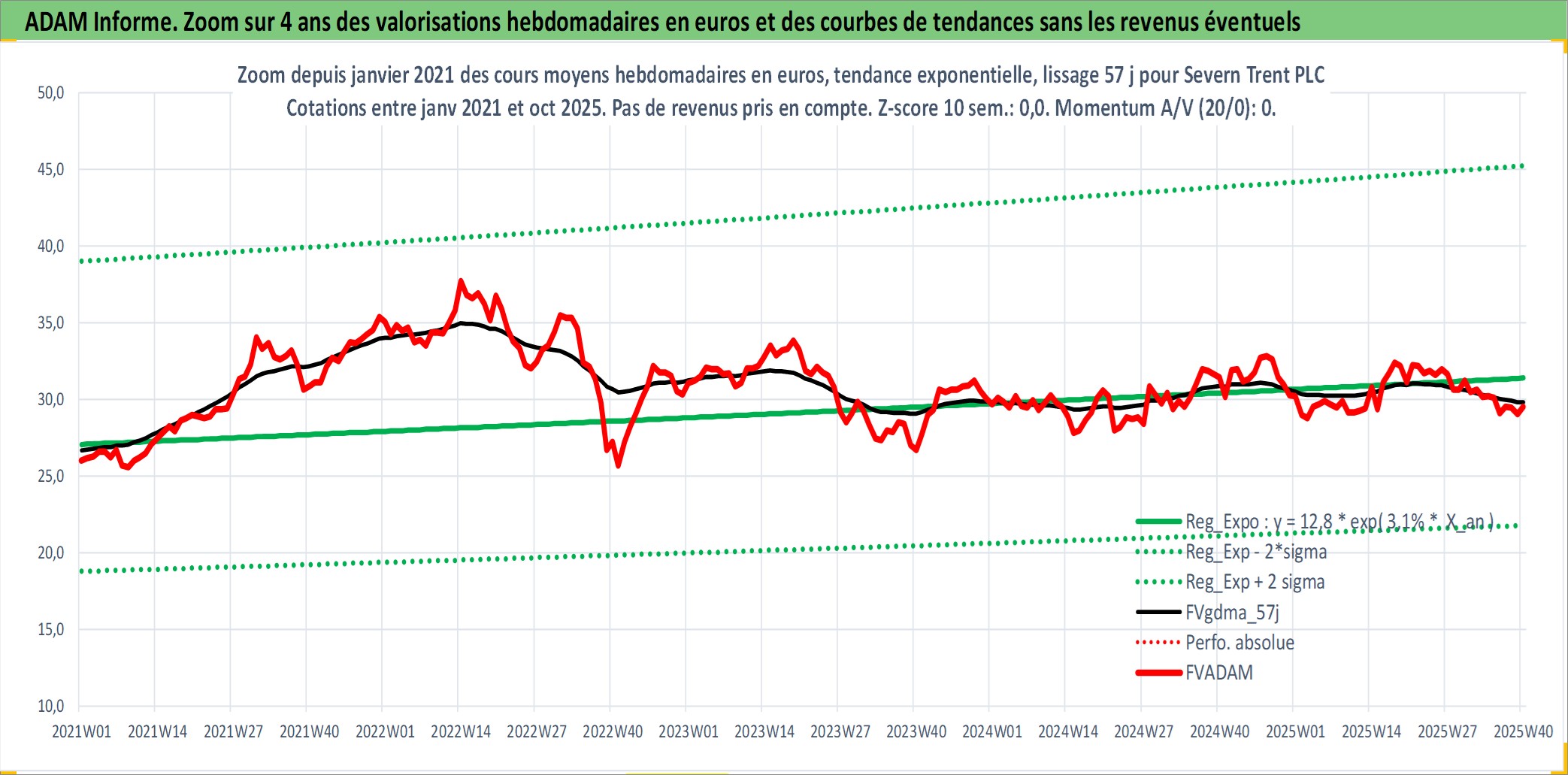 Site dédié aux investisseursPage dédiée sur site financeAnalyse des valorisations hebdomadaires de l'action Severn Trent PLC. Cet actif est cote en GBX. Les valorisations sont en contrevaleur EURO et couvrent les semaines 1997W01 a 2025W40. Les revenus de cet actif financier sont pris en compte depuis la semaine 1997W25. La note globale ESG de cet actif est estimee a 13.0 (apres rebasage entre 0 et 20).