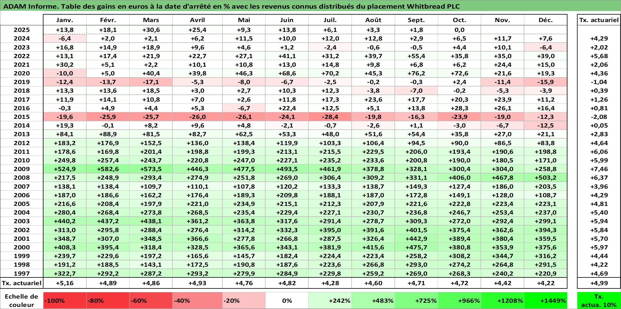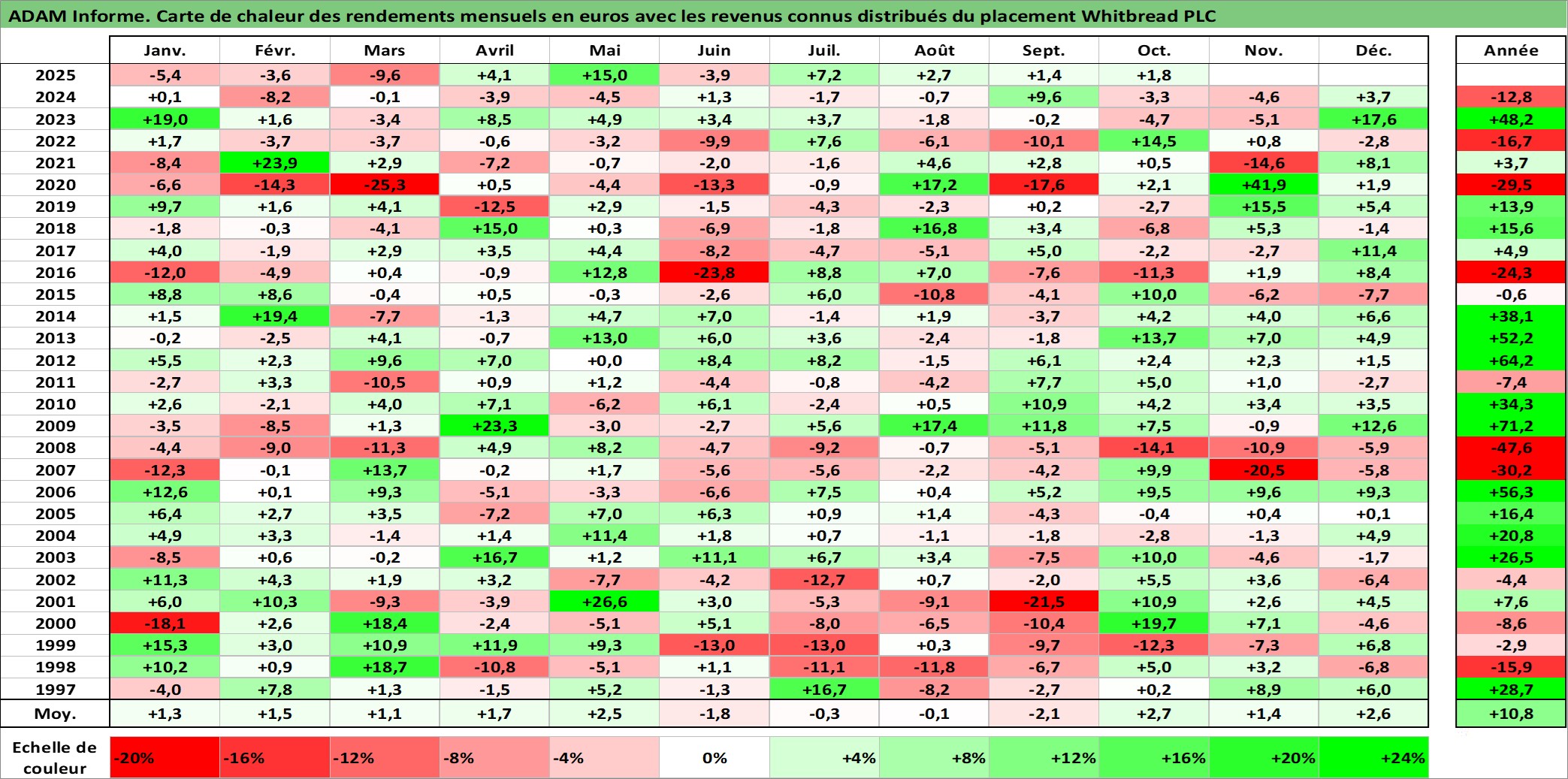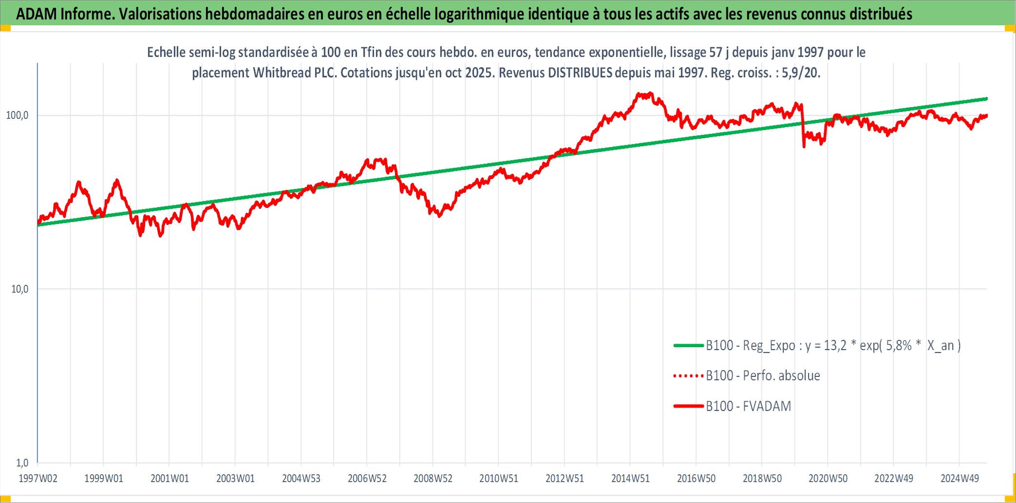 Site dédié aux investisseursPage dédiée sur site financeAnalyse des valorisations hebdomadaires de l'action Whitbread PLC. Cet actif est cote en GBX. Les valorisations sont en contrevaleur EURO et couvrent les semaines 1997W01 a 2025W40. Les revenus de cet actif financier sont pris en compte depuis la semaine 1997W21. La note globale ESG de cet actif est estimee a 10.0 (apres rebasage entre 0 et 20).