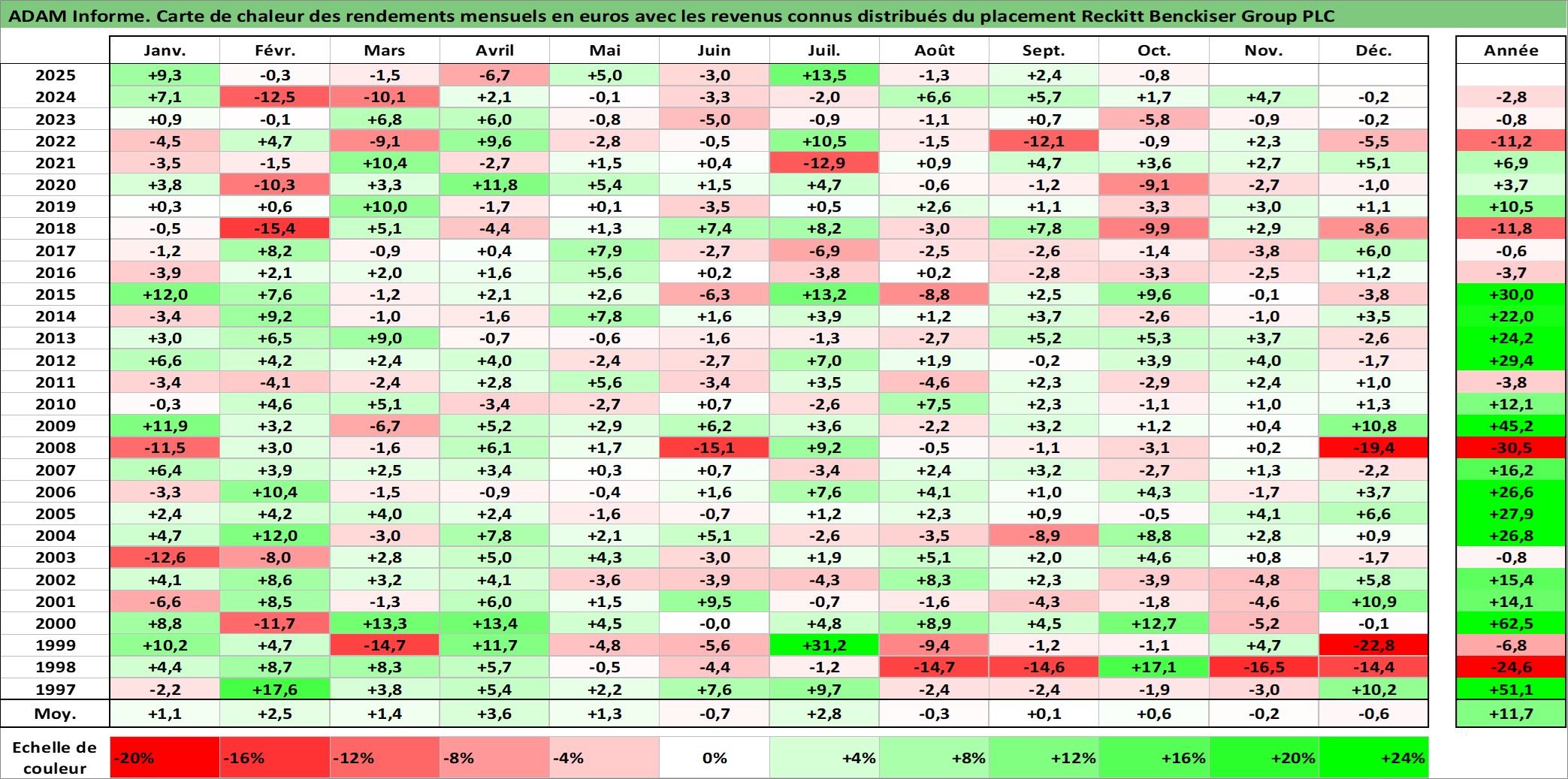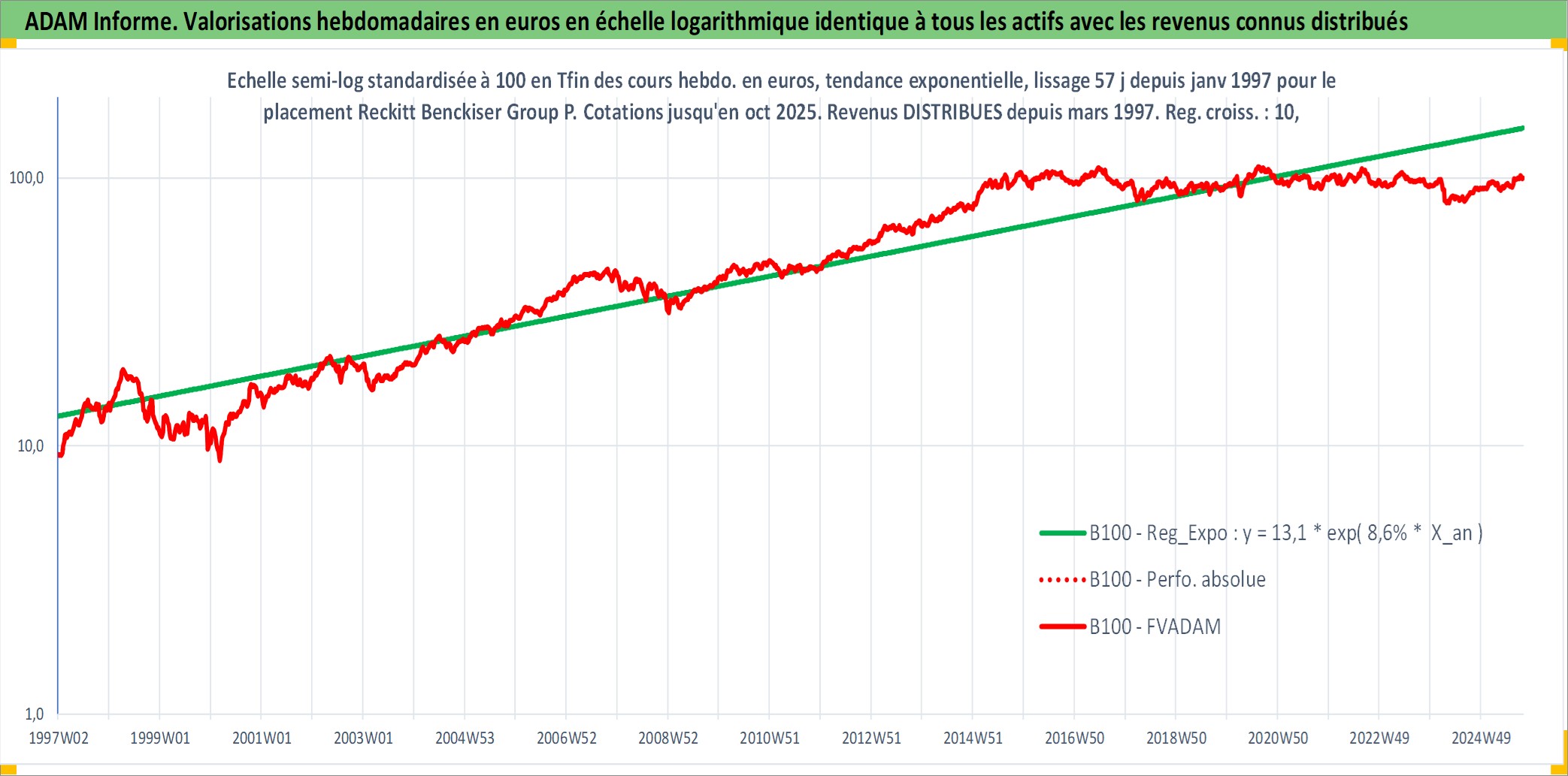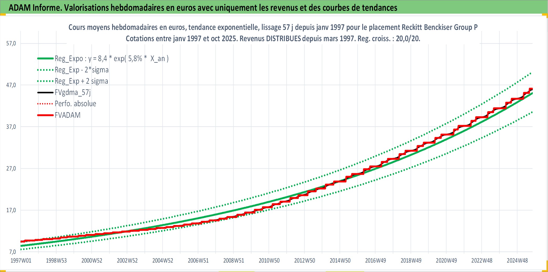Site dédié aux investisseursPage dédiée sur site financeAnalyse des valorisations hebdomadaires de l'action Reckitt Benckiser Group PLC. Cet actif est cote en GBX. Les valorisations sont en contrevaleur EURO et couvrent les semaines 1997W01 a 2025W40. Les revenus de cet actif financier sont pris en compte depuis la semaine 1997W13. La note globale ESG de cet actif est estimee a 9.0 (apres rebasage entre 0 et 20).