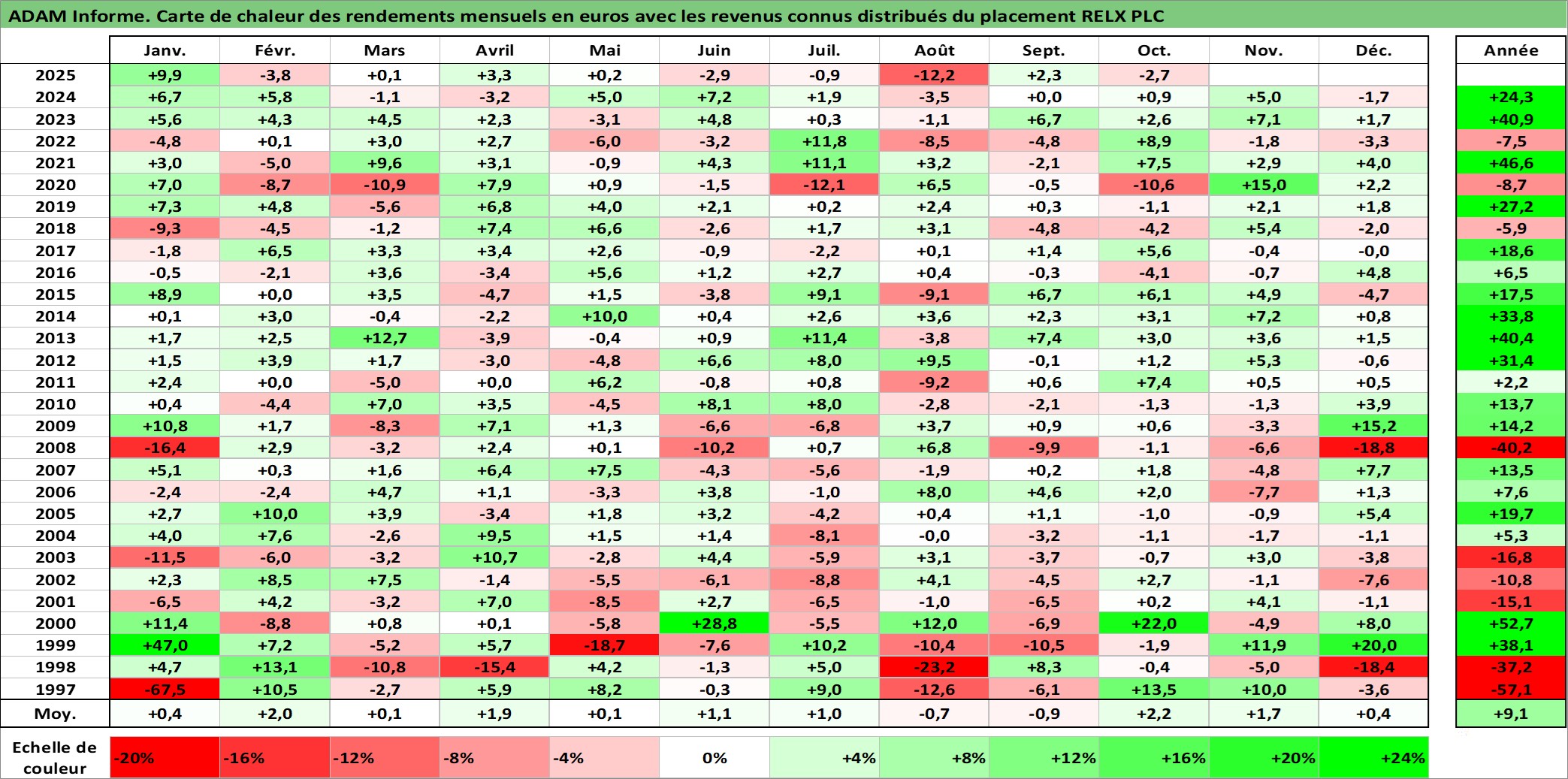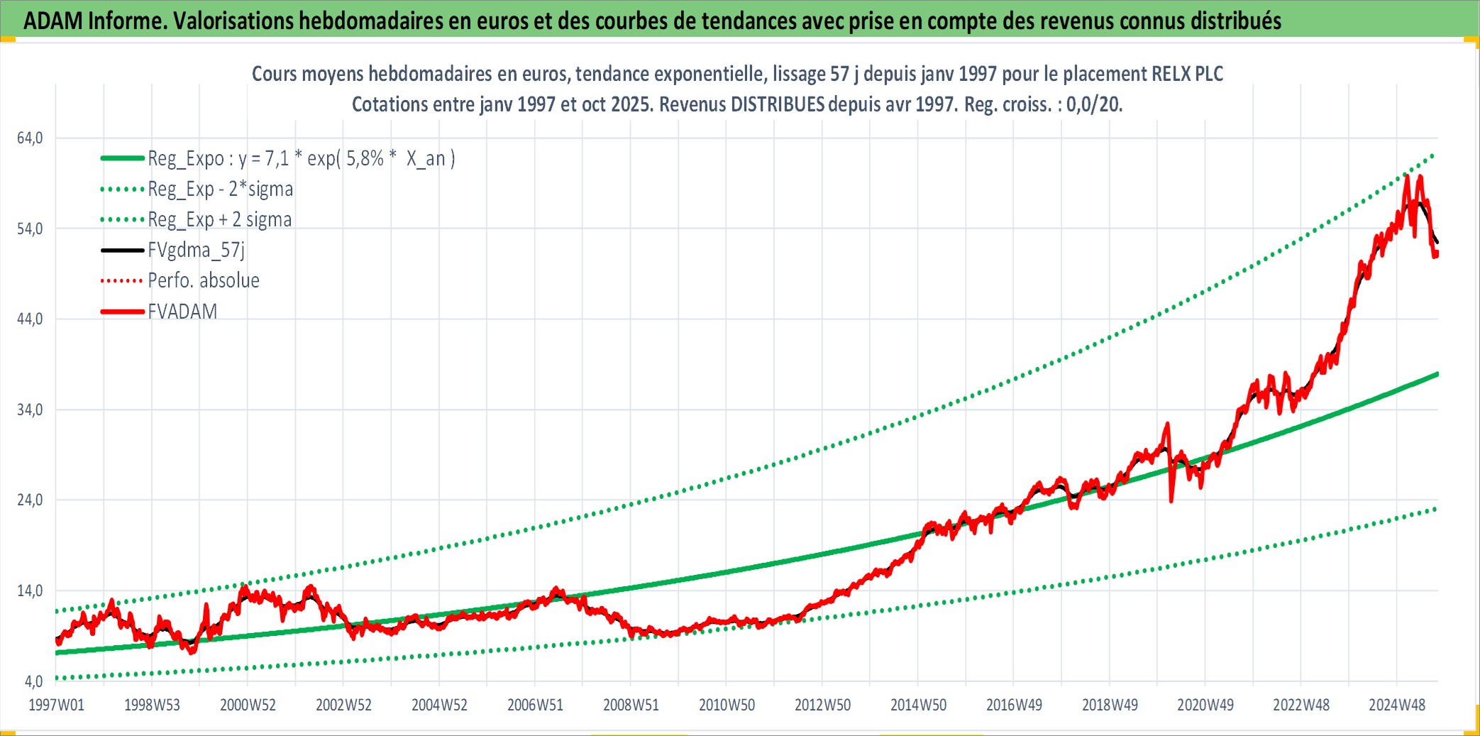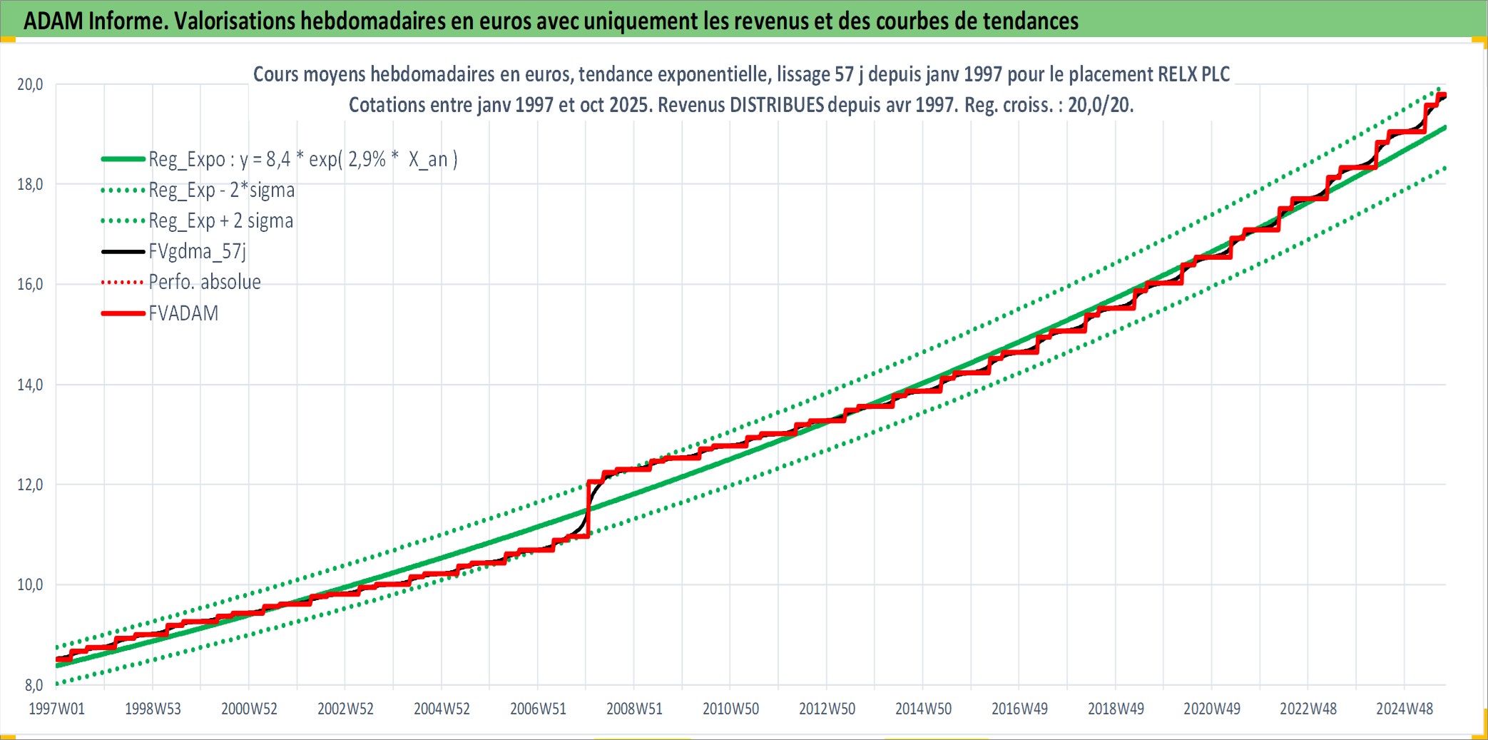 Site dédié aux investisseursPage dédiée sur site financeAnalyse des valorisations hebdomadaires de l'action RELX PLC. Cet actif est cote en GBX. Les valorisations sont en contrevaleur EURO et couvrent les semaines 1997W01 a 2025W40. Les revenus de cet actif financier sont pris en compte depuis la semaine 1997W17. La note globale ESG de cet actif est estimee a 20.0 (apres rebasage entre 0 et 20).