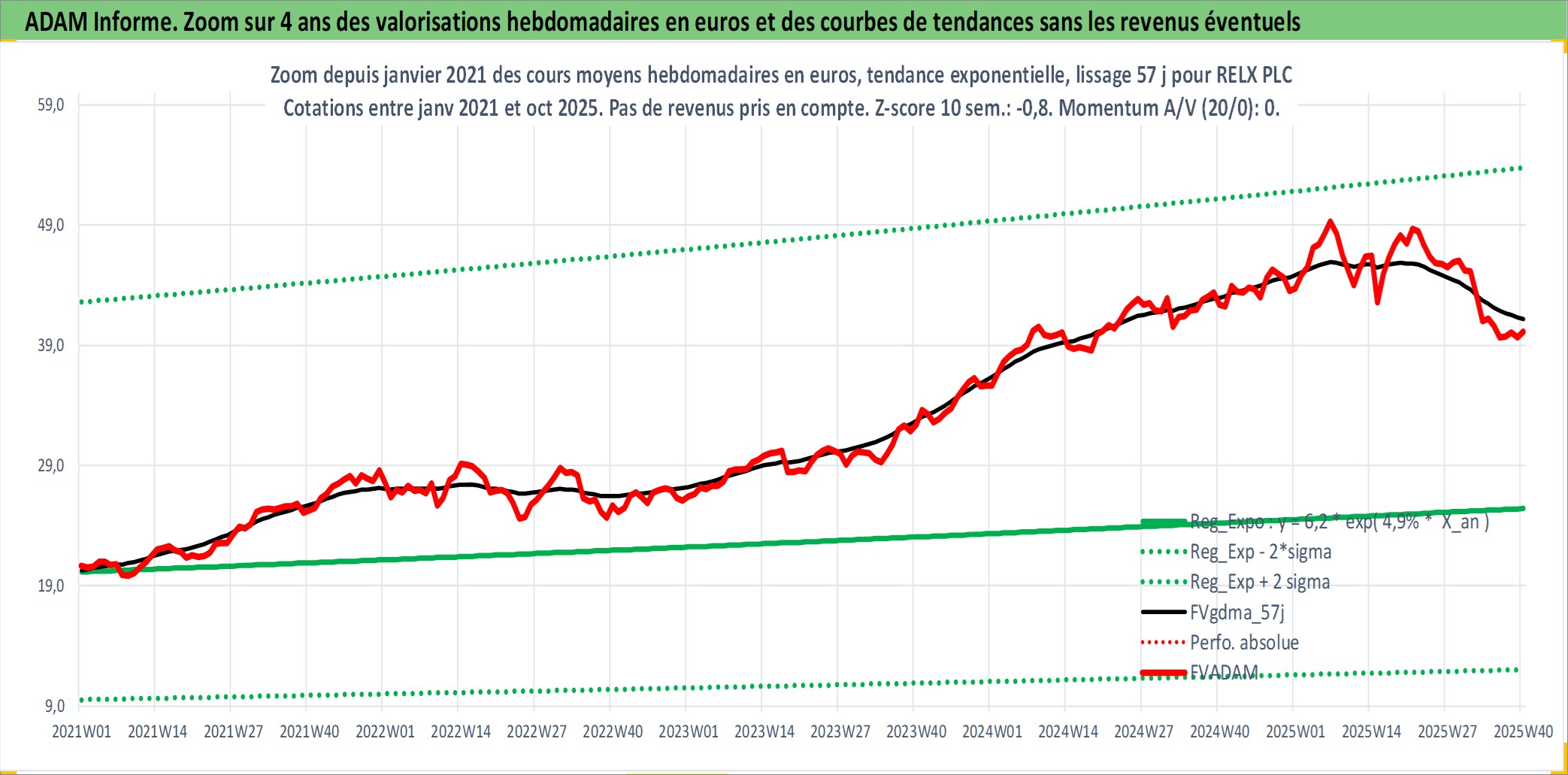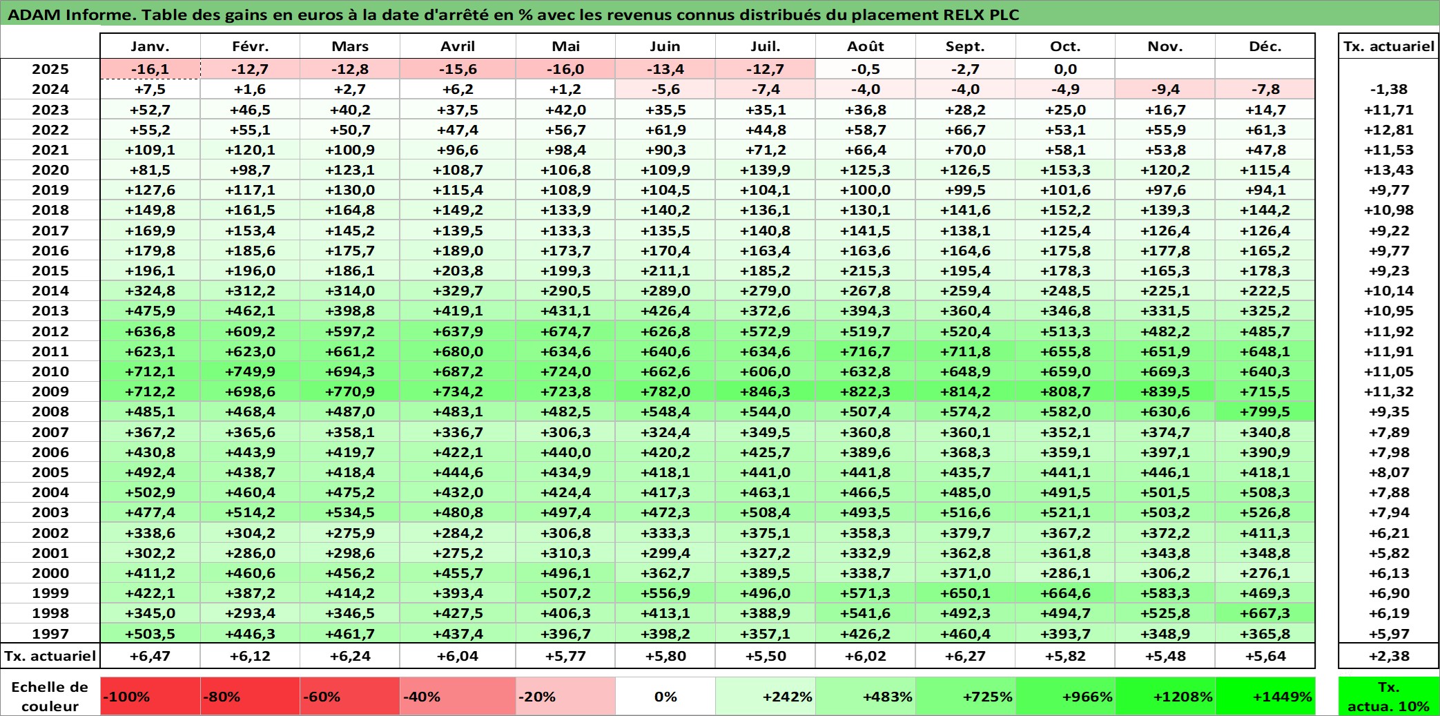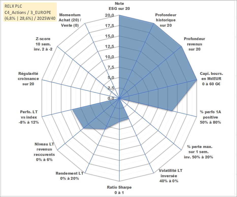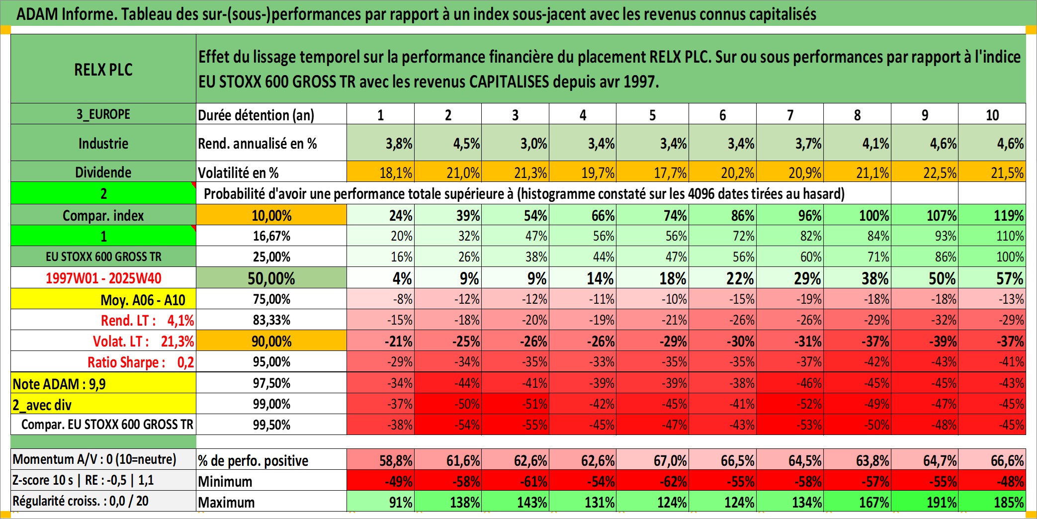 Site dédié aux investisseursPage dédiée sur site financeAnalyse des valorisations hebdomadaires de l'action RELX PLC. Cet actif est cote en GBX. Les valorisations sont en contrevaleur EURO et couvrent les semaines 1997W01 a 2025W40. Les revenus de cet actif financier sont pris en compte depuis la semaine 1997W17. La note globale ESG de cet actif est estimee a 20.0 (apres rebasage entre 0 et 20).